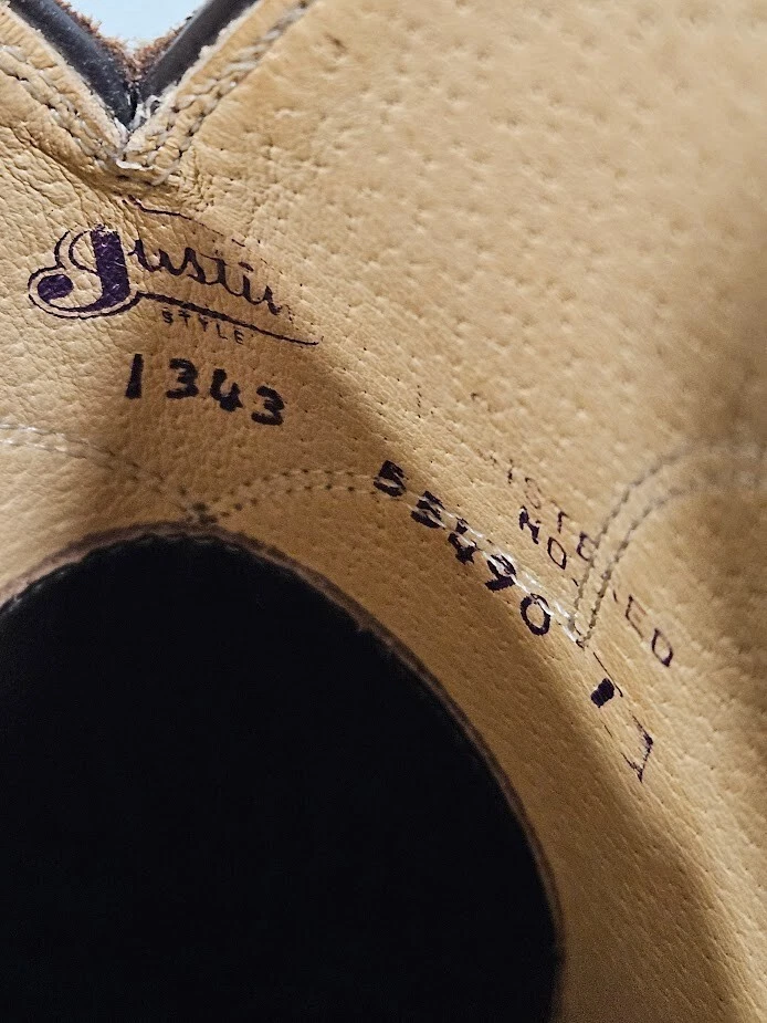 Justin Boots 1343 Western boots. Made with high-quality leather, these boots feature a solid brown pattern, round toe, and a mid-calf shaft style. Embroidered accents add a touch of cowboy charm to these versatile boots, size 9 1/2 E Justin Boots 1343 product line. Ships from a smoke free home! Please see all photos for exact item condition. Thank you for checking out my store! All items are shipped within 1 or 2 business days. Make a bundle to save on shipping cost.