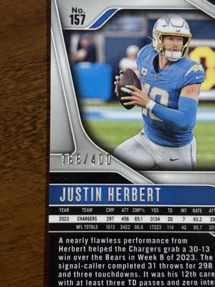 Print Run:400Team:Los Angeles ChargersLeague:National Football League (NFL)Sport:FootballFeatures:Exclusive, Parallel/Variety, Serial Numbered, Short PrintType:Sports Trading CardSeason:2024Set:2024 Panini PrizmParallel/Variety:Pandora PrizmPlayer/Athlete:Justin HerbertCard Number:157Manufacturer:Panini
