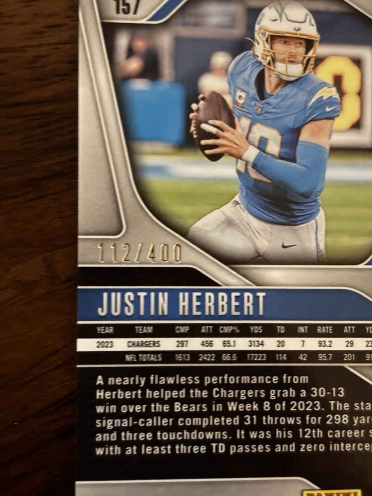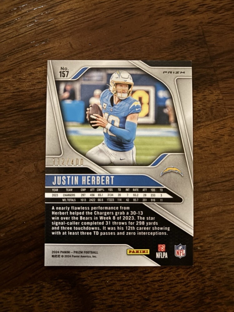 Season:2024League:National Football League (NFL)Features:Exclusive, Parallel/Variety, Serial Numbered, Short PrintType:Sports Trading CardSet:2024 Panini PrizmPlayer/Athlete:Justin HerbertManufacturer:PaniniSport:FootballPrint Run:400Team:Los Angeles ChargersCard Number:157Parallel/Variety:Pandora Prizm