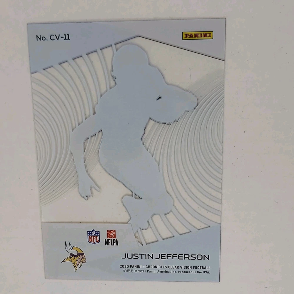 Elevate your sports card collection with the Justin Jefferson 2020 Panini Chronicles - Clear Vision Rookies #CV-11. As a standout addition, this card showcases the Minnesota Vikings' dynamic receiver in his rookie season, capturing the essence of his promising career in the National Football League. The card's clear acetate design provides a premium feel, making it a standout piece for enthusiasts and fans alike. Crafted by Panini, a trusted name in sports memorabilia, this card belongs to the esteemed 2020 Panini Chronicles set and is a part of the exclusive Clear Vision Rookies insert. It is not autographed, allowing Jefferson's action shot to take center stage. With its pristine presentation and significant rookie status, it holds a special place in any football card collection.