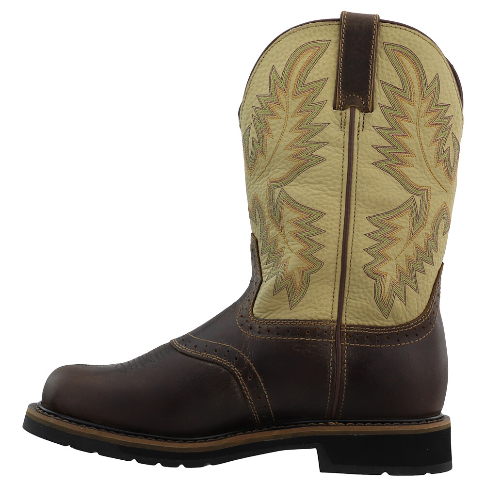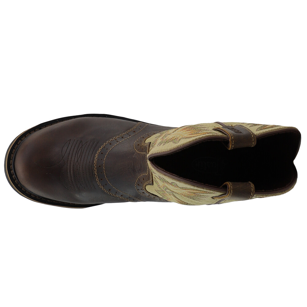 Superintendent 11 inch Electrical Soft Toe Work Boots SE4660 Product Details Leather upper Pull on entry Electrical Hazard J-Flex Flexible Comfort System Stampede rubber and Ethylene-vinyl acetate combination outsole The Superintendent is an 11-inch tall men's work boot that effortlessly combines style and function. The saddle foot sports a round toe and the J-Flex Flexible Comfort System insole adds cushion and support. This boot features the Stampede rubber and Ethylene-vinyl acetate combination outsole with resistance to abrasion, chips, slipping, and marking which allows you to comfortably work on any surface. Additional Details Color: Brown Occasion: Work/Duty Gender: Mens Age: Adult Brand: Justin Original Workboots