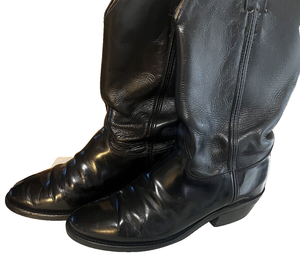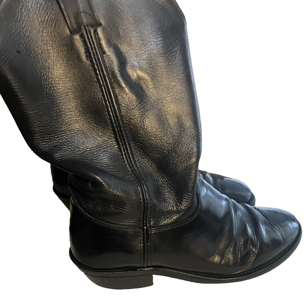 Men's black leather Justin Roper Western Boots in size 10 3E. These mid-calf boots feature a pull-on style with a solid pattern and a cowboy theme. Made of leather with a leather lining, they have a Western style suitable for cowboy enthusiasts. The outsole and insole are also made of leather, providing quality and comfort for the wearer.