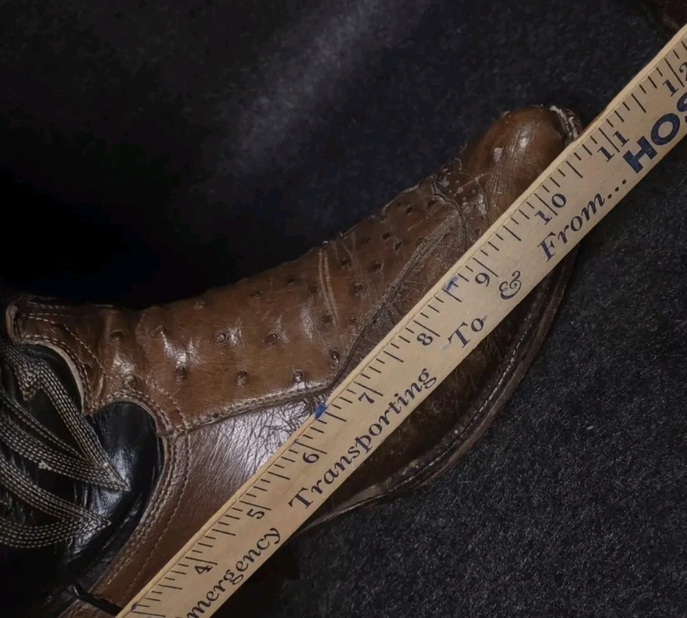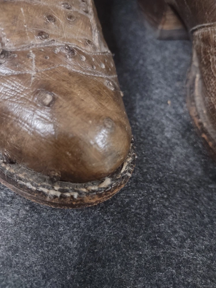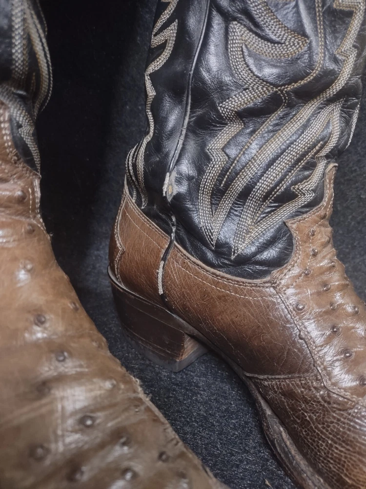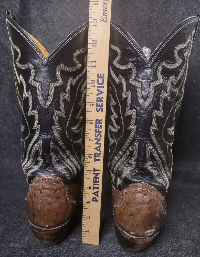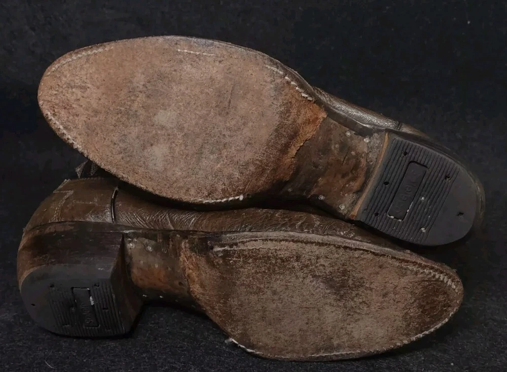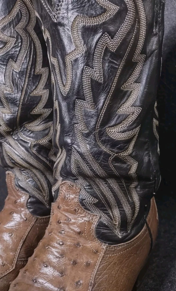 My grandpa bought these in the 80's and resoled them 3 times because he loved them so much. They really don't make them like this anymore and while they're not in pristine condition, they have more character than any brand new pair could aspire to have. Flaws are pictured of course These Justin Boots are a rare find for any cowboy or Western enthusiast. Made from high-quality full quill leather, these boots feature a pointed toe and a mid-calf shaft style. The pull-on closure and wingtip design add to the overall unique look of these boots. With a two-toned abstract pattern and embroidered accents, these boots are perfect for any occasion, from casual outings to formal events. The lightweight design and comfortable fit make them ideal for all-day wear. Don't miss your chance to own a piece of Western history with these vintage Justin Boots.