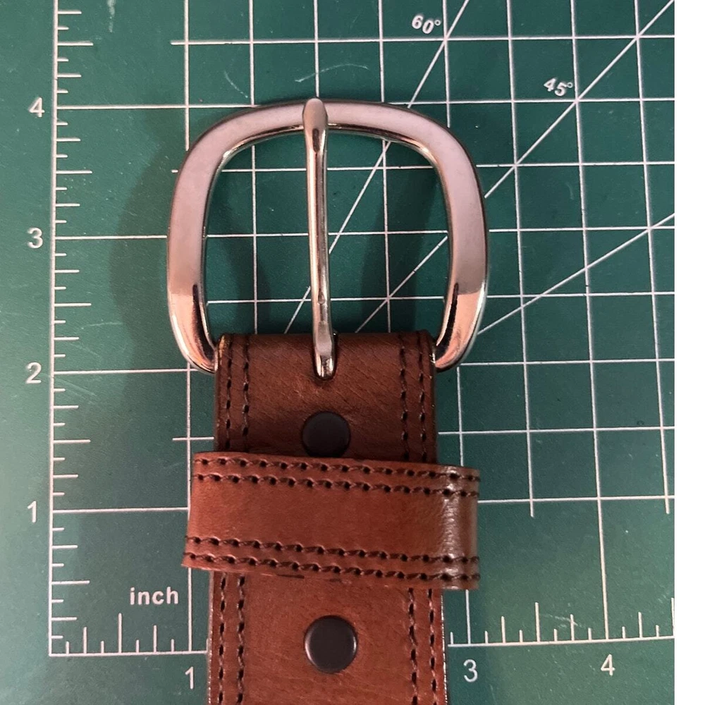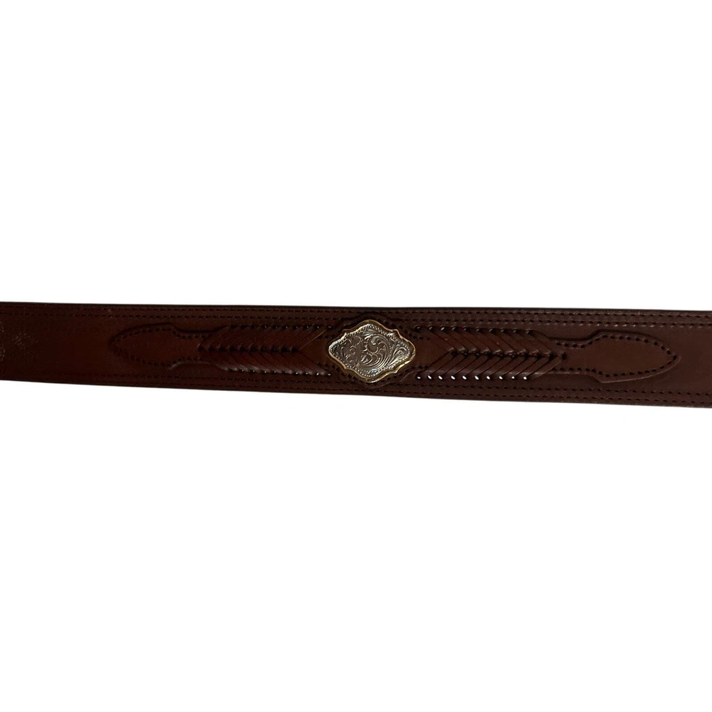 Preowned Justin's Tan Tooled leather Belt with silver plated accents Size 36 Intricate designs carved into the leather. Conchos: Decorative metal studs. Silver-plated buckles: Classic Western buckles with the Justin logo. Rawhide accents: Braided rawhide details for a traditional touch. Please see photos for measurements and imperfections