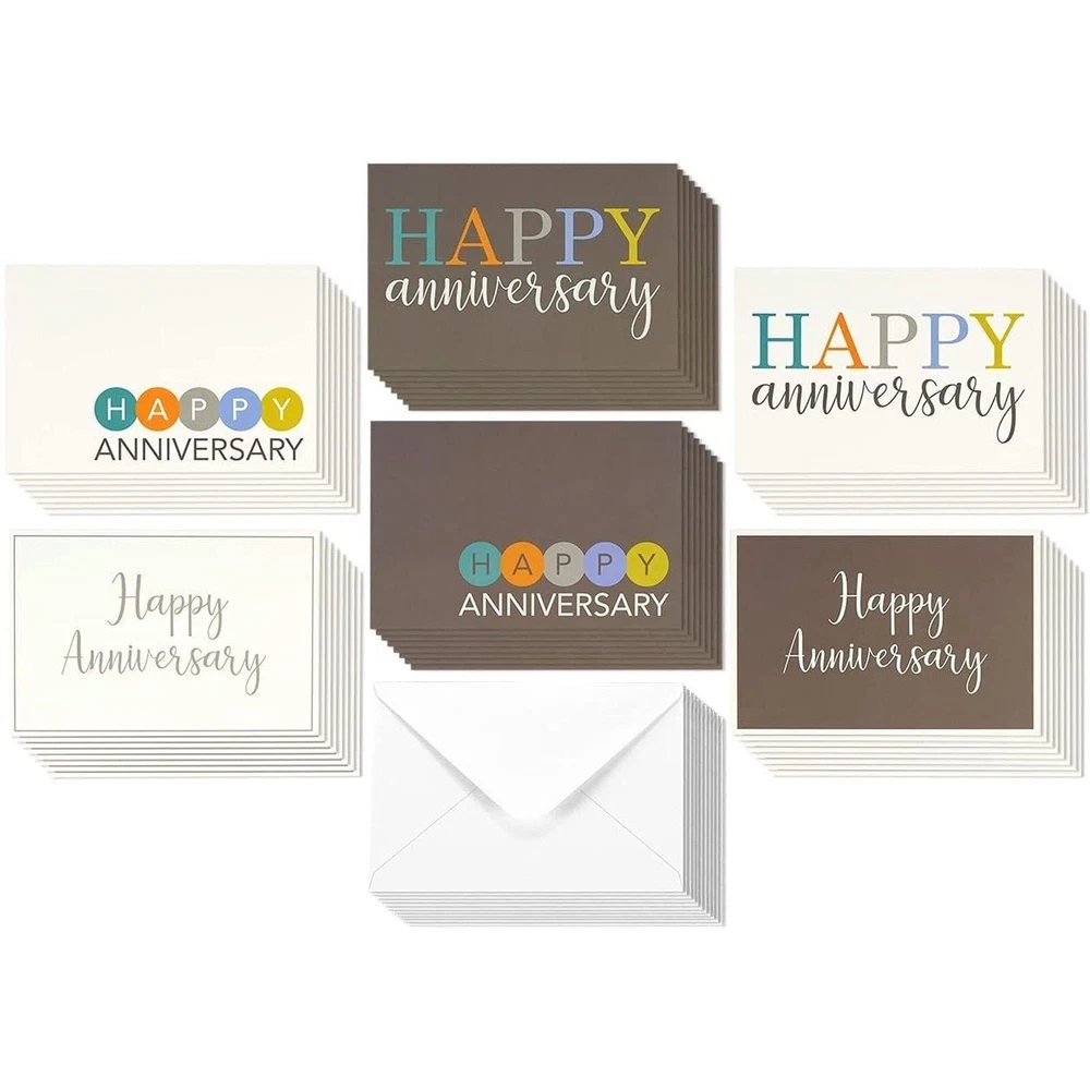 This 36-pack boxed anniversary cards assortment set prepares you for all your card-sending needs! Our greeting cards feature 6 assorted designs and a blank interior for personalized messages. This assortment box is perfect for your significant other, husband, wife, parents, boyfriend, girlfriend, couples, co-workers, boss, and employees. Each 4x6-inch card is printed on high-quality 250 gsm paper card stock. Blank Happy Anniversary Cards: This birthday and anniversary cards assortment features 6 modern-style gender neutral and generic designs in white and brown colors with "Happy Anniversary" lettering on the front Unleash Your Creativity: The blank interior of each card makes our box of anniversary cards with envelopes customizable for any occasion and the ideal choice for couples, married family members, realtors, or as work anniversary cards for employees Durable Material: The bulk anniversary cards with envelopes features cards that are made from 250gsm thick cardstock paper with corresponding 120gsm white v-flap envelopes Dimensions: Each one of our employee anniversary cards measures 4x6 inches; ample space to write customized messages to your significant other or co-worker and tuck a photo or gift card inside Comes With: In our anniversary card pack, you will receive 36 cards in 6 assorted designs with 36 white envelopes, each with its own unique design that will leave a lasting impression on anyone who receives the card