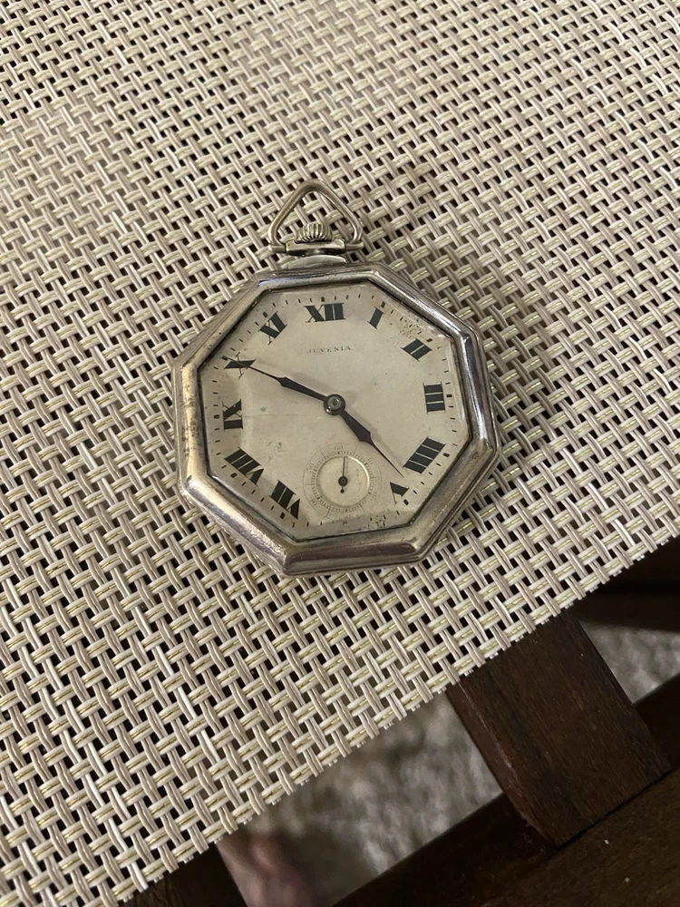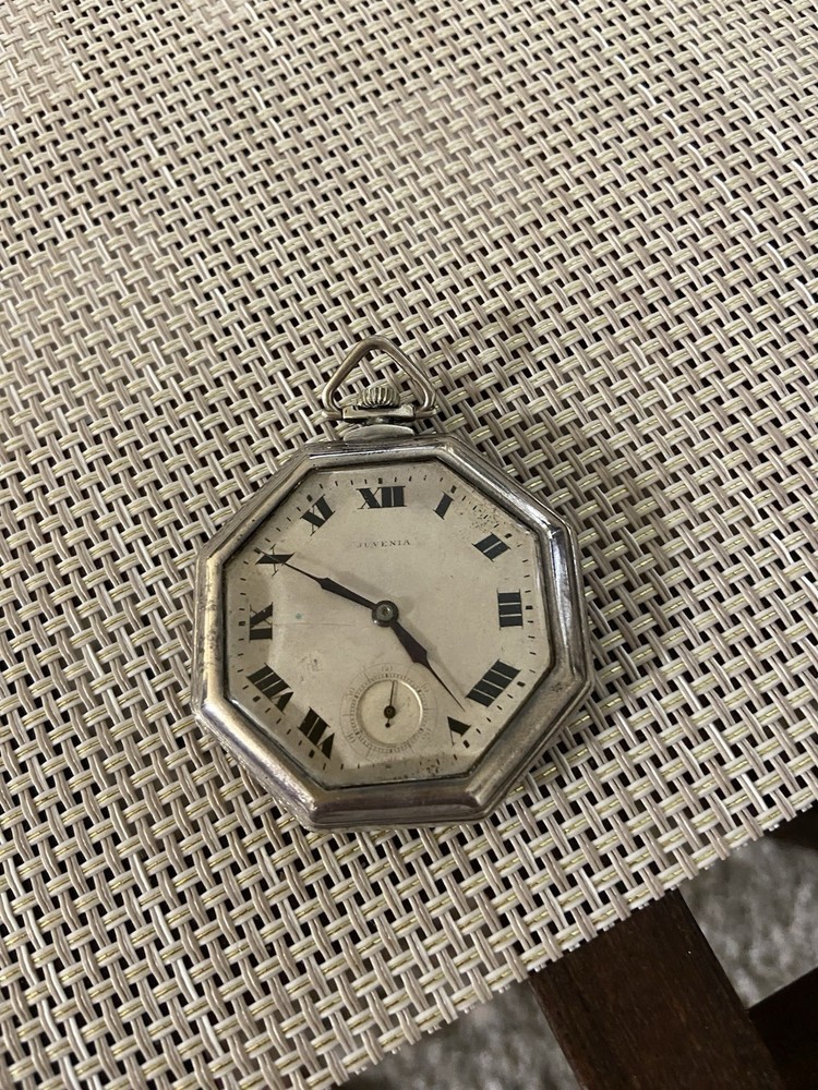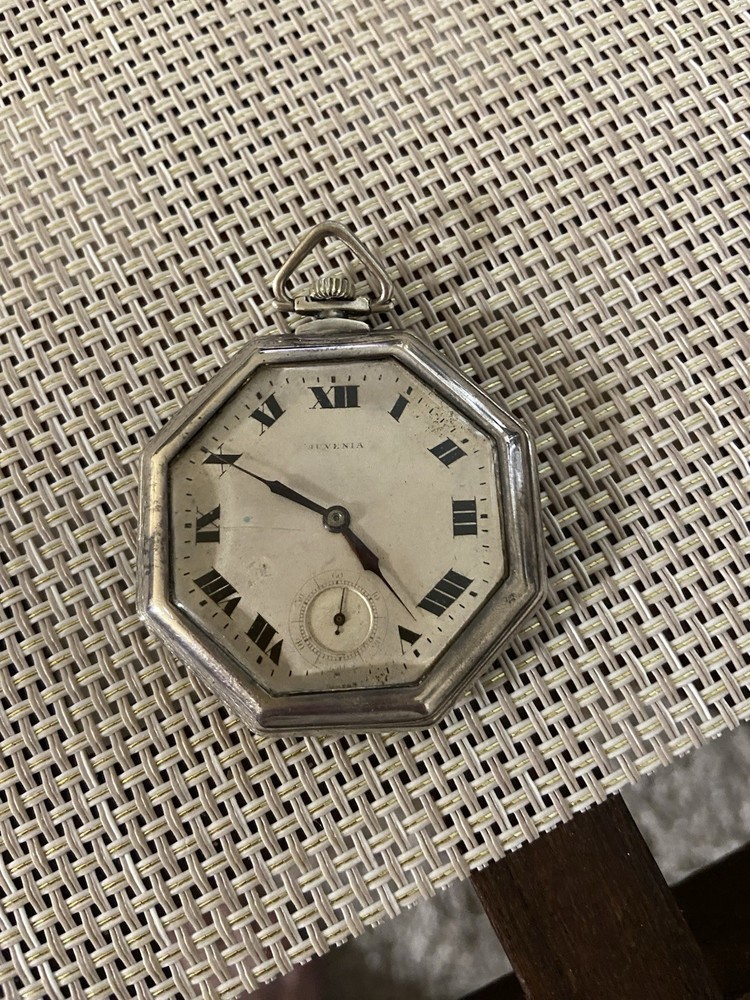 Case Material:Sterling SilverCustomized:NoMovement:Mechanical (Manual)With Papers:NoDisplay:AnalogCase Color:SilverDial Color:SilverFeatures:12-Hour DialClosure:Open FaceIndices:Roman NumeralsCountry/Region of Manufacture:SwitzerlandPersonalize:NoWith Manual/Booklet:NoBrand:JuveniaWater Resistance:Not Water ResistantWith Service Records:NoType:Pocket WatchVintage:YesSeller Warranty:NoWith Original Box/Packaging:NoDepartment:Unisex Adults