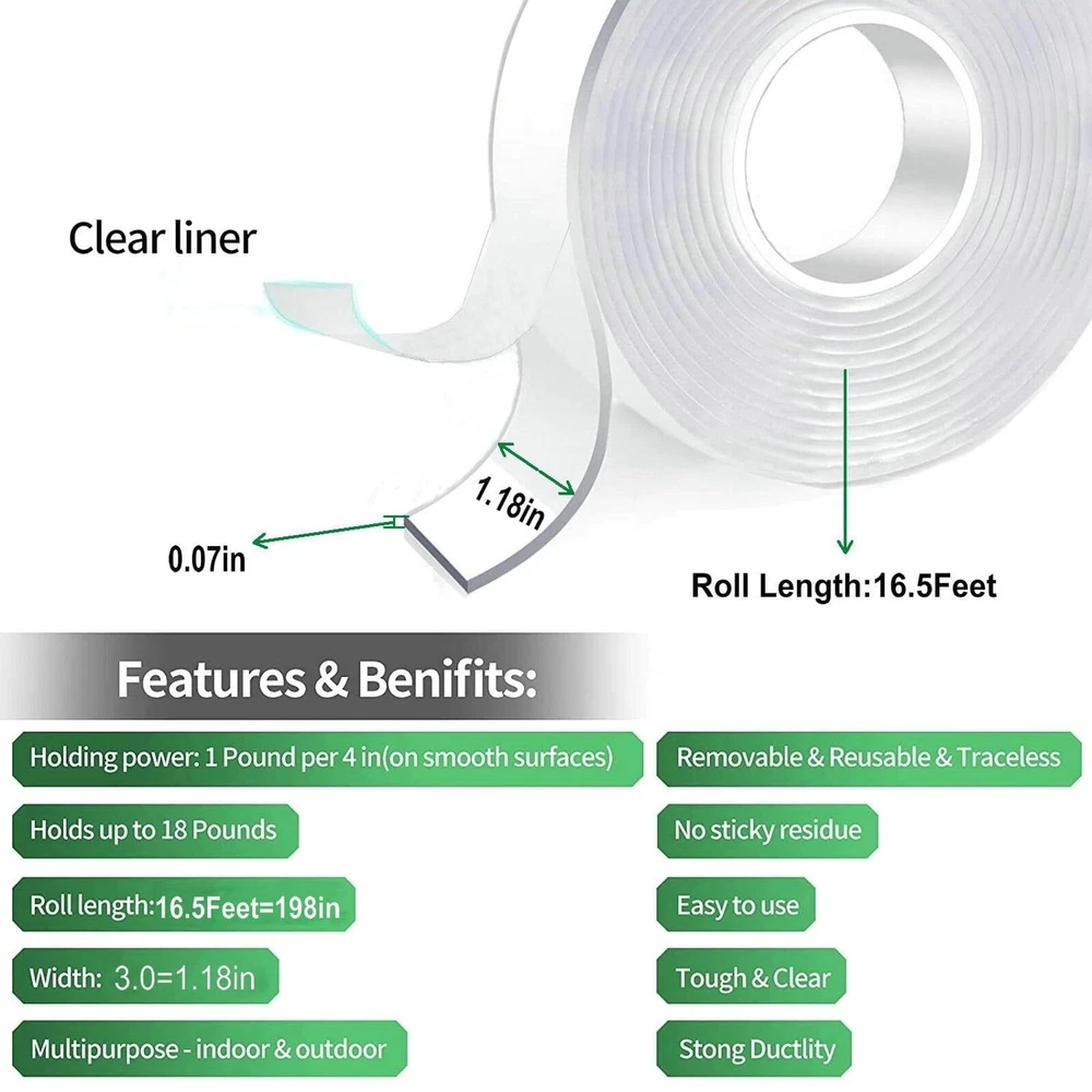 Product Dimensions : 16.5 Feet x 1.18 Inch x 0.07 Inch IMPORTANT TROUBLE SHOOTING 1. Please note that it is not recommended to use this tape on painted walls, unstable walls, rough walls, powdery walls, wet surfaces or uneven surfaces. As our double-sided adhesive is incredibly sticky, improper use can cause surface damage. 2. Ensure that the contact surface of the sticky gel pads is kept clean and dry. Press down hard and hold for 5 seconds after sticking. 3.How to remove -- Using hot air from a hair dryer will soften the tape and make it easier to remove.Then you can use a sharp tool to slowly lift the tape from one side and then slowly peel the tape off the surface of the object. 4. To avoid damage, do not use the tape to hold heavy objects or valuables. 5. Can be air-dried or blow-dried with a hairdryer after washing, DO NOT use any other wipes or detergent. 6. Keep this product out of the reach of children. 7. Store in a normal cool environment. If the tape is directly or indirectly exposed to sunlight for a prolonged period, the colour of the tape’s surface may turn yellow and the tape may stick to the packaging bag. However, yellowing of the tape will not affect the normal use of the product. Multifunctional Nano-tech Tape - Our heavy duty two sided adhesive tape has incredibly strong adhesion and holding power. The perfect solution for all your DIY mounting projects. Easy to Use - No drilling or nails. Strong 2 sided bond capability makes objects firmly attached to any contact surface. It can be easily cut into any size or length you need for your convenience at any time. Removable & Traceless & Weatherproof - The removable two sided sticky tape leaves no residue, easy to remove and will not damage surfaces. Please note: do not use on painted walls! Diversified Uses - This super adhesive tape works perfectly on almost any smooth surface indoors or outdoors, such as glass, plastic, metal, marble, ceramic & more. This strong adhesive tape works perfectly in the temperature range of 0℉ to 150℉, which is preferred for indoor and outdoor use Jwxstore Double Sided Tape Is an Essential for Daily Life - Strong Holding Power can perfectly mount or repair stuff , fixing or pasting items such as picture hangers, frames, small photo frames, pictures, posters, power strips, LED strips, mobile phone stands, vases, DIY decorations, school & house room decor aesthetic and so on. It will bring great convenience to your life!