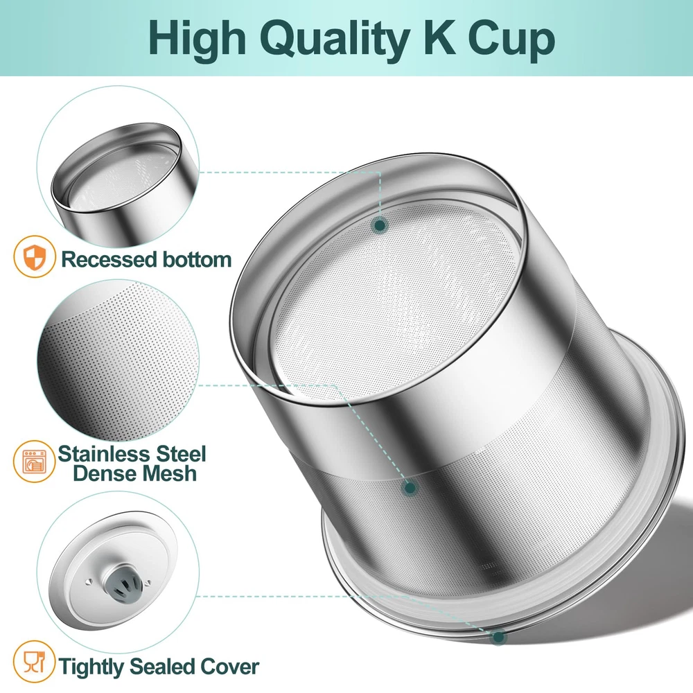Perfect K Cup Reusable Filter: The reusable K cups are compatible with Keurig 1.0 and 2.0 coffee machines, and also work with Keurig K-Classic, K-Elite, K-Latte, K-Cafe, K-Select, K-Compact, and Breville K CUP, Mr. Coffee K CUP, But NOT Compatible with: Keurig K-Supreme/Plus/Smart, K-Slim (See full detailed list picture) Great Seal& Fresh Taste: These reusable coffee pods with unique embedded sealing rings, and bottom and sides with dense mesh to allow coffee to flow out and keep grounds in. Eco-Friendly& Money Saver: reusable K cups are the same size as the K pods, They are stainless steel much cheaper overall, last forever, and Eco-Friendly. Easy to Use & Clean: These refillable k cups are easy to clean, tap against the trash then rinse under the tap. Perfect Sealing: K cup reusable coffee pods are designed with one-piece construction and a solid top seal. The rubber rings for the top seal with a notch that matches it perfectly which ensures it is leakage-free.