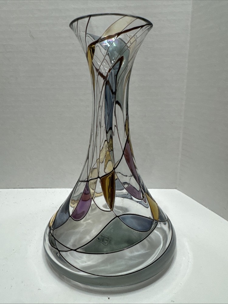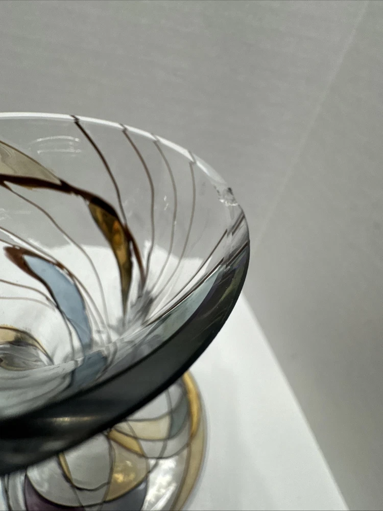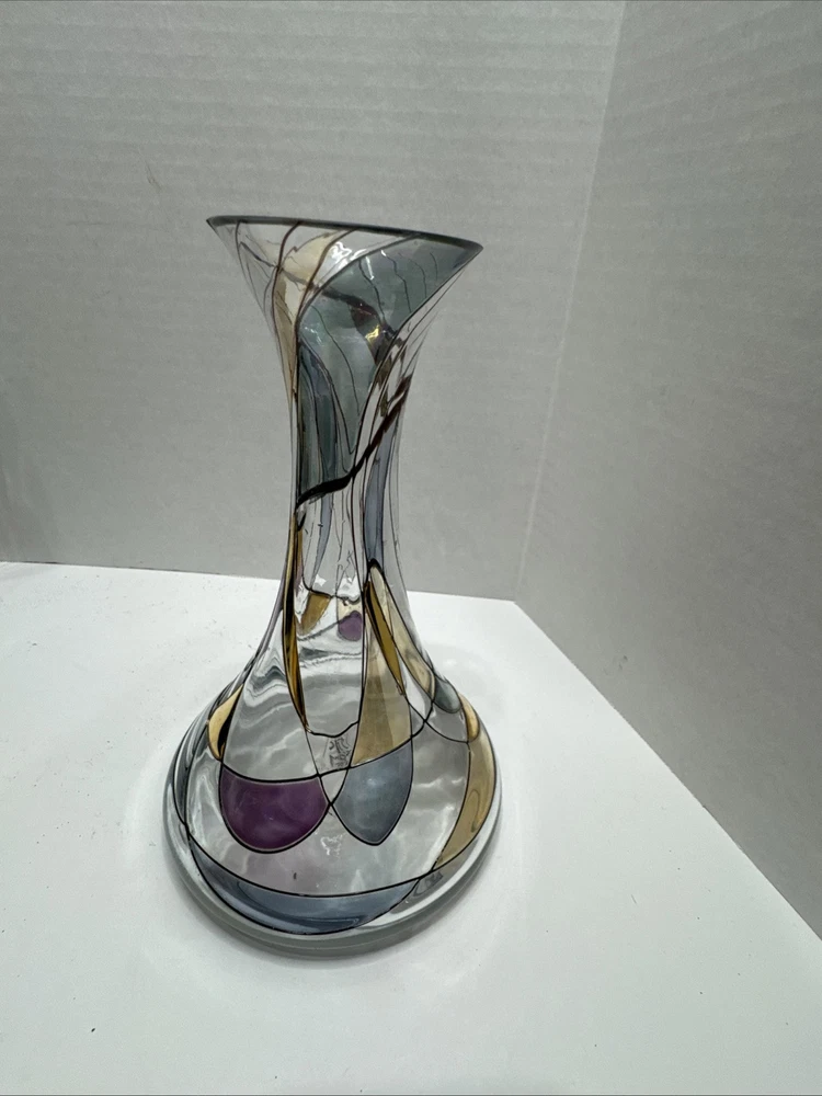 This unique 8" art vase is a stunning piece of handcrafted glassware from Germany. The multicolored, abstract pattern swirls around the tulip-shaped vase, making it a perfect addition to any room. The vase is made using traditional glassmaking techniques, and features engraved decorations that add to its Pop Art style. Care instructions are included, and the vase should be cleaned with a damp cloth. This vintage piece is perfect for teens and adults, and is a great addition to any home decor. The K & K Styling Pop Art Vase is a one-of-a-kind item, and is sure to be a conversation starter. Small tiny chip in rim. See all photos.