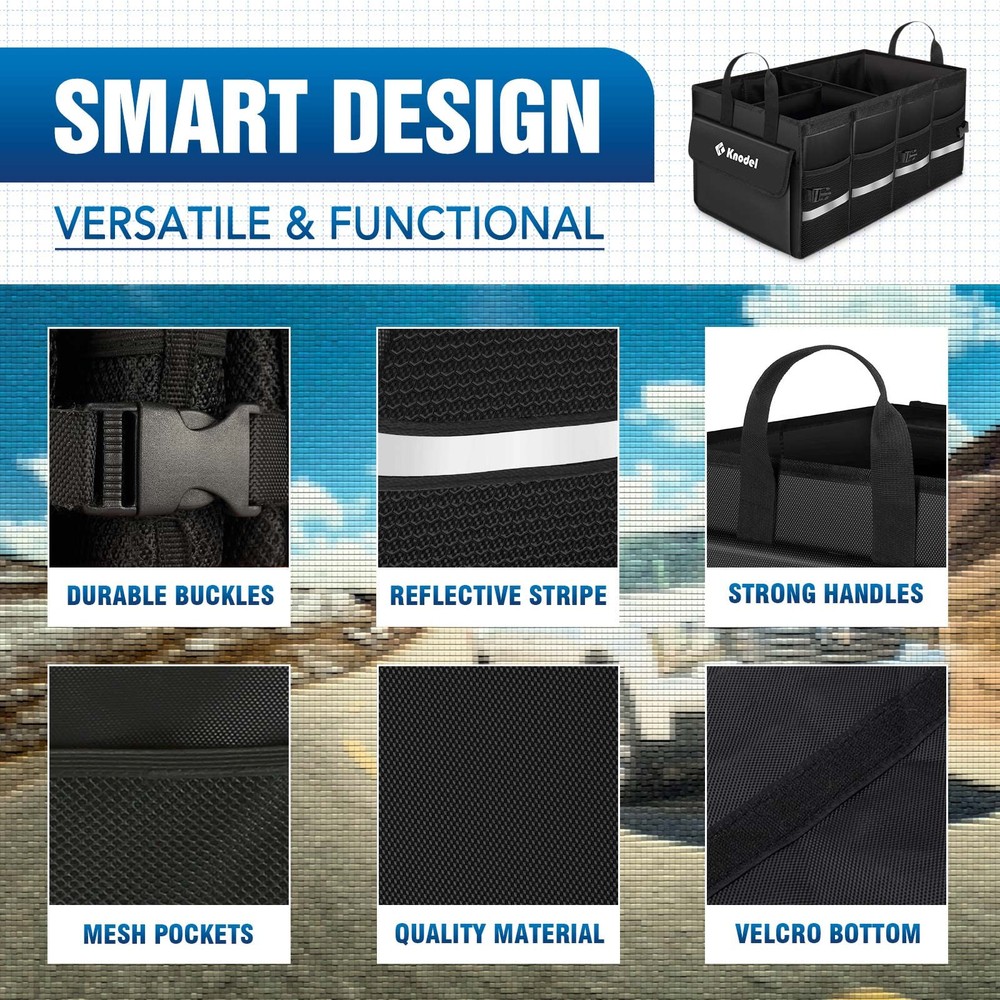 K KNODEL Car Trunk Organizer with Lid, Collapsible Car Trunk Storage Organizer, Car Organizer and Storage for SUV, Truck, Sedan (2C, Black) Description Features: PREMIUM CAR TRUNK ORGANIZER - The K KNODEL Trunk Organizer is best for all kinds of vehicles. Due to its large storage capacity, it keeps everything organized while giving you a clean and tidy car. It can also be an ideal storage basket for household usage. Its reflective stripe makes it more secure when you are carrying it at night. DURABILITY AND HIGH QUALITY - The K KNODEL Trunk Organizer is made of high-quality 600D Oxford Polyester material with reinforced handles, which can withstand the weight of heavy items, and will last you through years of repeated use. In addition, our product features a non-slip bottom to prevent sliding. SMART MULTIPURPOSE DESIGN - Our product features sturdy walls, 2 base plates and 1 slider dividers. With two divided sections, you can use one or expand it to use both, depending on your preference. The 1 removable divider help you organize differently sized items, and the 4 mesh pockets are designed to store smaller items. In order to enhance your organization efforts, we also designed 3 side pockets for you for quick access. It also has a sturdy and foldable cover. EASY TO USE, INSTALL AND CLEAN - It is really easy to install and collapse this cargo storage bag. If you are no longer using it, you can fully fold it and it will occupy less space. If you want to clean it, just wipe its surface with a wet cloth. Product Details: Brand: K KNODEL Color: Black Material: Polyester Special Feature: Portable, Lightweight, Collapsible, Foldable Style: Modern Brand: ‎K KNODEL Color: ‎Black Material: ‎Polyester Special Feature: ‎Portable, Lightweight, Collapsible, Foldable Style: ‎Modern Recommended Uses For Product: ‎For storage Product Dimensions: ‎23.2"L x 13.5"W x 11"H Capacity: ‎57 Liters Closure Type: ‎Zipper Water Resistance Level: ‎Not Water Resistant Item Weight: ‎1.76 Kilograms Opening Mechanism: ‎Zipper Shape: ‎Rectangular Pattern: ‎Solid Number of Items: ‎1 Number of Compartments: ‎2 Unit Count: ‎1 Count Item Package Quantity: ‎1 Maximum Weight Recommendation: ‎10 Kilograms UPC: ‎784848001978 Part Number: ‎KL Item Weight: ‎3.87 pounds Country of Origin: ‎China Item model number: ‎KL Size: ‎2 Compartments Finish: ‎Uncoated Number Of Pieces: ‎2 Mounting Type: ‎Wall Mount Special Features: ‎Portable, Lightweight, Collapsible, Foldable Usage: ‎Car Batteries Included?: ‎No Batteries Required?: ‎No Date First Available: May 15, 2020 Handling We will ship all orders within 3 business days of payment. Delivery We do not ship outside of the Continental US. Feedback We take our reputation seriously, we buy and sell online, so we understand the value of trust. If you are unsatisfied with your order, please contact us and we will work with you to resolve it to your satisfaction.