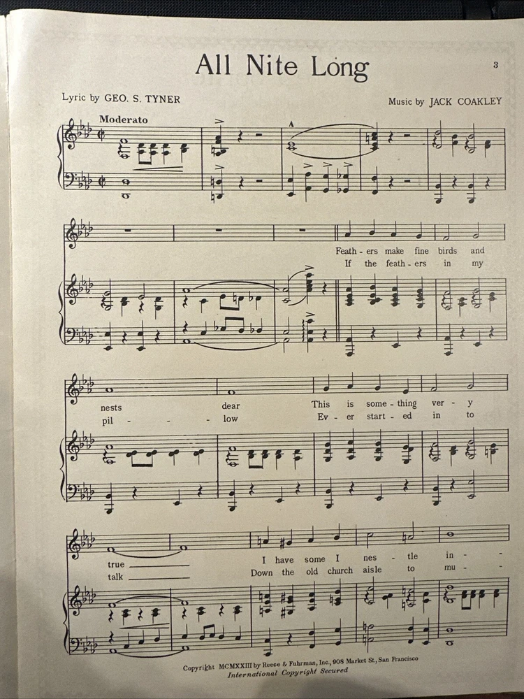 This vintage 1923 San Francisco sheet music titled "ALL NIGHT LONG" is a must-have for any advanced pianist who loves musicals. The piece features beautiful black cat art and is in excellent shape for its age. It was printed in the United States and is in oz unit type. The sheet music is perfect for anyone who wants to add a touch of nostalgia to their music collection. It belongs to the category of vintage and antique sheet music and is sure to be a conversation starter. Get your hands on this rare piece of history today!
