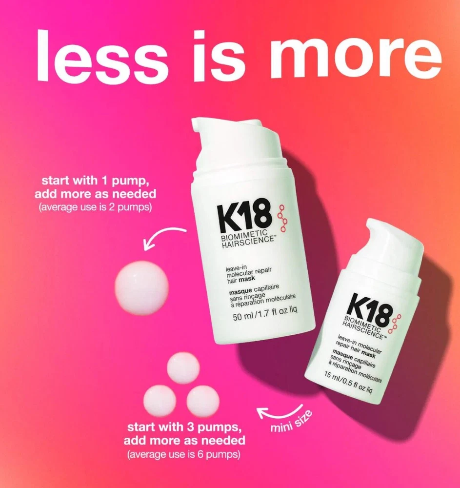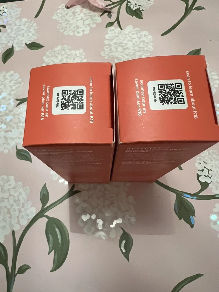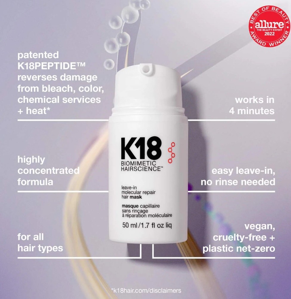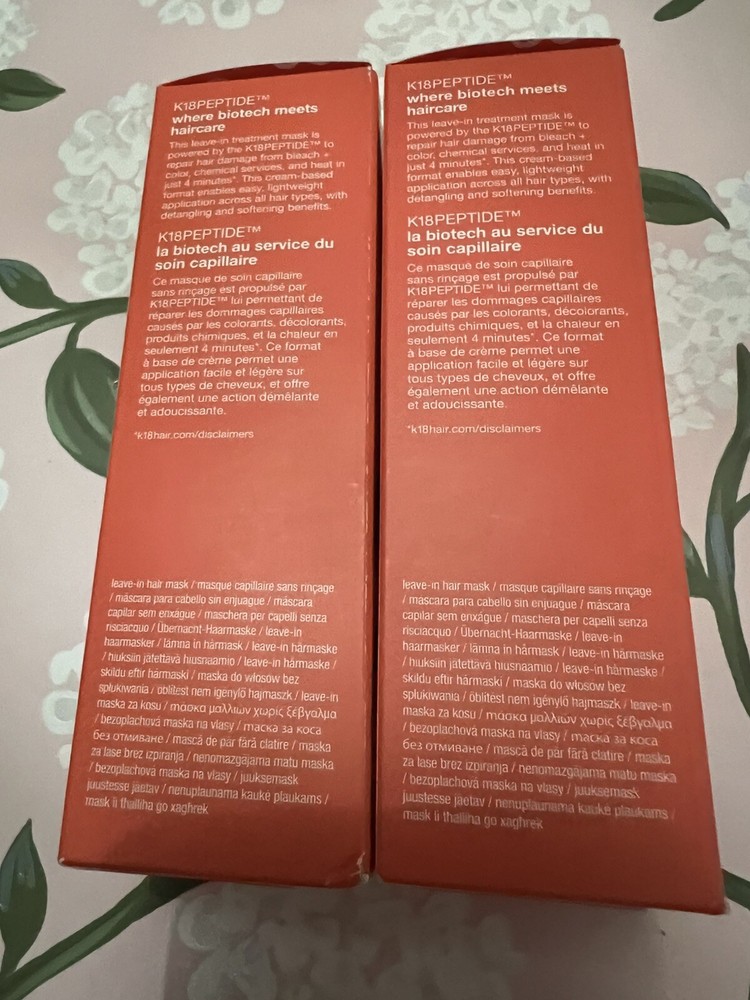 NWT K18 Limited Edition Jumbo Biomimetic Hairscience Leave-In Molecular Repair Hair Masks 200ml 6.8 oz $240 This set contains 2 of the Jumbo size repair masks. Highlights: Clean Trending on Social Good for: Damage Good for: Color Care allure 2022 Best of Beauty Award Winner Bond Building About the Product: What it is: A leave-in treatment mask for all hair types that clinically reverses damage in four minutes. The patented peptide technology works to repair damage from bleach, color, chemical services, and heat, restoring strength, softness, smoothness, and bounce to hair. Hair Type: Fine, Medium, and Thick Hair Texture: Straight, Wavy, Curly, and Coily Hair Concerns: - Damage/Split Ends/Breakage - Color Safe - Straightening/Smoothing Key Benefits: - Restores strength, softness, smoothness, and bounce - Repairs damaged hair - Easy leave-in formula delivers lasting results Highlighted Ingredients: - K18Peptide™: Repairs damage from bleach, color, chemical services, and heat. Ingredient Callouts: This product is vegan, cruelty-free, and comes in recyclable packaging. What Else You Need to Know: This mask is powered by the patented K18Peptide, which is just the right size and molecular structure to reach the innermost layers of hair and re-connect broken keratin chains responsible for hair's strength and elasticity. Fragrance Description: The light floral scent features notes of jasmine and peony. Clinical Results: In a clinical study on hair that was bleached 8 times, after 2 uses: - Biotech-powered K18Peptide restored damaged hair by up to 82% This product is an Allure Best of Beauty award winner.