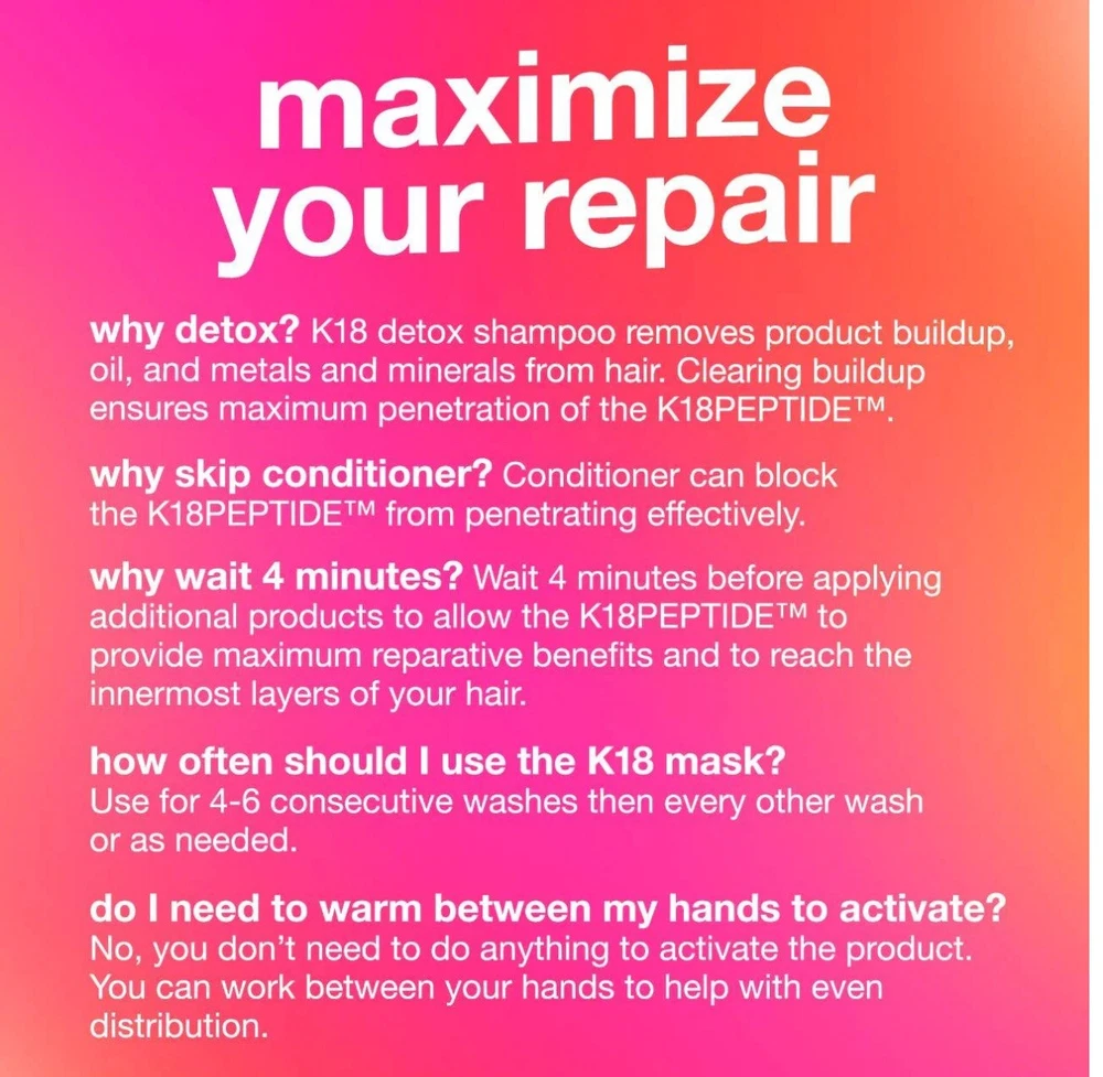 MPN: K18-31005 Active Ingredients: Peptides Period After Opening (PAO): 12M Department: Women Brand: K18 Volume: 6.8 fl oz Product Line: K18 Biomimetic Hairscience Ingredients: Peptides Styling Effect: Hair Repair Formulation: Cream Type: Hair Mask Size: Jumbo Features: Cruelty-Free/No Animal Testing, Silicone-Free, Sulfate-Free, Vegan Hair Type: Damaged Hair Country/Region of Manufacture: United States Scent: Floral