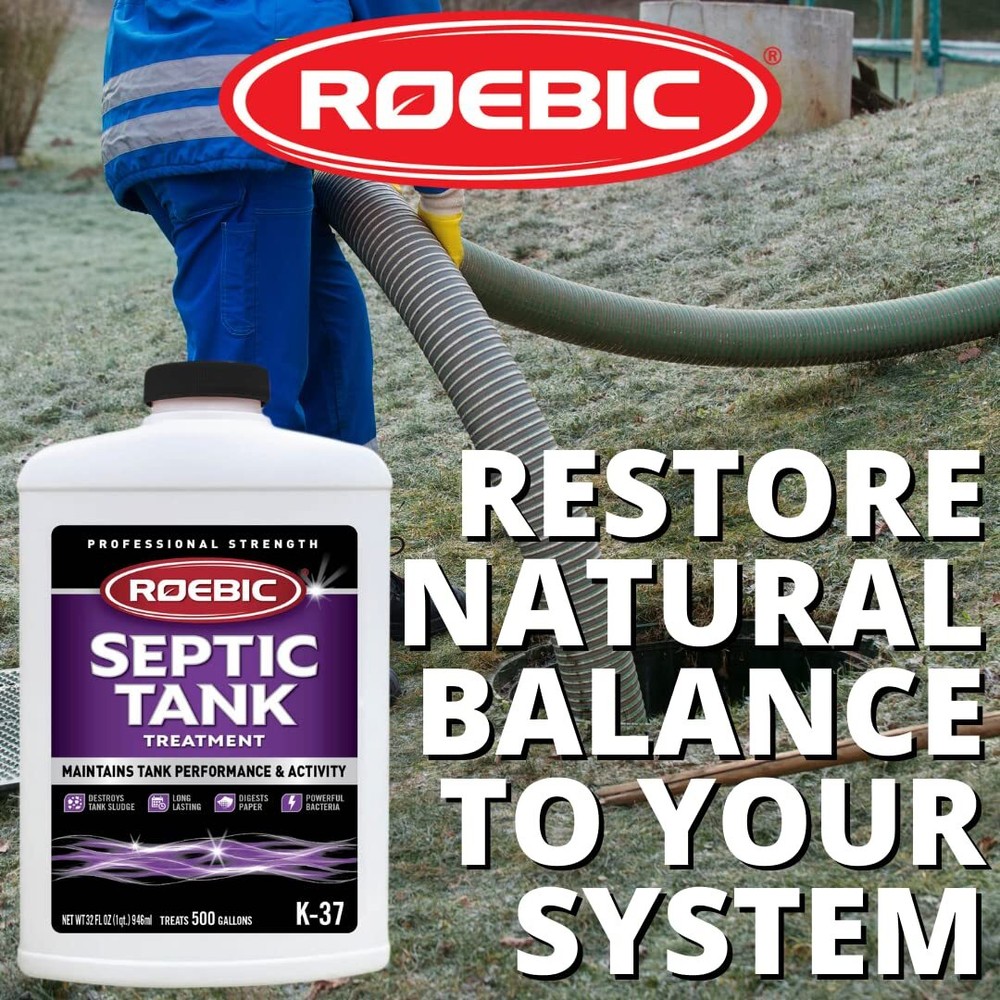 K-37-Q Septic Tank Treatment, 32 Fl Oz Safe for all plumbing, works in septic tanks and drain fields. Prevents clogging, odors, and overflowing receptacles Restores natural balance, promotes rapid breakdown of solids, reduces sludge, scum levels, odors, and clogs for efficient system operation Patented Roetech bacteria keeps system running smoothly, prevents common septic problems, and ensures efficient operation Economical and easy to use. Treats a 500-gallon septic tank, lasting for a full year. Maintains system efficiency Biodegradable, safe for the environment. Contains aerobic, spore-bearing bacteria resistant to soaps and detergents Product Description Biological activity in septic tanks is easily thrown out of balance when excessive water, harmful detergents or other harmful chemicals enter the system. K-37 Septic Tank Treatment is specifically designed to restore the natural balance within septic tanks by promoting the efficient and rapid breakdown of solids, thereby reducing sludge and scum levels and resulting in reduced odors, less clogs and more efficient system operation. Your septic system is hard at work processing all the water, organic debris,and other wastes that you flush down your toilets and drains each and everyday. Tired and inefficient systems can result in problems such as clogging of inlets and outlets , excessive odor, or costly and messy back-ups. Help to prevent these problems with regular use of Roebic Septic Tank Treatment. For over 50 years Roebic has developed high quality products engineered for optimum performance targeting specific problems and troublesome areas within the septic system. Trust Roebic,The Septic Professionals, for all your septic and drain care needs. From the Manufacturer Roebic's easy to use K-37 contains patented ROETECH bacteria that keeps your septic system running smoothly. Prevents the clogging of inlet and outlets that can lead to unpleasant odors and overflowing receptacles. K-37 works in both your septic tank and drain fields. Economical and safe for all plumbing. Shipping We offer FREE shipping on all orders! We ship within Three business days of payment, usually sooner. We use a selection of shipping services such as UPS, FedEx, USPS etc. We only ship to the lower 48 states, no APO/FPO addresses or PO Boxes allowed. Local pickups and combined shipping options are not provided at this time. Return You can return a product for up to 30 days from the date you purchased it. Any product you return must be in the same condition you received it and in the original packaging. Please keep the receipt. Payment We accept payment by any of the following methods: PayPal Please pay as soon as possible after winning an auction, as that will allow us to post your item to you sooner! Feedback Customer satisfaction is very important to us. If you have any problem with your order, please contact us and we will do our best to make you satisfied. Contact Us If you have any queries, please contact us via ebay. We usually respond within 24 hours on weekdays. Please visit our eBay store to check out other items for sale! Thank you for shopping at our store.