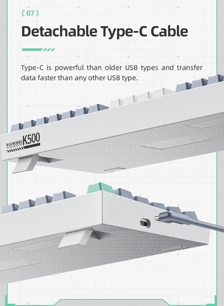 1. About keyboard languages ·Select keyboards shipped from China, which are keycaps for US English. ·Select keyboards shipped from Russia, which are US English mixed with Russian keycaps. Features Of K500 1, 94 Keys 90% layout 2, PBT shot keycaps 3, Allow Hot-swappable 4, 20 kinds of RGB Backlit 5, All keys Anti-ghosting 6, 18 Multimedia Keys PBT Shot Keycaps PBT shot injection keycap , design for durability and crystal clear uniform backlighting Two Color To Choose 90% LAYOUT---94 Keys Design Crafted for productivity, the K500's 90% layout is a version to allows users access to all the essential multimedia and function keys, but with a smaller footprint. EXCELLENT TYPING EXPERIENCE The K500 is designed to fit your dedicated typing experience. No matter what you like, linear, clicky or a little in between, we've got you covered with three Huano switches options (Blue, Brown, Red). We want to make sure that you experience the same feedback for every keystroke. HOT-SWAPPABLE You can easily hot-swap every switch in a few seconds to customize your typing experience on the K500 without soldering. Wonderful RGB Backlight Effects The K500 features RGB lighting with 16.8 million LED colors , you can download additional lighting effects to the library and easily use them through the lighting effects driver Detachable Type-C Cable Type-C is powerful than older usd types and transfer data faster than any other USD type .