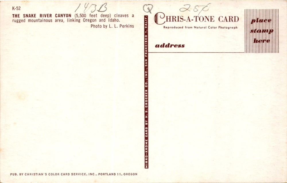 MAKE AN OFFER. THE MORE YOU BUY THE BETTER DEAL I WILL ACCEPT The postcard features a photo of the Snake River Canyon, which is 5,500 feet deep and runs through a rugged mountainous area connecting the states of Oregon and Idaho. The photo was taken by L. L. Perkins and the postcard was published by Christian's Color Card Service in Portland, Oregon. The card is a Mirro-Krome card by H.
