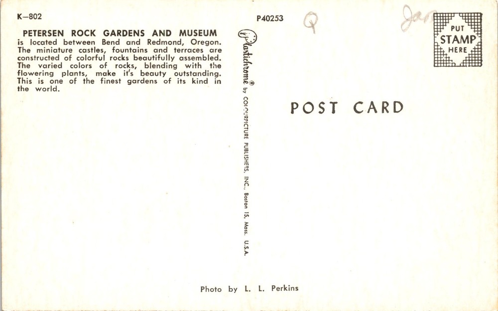 MAKE AN OFFER. THE MORE YOU BUY THE BETTER DEAL I WILL ACCEPT The postcard describes the Petersen Rock Gardens and Museum located between Bend and Redmond, Oregon. The gardens feature miniature castles, fountains, and terraces constructed from colorful rocks, creating a beautiful and unique display. The rocks are skillfully assembled, blending with flowering plants to enhance the overall beauty of the gardens.