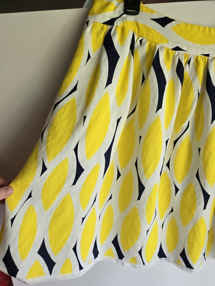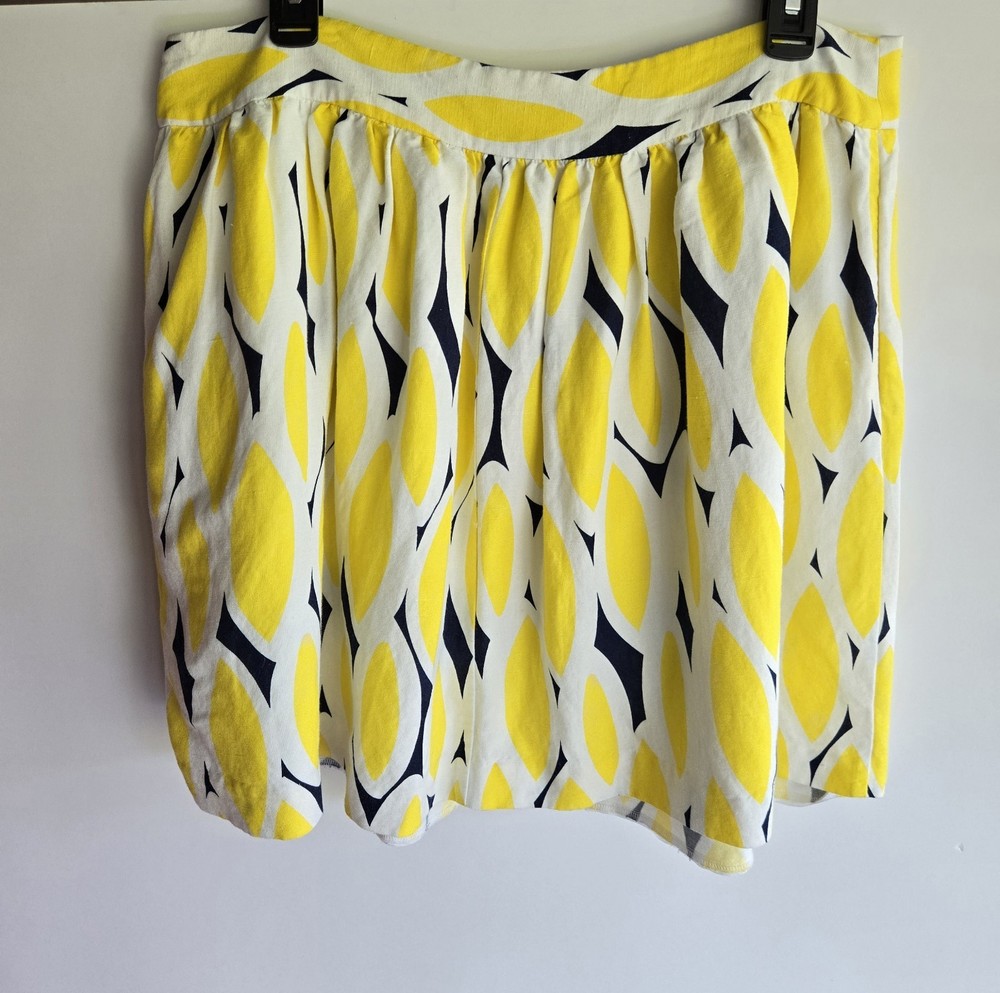 This KAARI BLUE skirt is a vibrant and stylish addition to any wardrobe. The bold yellow and white pattern with navy blue accents makes a statement, while the gathered waist creates a flattering silhouette. Made from a comfortable linen and rayon blend, this size 12 skirt is perfect for warm weather. The 100% cotton lining adds a touch of luxury. Stylish skirt Yellow & white Size 12 Linen blend Comfortable fit MEASURMENTS in inches Waist: 32 Length: 19 Comes from a smoke free home. All clothing is in excellent condition unless otherwise stated. ----------------------------------------------------- BIN C