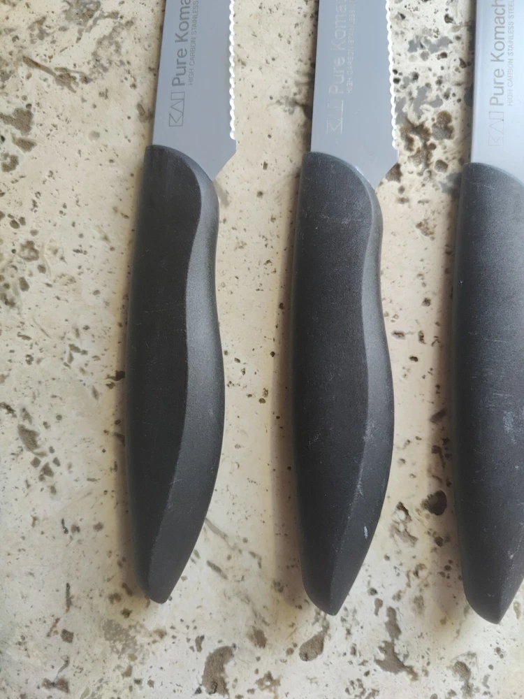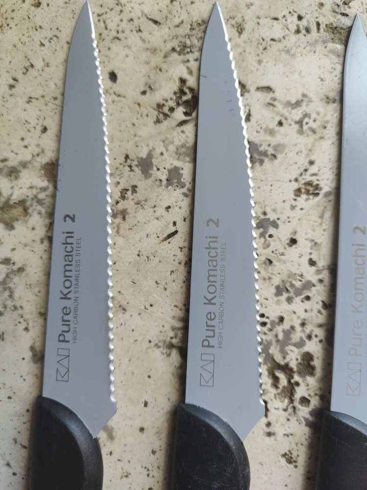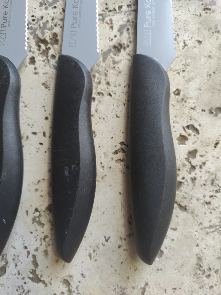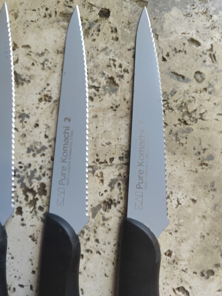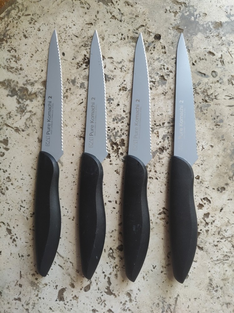 The KAI Pure Komachi 2 Black 5" Set of 4 Serrated Steak Knives iset designed for cutting meat. Each knife in the set features a 5-inch serrated stainless-steel blade, ideal for slicing through steaks and other meats. All 4 are used and show typical signs of wear from age and use including scratches and buffs to the blades and handles.