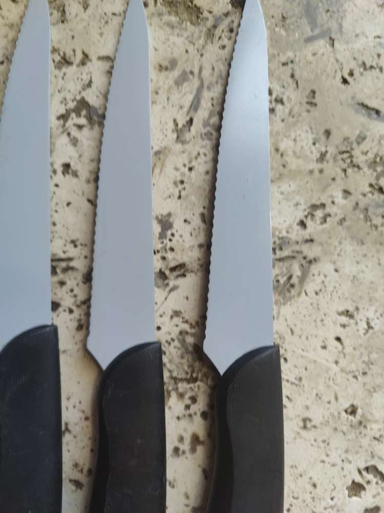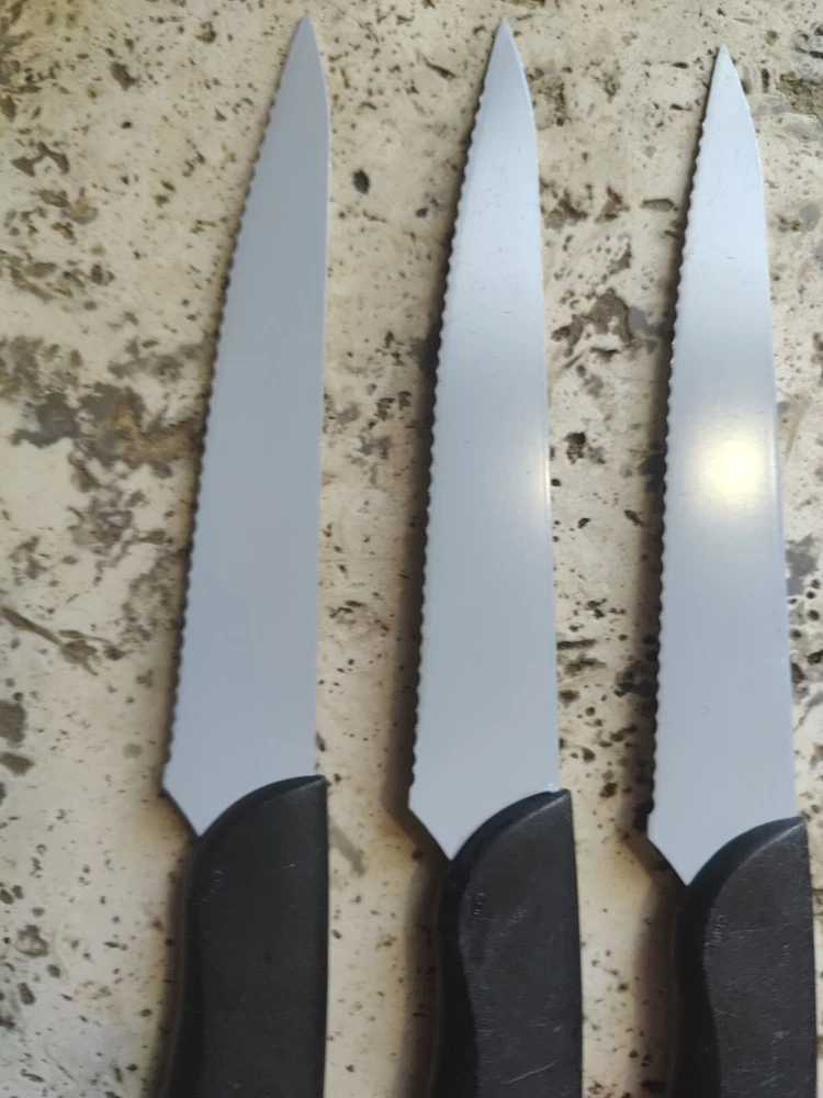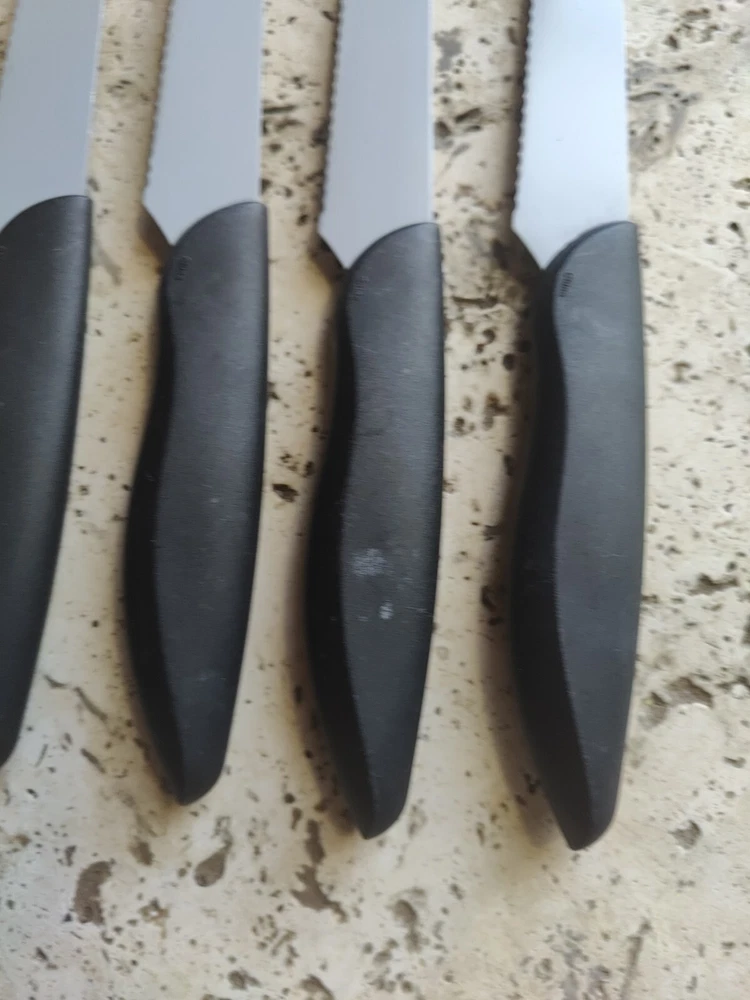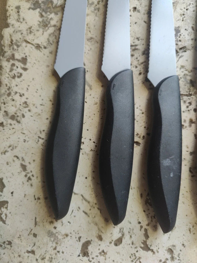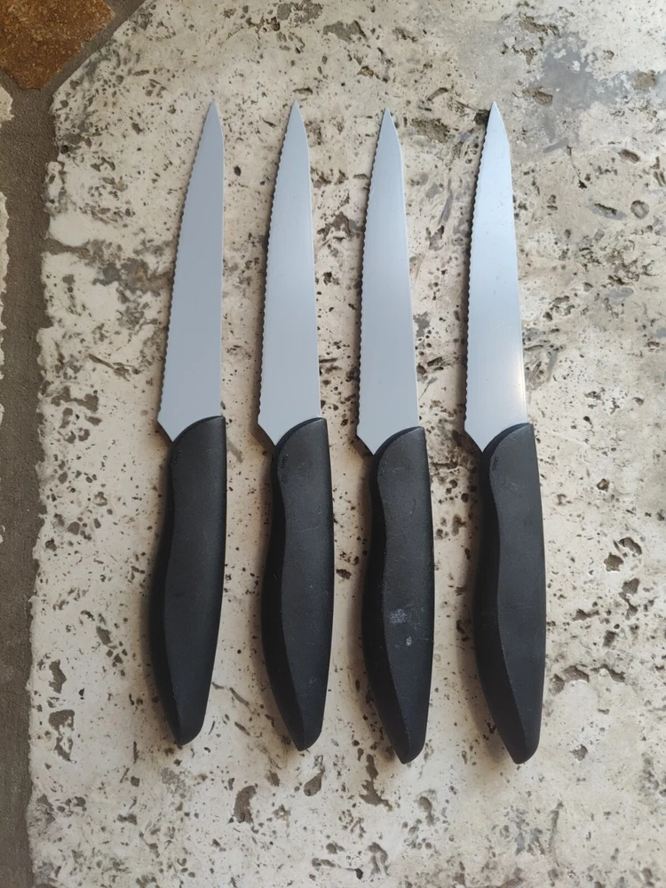 The KAI Pure Komachi 2 Black 5" Set of 4 Serrated Steak Knives iset designed for cutting meat. Each knife in the set features a 5-inch serrated stainless-steel blade, ideal for slicing through steaks and other meats. All 4 are used and show typical signs of wear from age and use including scratches and buffs to the blades and handles.