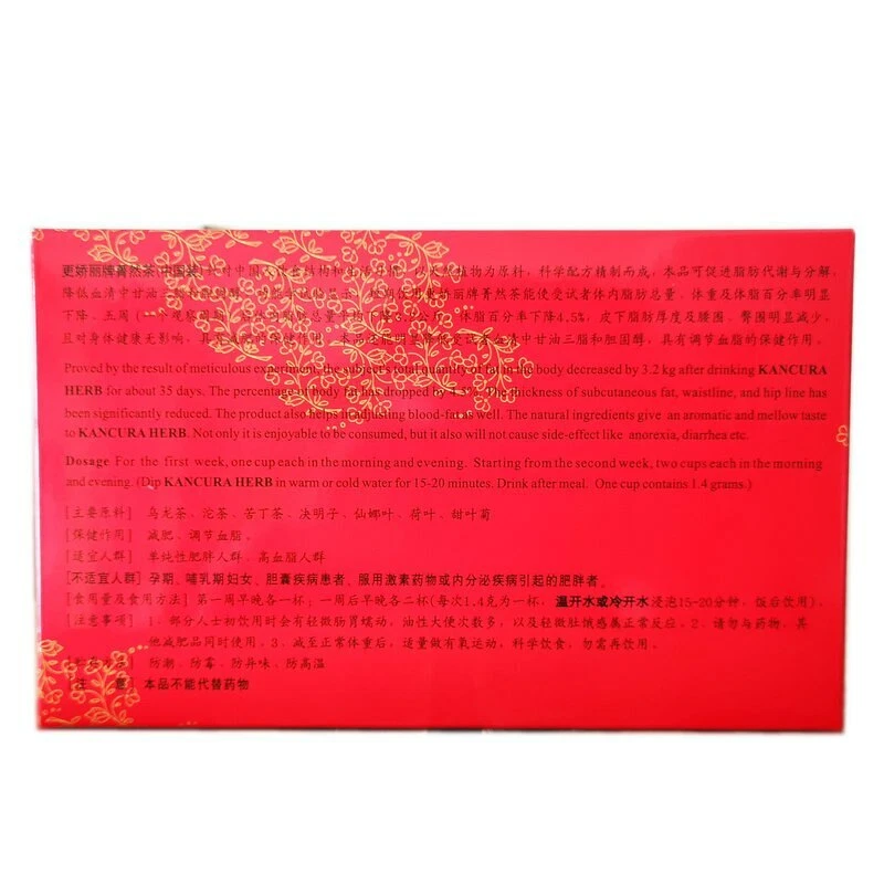 Condition:New: A brand-new, unused, unopened, undamaged item. See the seller's listing for full details Expiration Date:24 Months Allergens:N Form:Bagged Product:Tea & Infusion UPC:Does not apply MPN:Does not apply Regional Cuisine/Region:Chinese Calories per Serving:0 Flavor:Unflavored Brand:KANCURA Type:Herbal/Tisane Volume:1.4g*20 teabags Food Specifications:Organic Country/Region of Manufacture:China Serving Size:0 Number of Servings:1.4g*20 teabags Item Weight:28g/Box eBay Origin: China Type: Slimming Tea Origin: China Net weight: 28g /box Packaging: Box (1.4g*20 tea bags). Main raw materials: Oolong tea, Tuocha, Kuding tea, Cassia seed, Sinna leaf, lotus leaf, stevia. Suitable crowd: simple obese people, hyperlipidemia people. Health function: lose weight, regulate blood fat. Not suitable for people: pregnant women, breastfeeding women, patients with gallbladder disease, obesity caused by hormone drugs or endocrine diseases. Drinking method and drinking amount: within the first week, one cup each morning and evening; one week later, two cups each morning and evening: (1.4 grams each time is one cup, soak in warm or cold water for 15-20 minutes, drink after meals). During the weight loss period, please take a strict and scientific diet. Choose foods with high protein content, rich in vitamins, low fat, low sugar, and low starch. Eat less or no high-fat, high-sugar foods. Eat early, have a full lunch, and eat at night. Eat less. Storage method: anti-moisture, anti-mildew, anti-odor, anti-high temperature. Note: 1. Some people may have slight gastrointestinal motility, frequent oily stools, and a slight feeling of hunger when they first drink it, which are normal reactions; 2. Do not use it with drugs or other weight loss products at the same time; 3. After losing to normal weight, do aerobic exercises and eat scientifically, no need to drink.