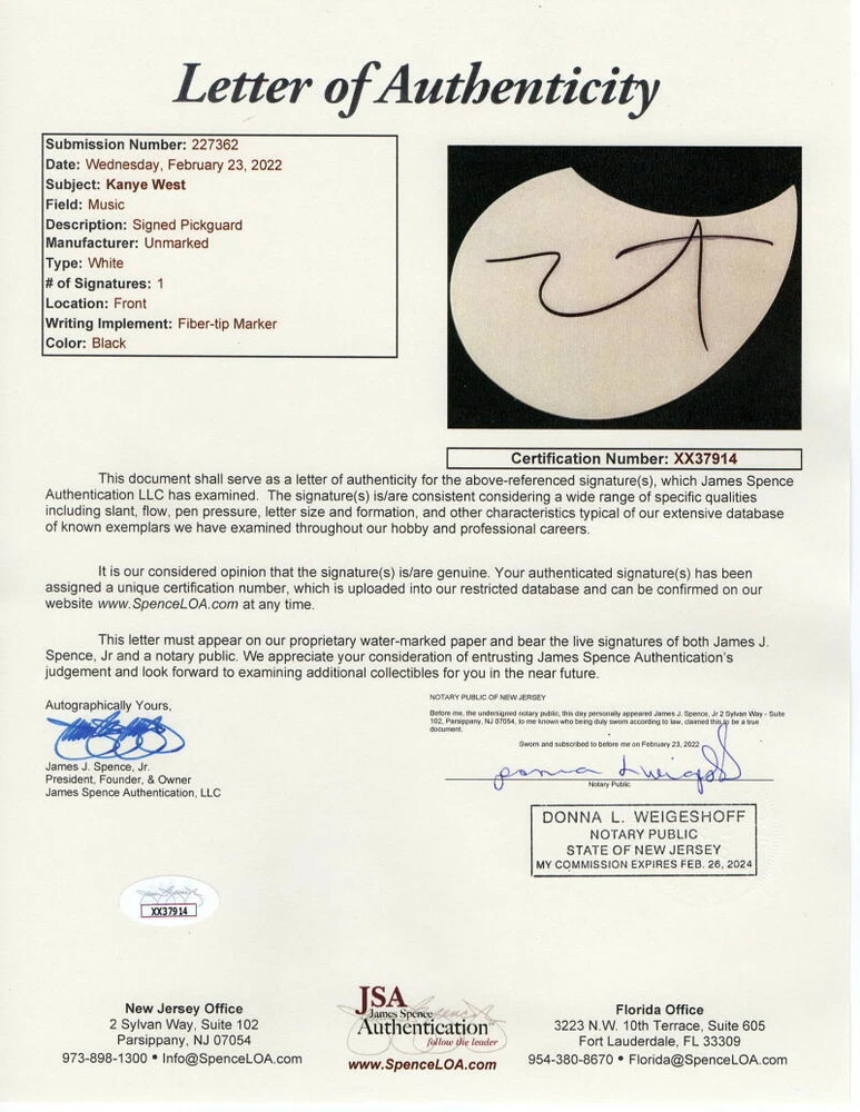 Welcome to GM Authentic Autographs Be sure to added us to your favorite sellers list...We add new inventory weekly! Here at GM Authentic Autos, we have been providing 100% authentic autographs to fans for nearly two decades here on Ebay. We travel the county to attend events, movie screenings, film festivals and various other events to be able to provide our customers the best autographs for their collections. Every single item comes with a Certificate of Authenticity from GM Authentic Autographs . Some items may also come with additional authentication through proof photos (when available) or certification from leading TPA's such as Beckett, PSA/DNA or JSA! Product Information: Signature(s): Kanye West Item Description: Full Size Gibson Epiphone Acoustic Guitar Location of Signing: Specific signing details available upon request Authentication: James Spence (JSA) Letter of Authenticity Money Back Guarantee Every item purchased from GM Authentic Autographs, comes with a 100% money back guarantee . We are passionate about only authentic autographs being sold in the marketplace to avoid fans being sold fake autographs from unscrupulous individuals. With this money back guarantee, buyers can feel reassured and know their money is being spent on only AUTHENTIC SIGNATURES. Shipping & Payment Information: Payment: Is expected within 3 days of the purchase date through PayPal Shipping: All domestic orders are shipped through the United States Postal Service w/ Delivery Confirmation All international orders are shipped thru Ebay's Global Shipping Program **If your country is not serviced thru the GSP, please get in touch with us & we will work with you to find another option for shipping!** Our Goal... Is to ensure you feel comfortable purchasing autographs here on Ebay. That is why we offer a money back guarantee and include certificates of authenticity with all of our items. We are available at all times of the day to answer any questions that you may have, so feel free to contact us at any time at (516) 381- 4028!