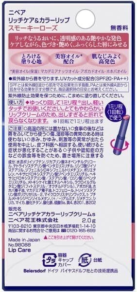 KAO NIVEA Rich Care & Color Lip Cream – Smoky Rose (2g) Enhance your lips with a touch of natural elegance and deep hydration using NIVEA Rich Care & Color Lip Cream in Smoky Rose . This dual-purpose lip cream delivers beautiful, sheer color while nourishing your lips with long-lasting moisture. Infused with a blend of beauty oils including macadamia nut oil, avocado oil, and jojoba oil, it helps keep lips soft, smooth, and healthy-looking throughout the day. Features: Elegant Smoky Rose shade for a subtle, sophisticated look Smooth-glide formula that feels light and non-sticky Infused with beauty oils for deep moisturization SPF 20 protection against UV damage Ideal for everyday wear—no mirror needed for application Slim, easy-to-carry tube (2g) for on-the-go use Perfect for those who want a hint of color with the comfort of a lip balm, NIVEA's Smoky Rose lip cream is a beauty must-have.