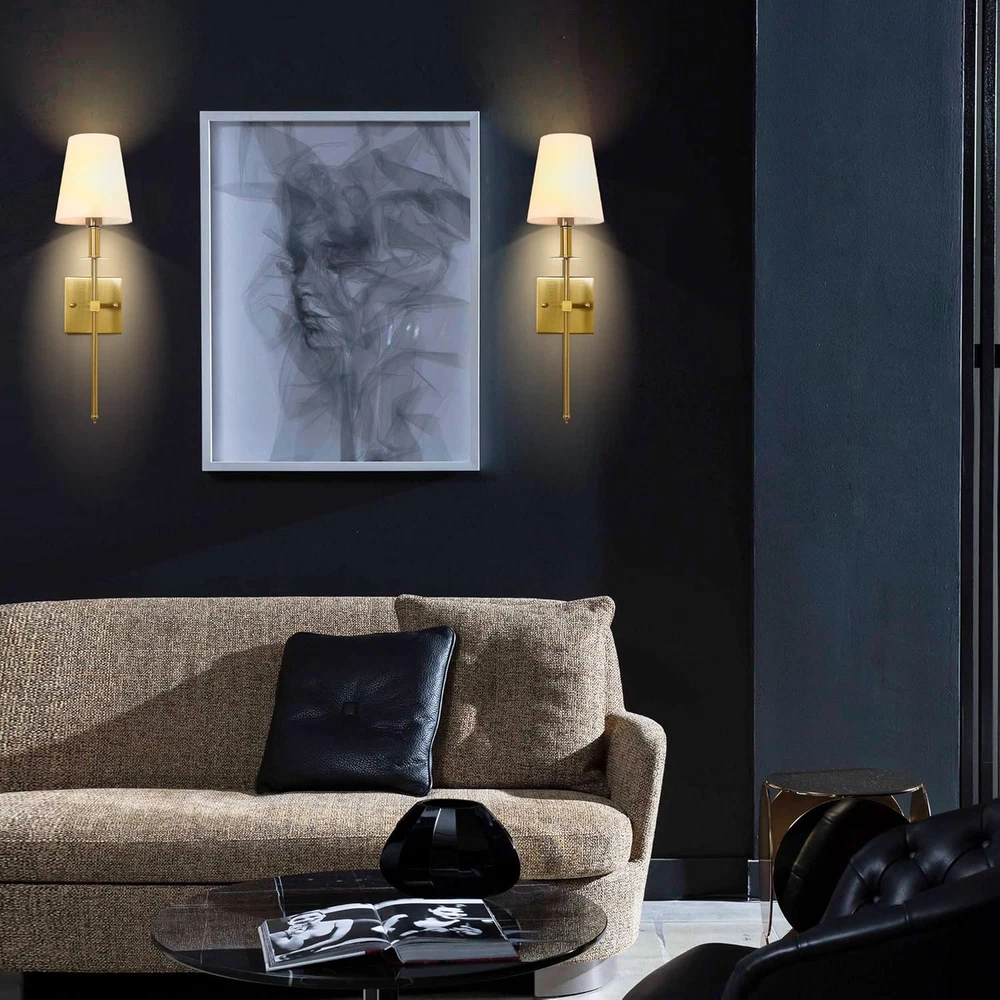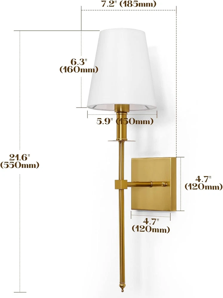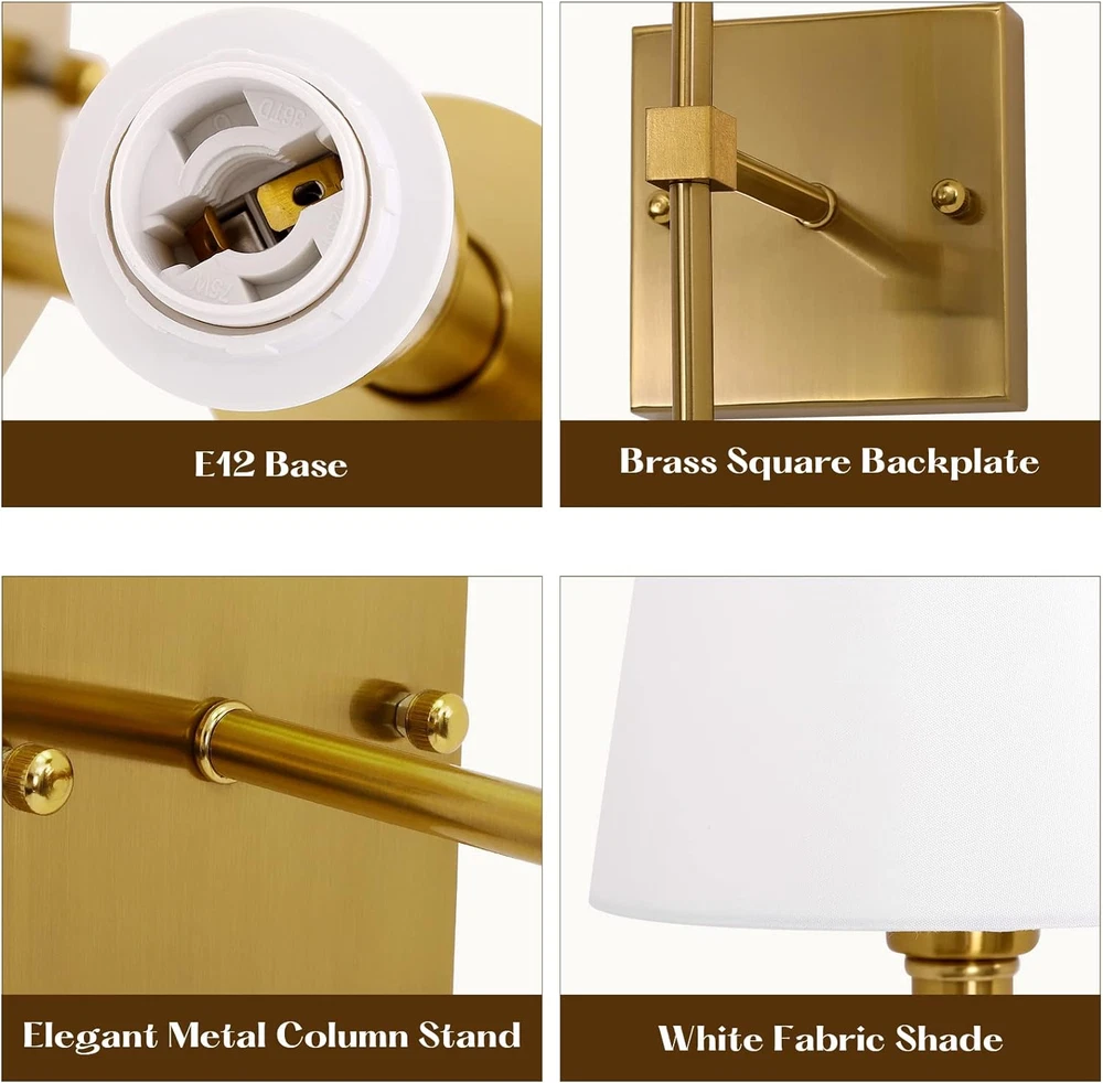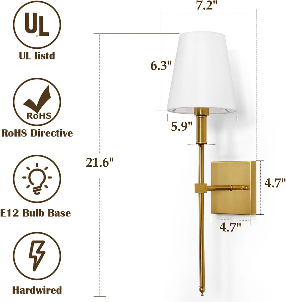 Theme: Classic Item Weight: 3.35 pounds Special Feature: Dimmable, 60W Max, Indoor Use, E12 Base, Hardwired Finish types: Brushed Product Dimensions: 21"L x 7.2"W x 5.9"H Lighting Method: Incandescent Brightness: 1600 lumen Shade Color: White Plug Format: A- US style Light fixture form: Sconce Fixture Type: Non Removable Mounting Type: Wall Mount Control Method: Touch Light Source Type: Halogen, LED, Fluorescent, Incandescent Wattage: 60 Watts Warranty Type: Limited Part Number: R-WS-01GD2 Controller Type: Push Button Assembly Required: Yes Item model number: R-WS-01GD2 Material: Metal Number of Light Sources: 2 UPC: 313042742709 Shade Material: Fabric Style: Classic Specific Uses For Product: Home Bulb Base: E12 gtin13: 313042742709 Voltage: 120 Volts Power Source: hardwired Brand: Does not apply Unit Count: 2 Count Installation Type: Wall Mount Batteries Required?: No Number of Items: 2 Included Components: Wall sconces set of 2 Room Type: Kitchen, Living Room, Dining Room Color: Antique Brass Batteries Included?: No Switch Type: Touch Special Features: Dimmable, 60W Max, Indoor Use, E12 Base, Hardwired Specification Met: UL Type: Does not apply Finish Type: Brushed Indoor/Outdoor Usage: Indoor Water Resistance Level: Not Water Resistant