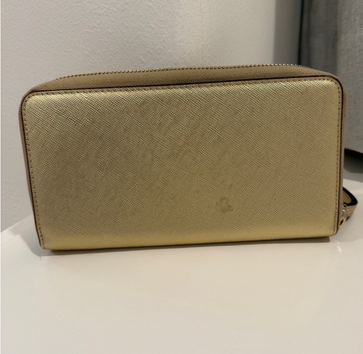 Brand:kate spade new yorkSeller Notes:“Gently usedSmall mark on back (shown in picture)”Vintage:NoColor:GoldMaterial:LeatherStyle:Zip-AroundSize:One SizeType:WalletFeatures:Credit CardPattern:SolidAccents:Logo, ZipperPersonalize:NoFabric Type:CanvasHandmade:NoDepartment:WomenTheme:OrganizerCharacter:NA