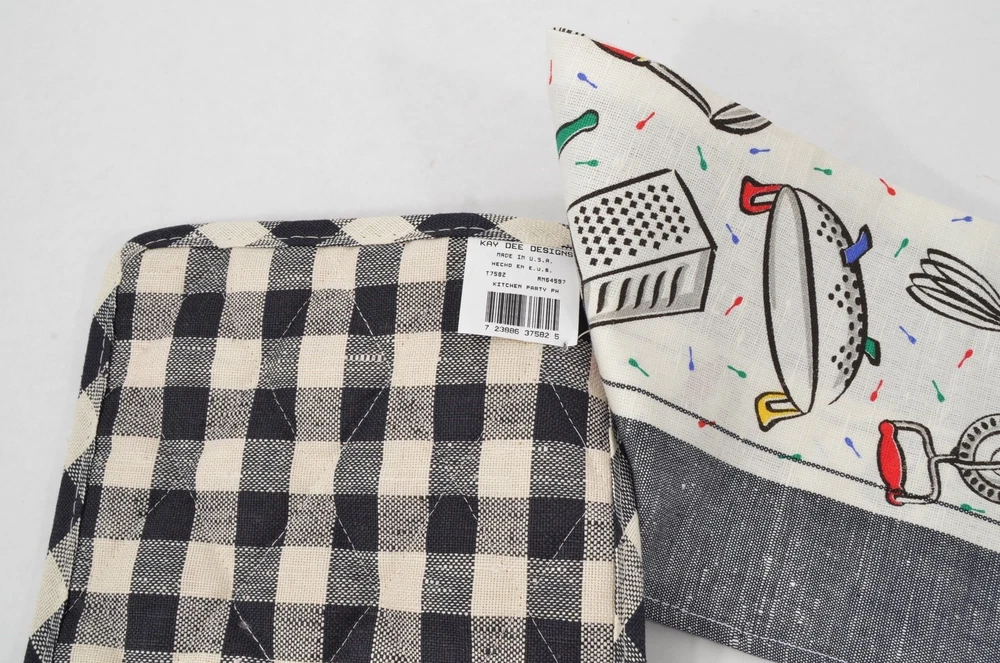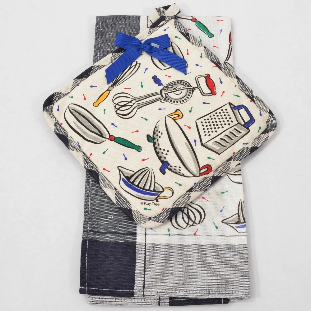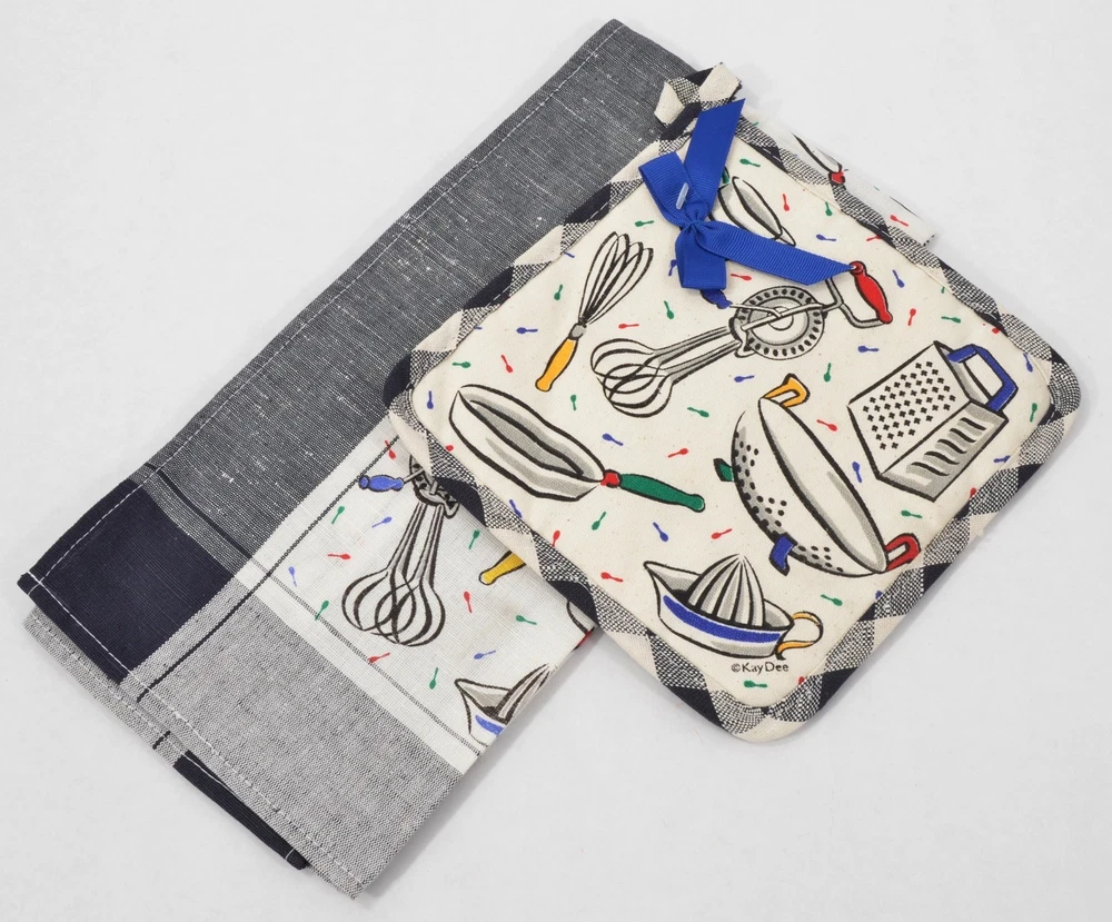 DESCRIPTION: Fun black and white linen and cotton blend, Kay Dee tea towel and potholder set. The pattern has a fabulous design with old time kitchen gadgets, and a splash of color. SIZE/WEIGHT: About 27" x 18.5" on the towel. Weighs 4.25 oz. CONDITION: Excellent like new and still attached, with no stains or age spots, never used. Terms Seller will combine multiple purchases - buyer must request a final invoice, and make one single payment for all items at once. Purchases must fall within a 7 day period, and all items must be able to ship in the same package. All questions to be resolved prior to bidding or making any purchases. Payment is due within 7 calendar days of the date of sale. Return policy and payment instructions can be found below on this page. Please use the shipping calculator on this page. This is a shipping-only item and is not available for in-person pickup. Delivery confirmation is automatically included on all domestic United States shipments at no additional charge, when allowed by US Postal guidelines. International Buyers - Please Note Import duties, taxes and charges are not included in the item price or shipping charges. These charges are the buyer's responsibility. Please check with your country's customs office to determine what these additional costs will be prior to bidding/buying. These charges are normally collected by the delivering freight (shipping) company or when you pick the item up - do not confuse them for additional shipping charges. We do not mark merchandise values below value or mark items as "gifts" - US and International government regulations prohibit such behavior. Powered by SixBit's eCommerce Solution