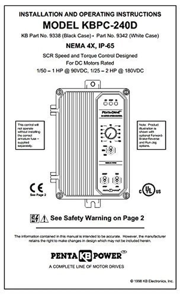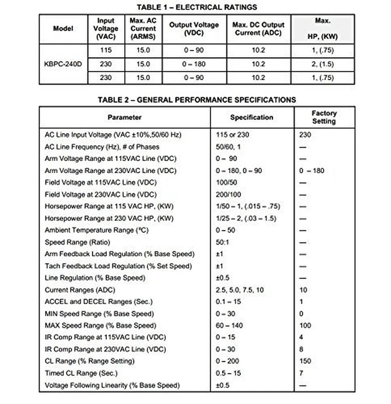 Store New Arrivals Add to Favorite View Feedback Contact KBPC-240D Black (9338) DC Drives Nema 4 Description Item model number KBPC-240D Black Product Dimensions 5.9 x 9.5 x 5 inches; 4.75 Pounds Is Discontinued By Manufacturer No Manufacturer KB Electronics KBPC-240D Black KB Electronics 115/230 VAC, thru 1 KBPC-240D NEMA-4X Adjustable Speed DC Motor Control The KBPC-240D is a 115/230vac, enclosed NEMA-4X (IP-65), adjustable speed DC Motor Speed & variable Torque control, rated 15 Amps RMS @ 45C. It is designed for environments where high humidity or watertight integrity is required. Its housing is ruggedly constructed of die cast aluminum, which is protected with an anti-corrosive acrylic coating. Motors will last longer with our exclusive Short Circuit and Timed Current Limit (TCL) circuitry that prevents motor burnout and demagnetization of PM motors. Selectable features are: motor voltage 90/180VDC, motor current range .25 to 10 amps, input signal 0-5/0-20VDC, armature/tachometer feedback, tachometer voltages 7,25,50 V/1000 rpm. Analog adjustments include: Min, Max, Accel, Decel, IR, CL, TCL and Jog. Standard features are: armature fusing, electronic start-stop and LED indicators for "Power On," "Stop" and "Overload". Options: Forward-Brake-Reverse switch, Signal Isolator, Run-Stop-Jog switch, Auto/Manual kit. Approvals: UL, CSA, CE. ABOUT US We offer the best prices around on high quality products. Our E-store includes media such as books, movies, music and games while offering electronics, toys, sporting apparel, clothing, tools, general home, garden items and more. SHIPPING We are always working hard to ensure your package arrives as soon as possible. Please understand that some factors like weather, high postal traffic, and the performance of shipping companies are outside of our control. For shipping outside of the continental USA, we only use eBay's Global Shipping Program.The item is shipped to KY and then sent to the rest of the world. International customers are responsible for all duties and taxes. Continue to check out in order to calculate costs for shipping the item to your country. Messages regarding eBay's Global Shipping Program MUST be directed at eBay EXCLUSIVELY. RETURNS We offer a 30-Day Return Policy on items which you are not completely satisfied with. You have the option for a full-refund or an exchange of the item. No returns are available on items shipped outside of the USA. PAYMENT We accept PayPal. CONTACT US This page content is yet to come Please ad us to your favorite seller and visit again later Thank You CUSTOMER SATISFACTION We try our very best to make sure every customer is completely satisfied. If there's a problem, message us! We're happy to help. WE ACCEPT Copyright © 2021 AutoDS. | All Rights Reserved