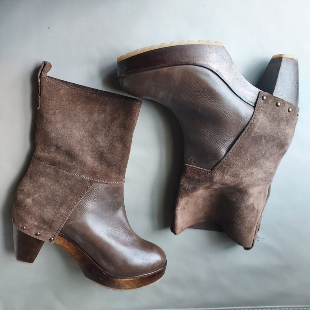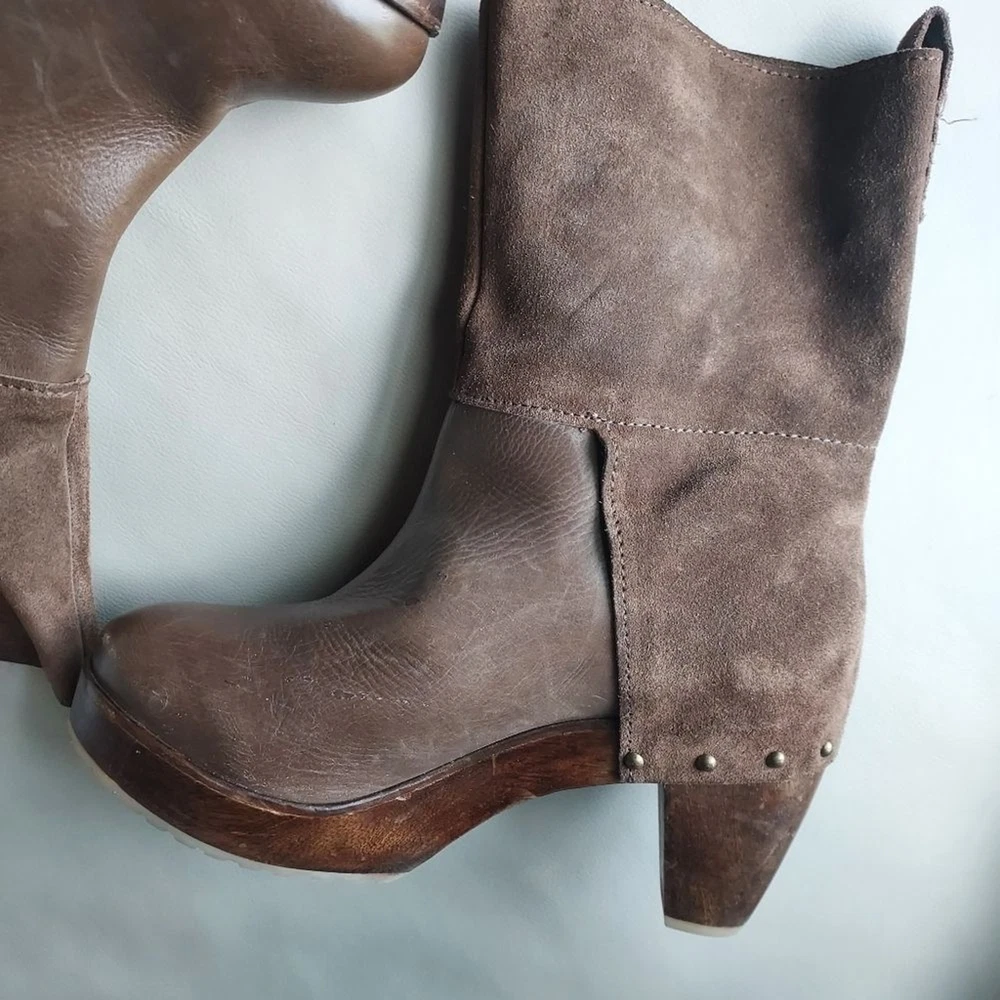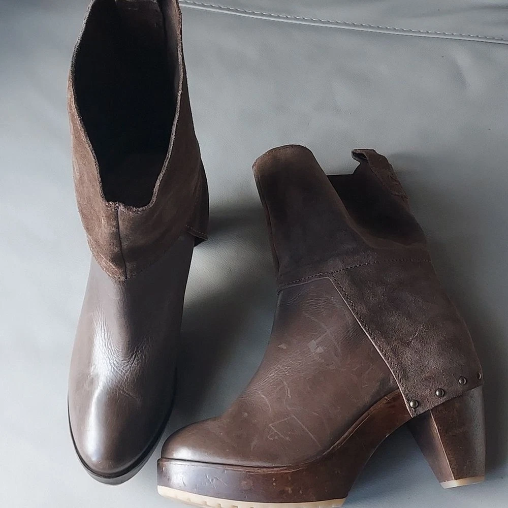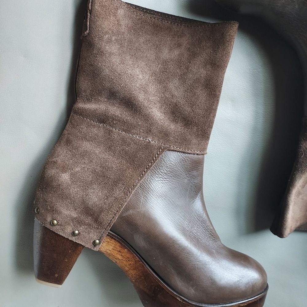 suede and leather platform booties wooden block heels Rubber sole round toe pull on tab scuffs on leather and minor scuffs on heels, see pictures, please
