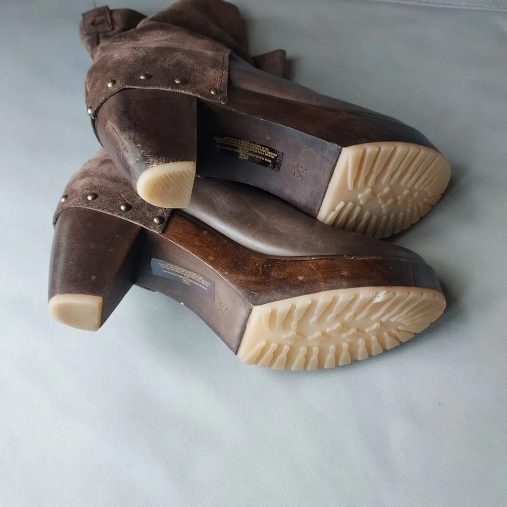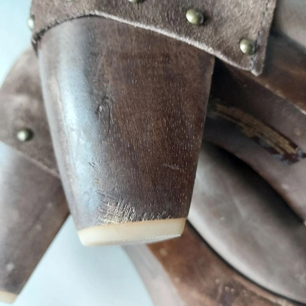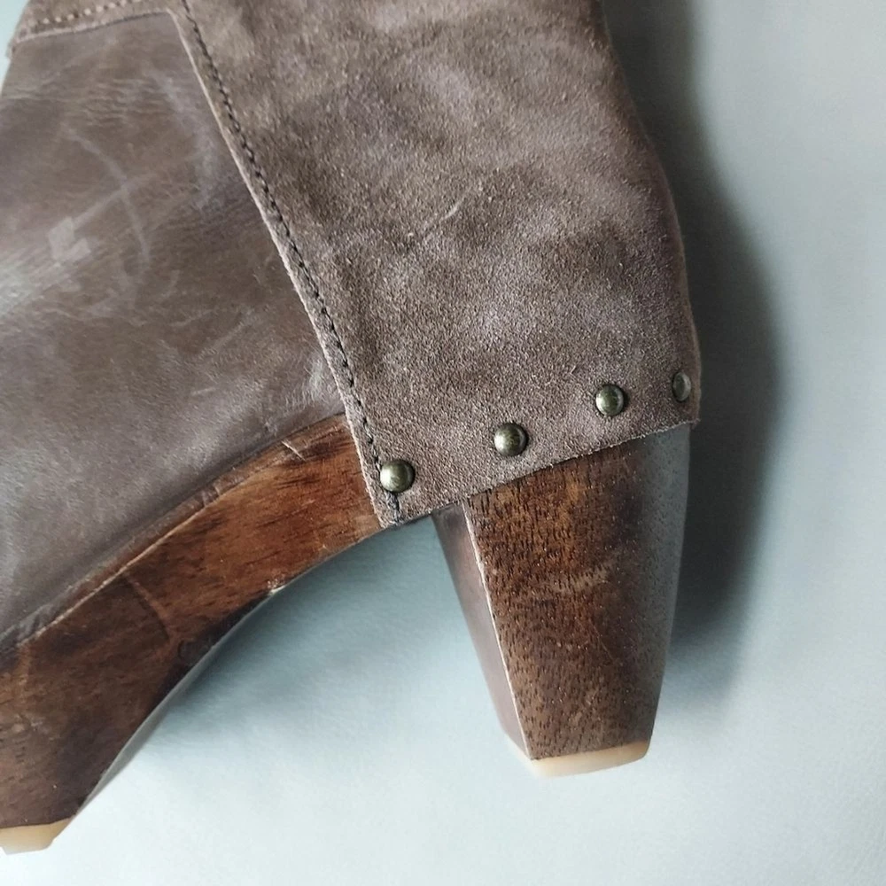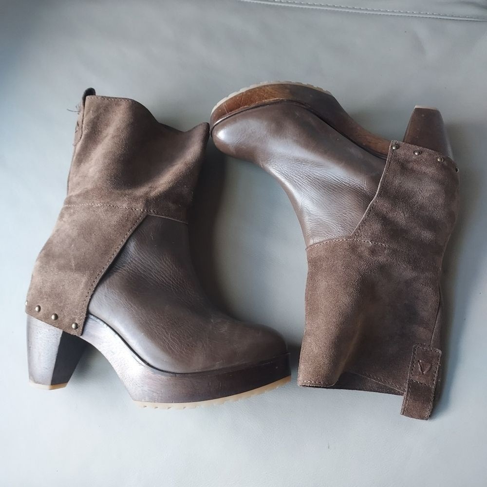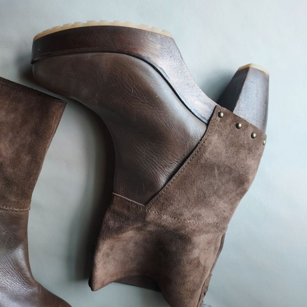 suede and leather platform booties wooden block heels Rubber sole round toe pull on tab scuffs on leather and minor scuffs on heels, see pictures, please