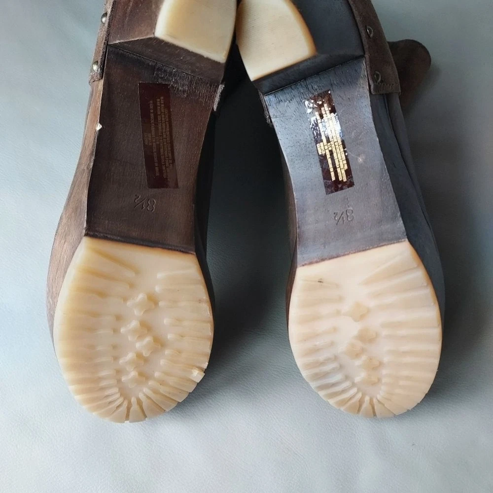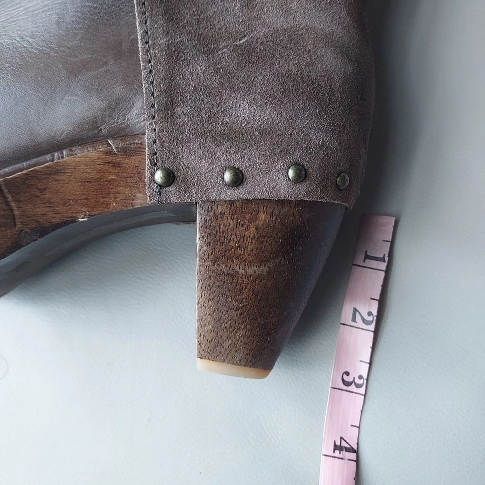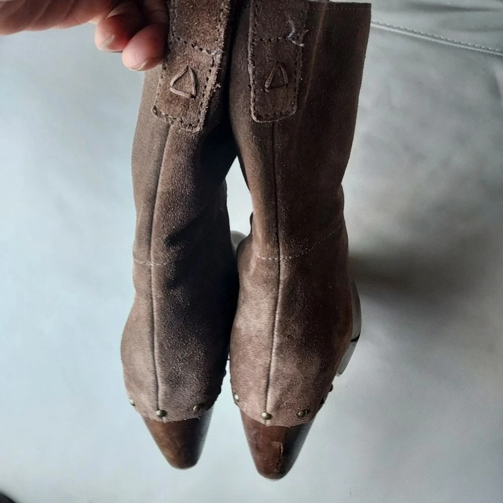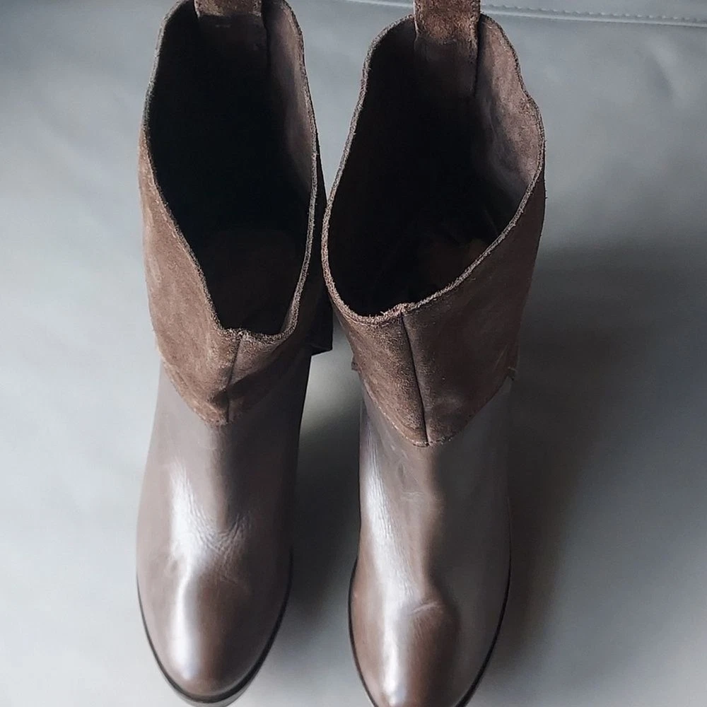 suede and leather platform booties wooden block heels Rubber sole round toe pull on tab scuffs on leather and minor scuffs on heels, see pictures, please