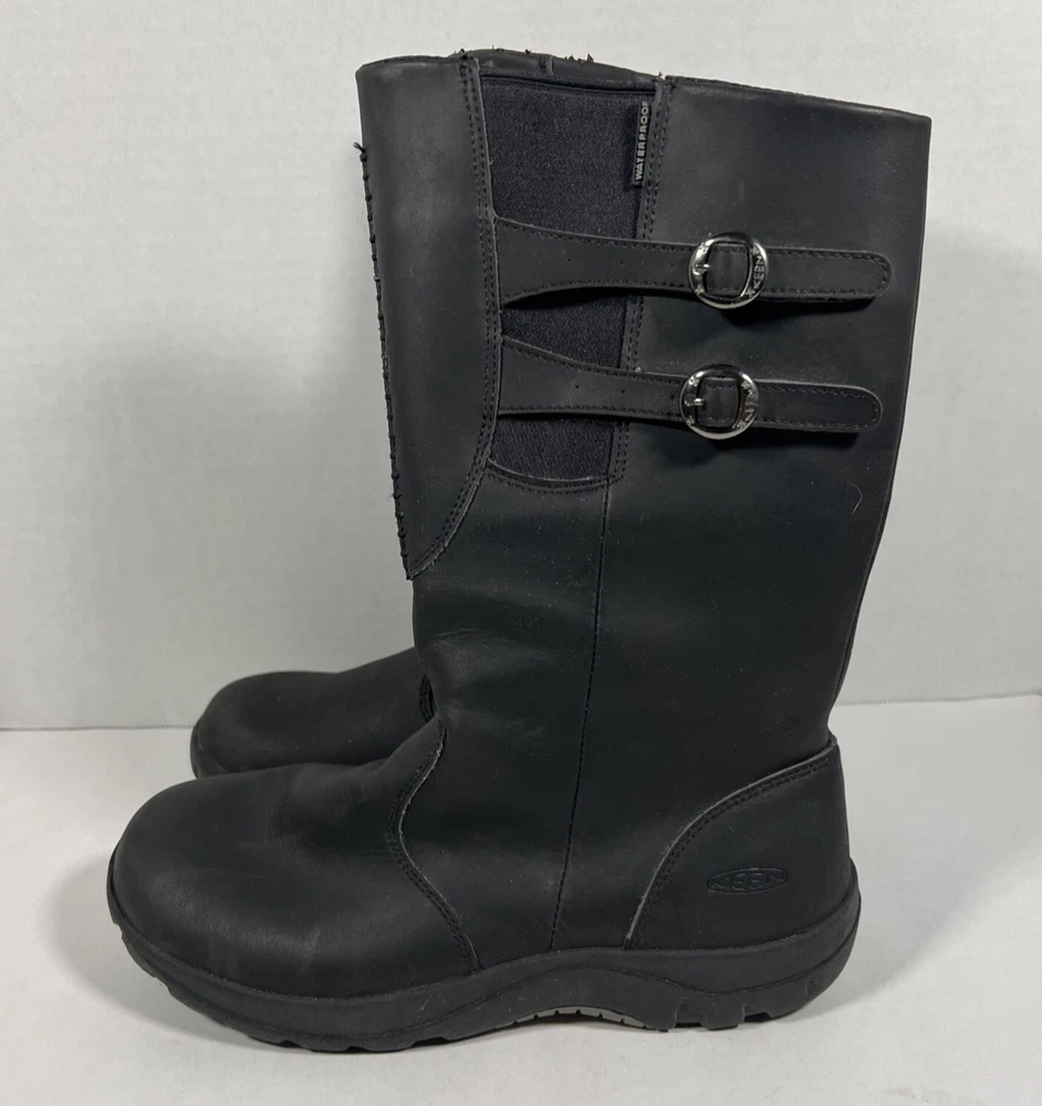 *Please review all photos closely before purchasing due to boots having signs of use and wear with some faint scuffs and marks to rubber sidewalls and leather exterior and right boot having some material loss on inner upper portion of front boot leather edge from being preowned to prevent return.* Elevate your winter style with these KEEN Bern Baby Bern boots. Made of black leather, these knee-high riding boots feature a buckle accent and logo detail. The boot has a side zip closure and standard shoe width, making it easy to put on and take off. Perfect for the colder months, these boots have a solid pattern and are suitable for women's US shoe size 5 and UK shoe size 4. The calf width is regular, ensuring a comfortable fit. These boots are a great addition to your winter wardrobe, providing both style and practicality. Zip Up Boots Keen Durable Original Classic Iconic Winter Wear Waterproof Leather Boots Travel Business Work Snow Dry Warm