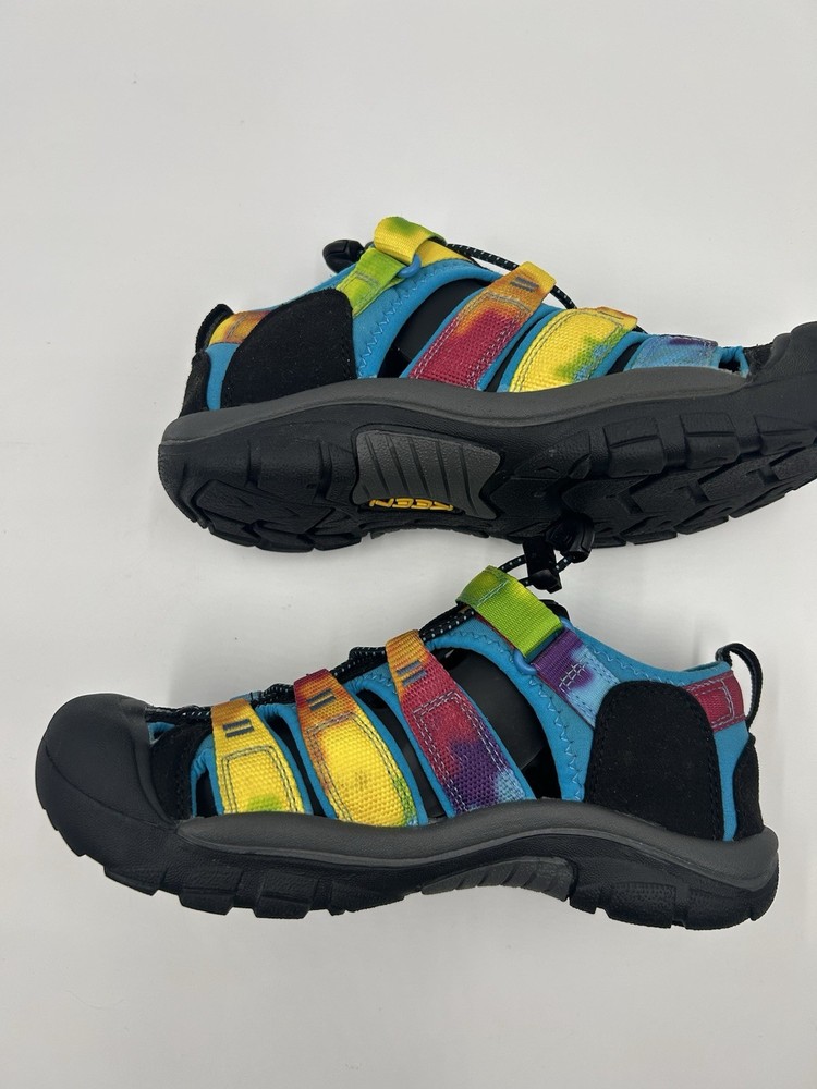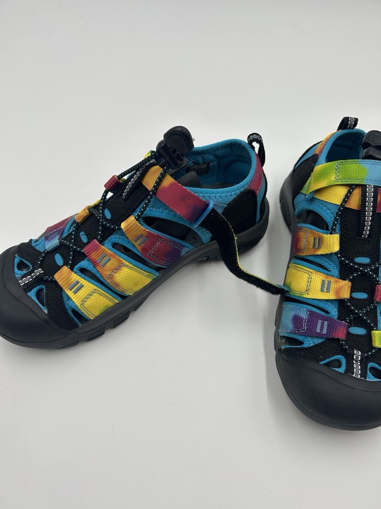 Step into colorful adventure with these KEEN Newport H@ Youth Sabndals inn a fun Rainbow Tie Dye design. These water-friendly sandals are perfect for outdoor play hiking or everyday wear. Designed with durability and comfort in mind, they feature: A quick-dry webbing upper in vibrant multicolor, closed toe protection, secure fit lace capture system with adjustable hook-and-loop strap, non-marking rubber outsole with multi-directional traction.Youth US 4 never worn without tags soles show no signs of use. Ideal for summer camp, the lake, trails, or everyday fun-these are a favorite among active kids and parents alike. Att D