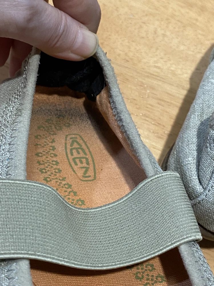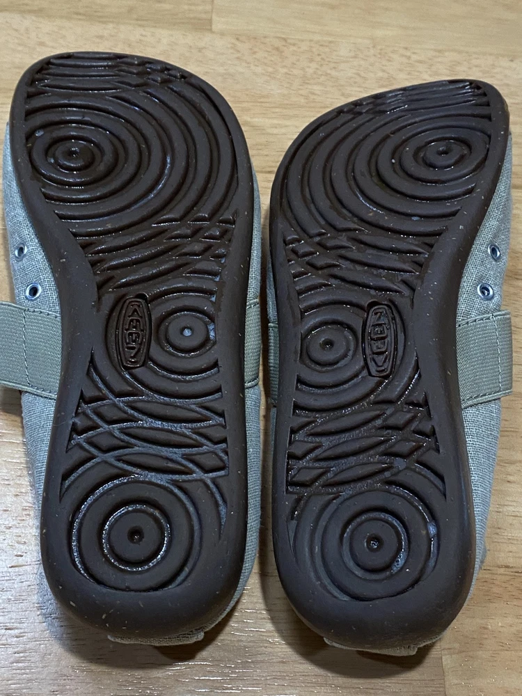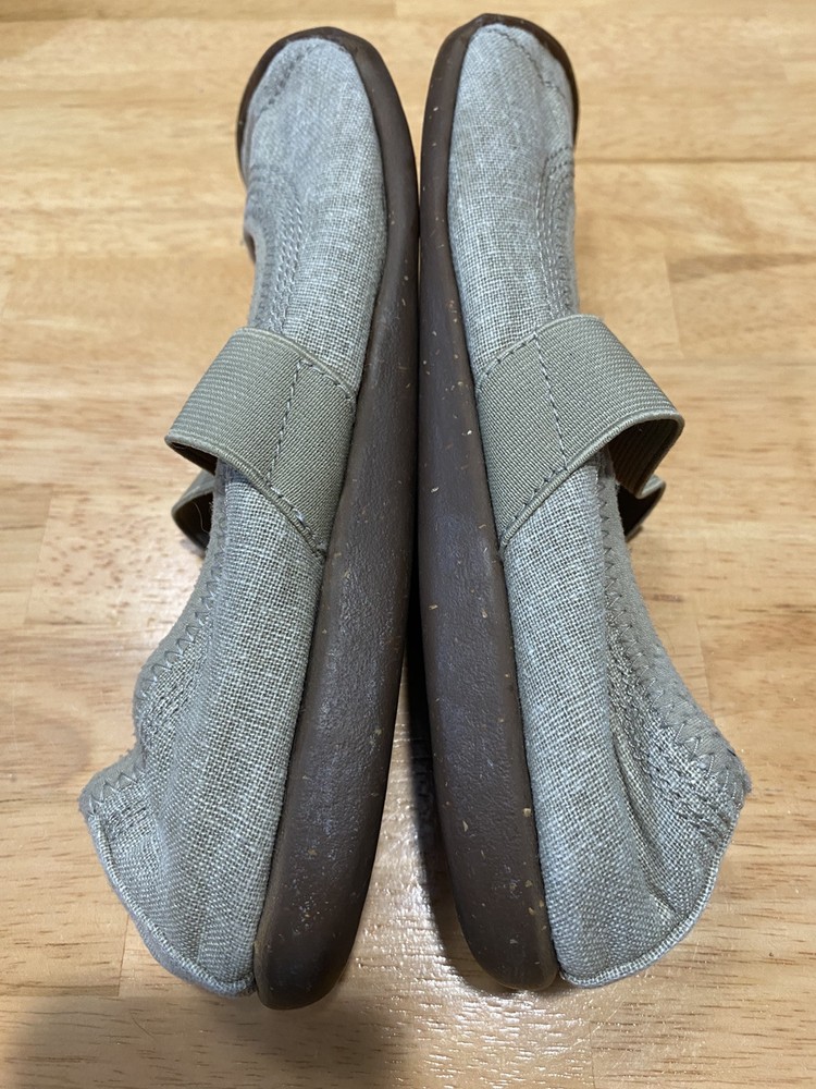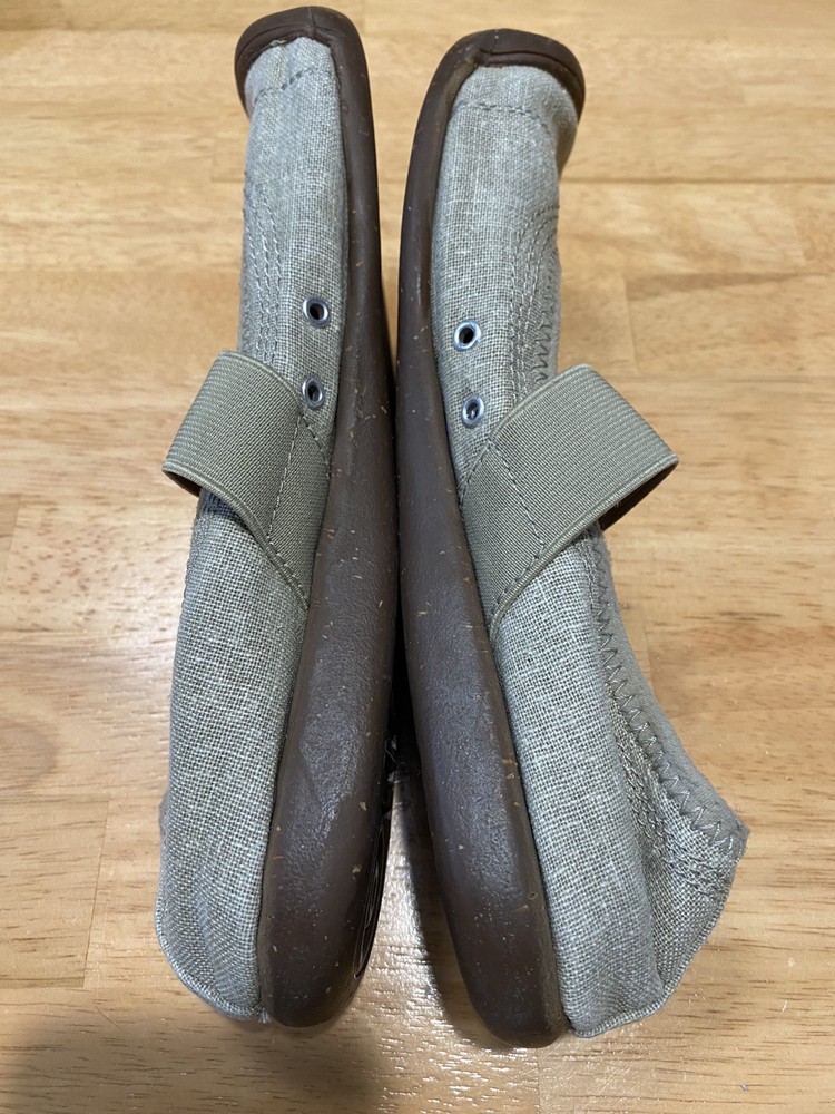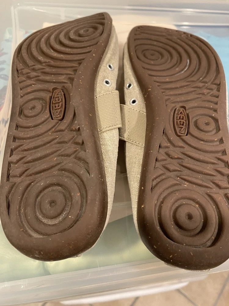 Shoes are in good used condition. Please look at all the pictures. Soles are brown, canvas is beige.