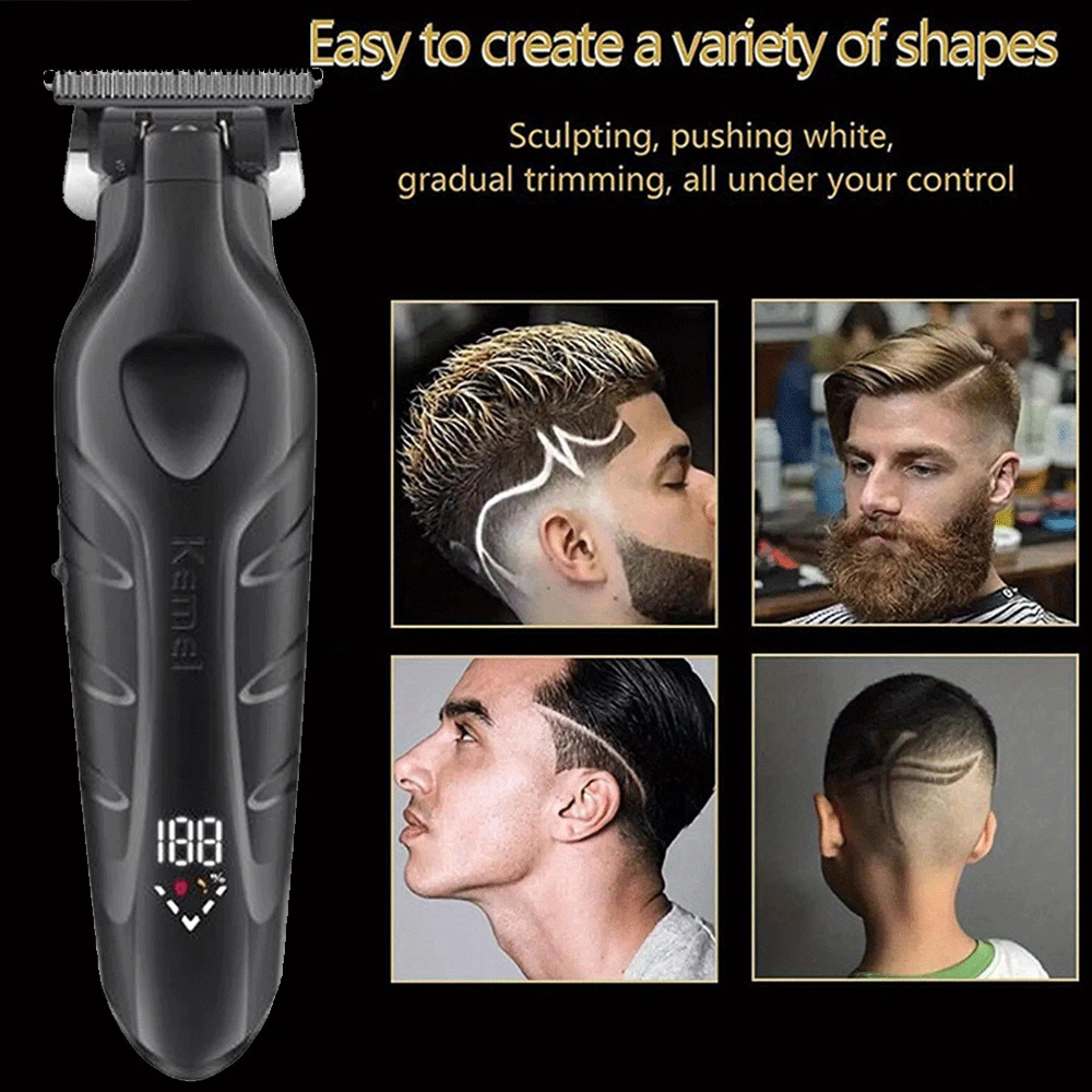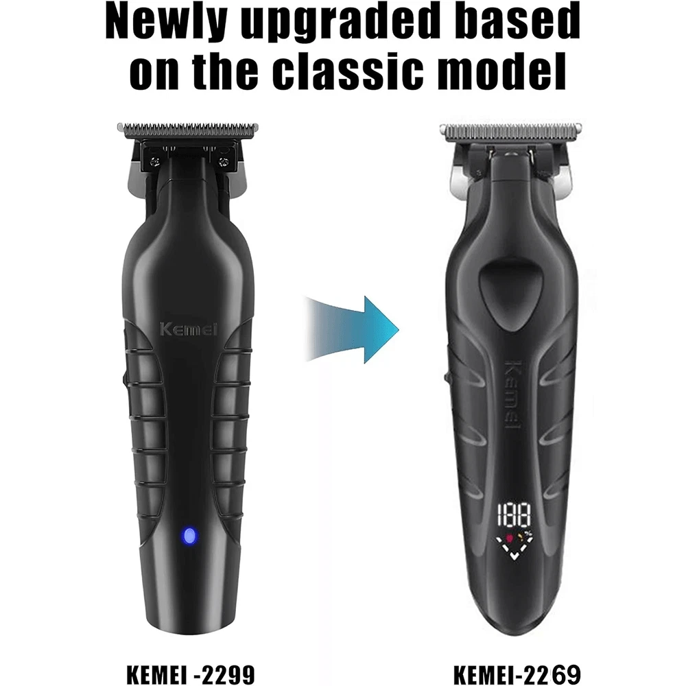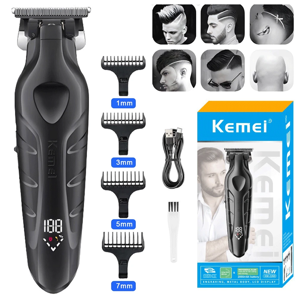 Description Model: KM-2269 Power: 5W Battery capacity: 2000mAh Charging time: 3 hours Usage time: 300 minutes Charging type: USB charging - Professional trimmer hair finishing machine designed for men, the Kemei KM-2269 features a high-performance T-Blade providing precise and smooth cutting. - Equipped with a powerful 7500RPM motor for fast and efficient trimming, ensuring a clean and sharp look in no time. - The digital LCD Display allows for easy monitoring of battery life and speed settings, enhancing user convenience and control. - With a USB Interface for quick and convenient charging, the Kemei KM-2269 ensures a reliable power source whenever needed. - Crafted with a durable and sharp ceramic blade, along with zero gap adjustment for maximum precision and cutting efficiency, making it the ideal choice for professional grooming needs. Package list 1 x machine 4 x limit combs 1 x brush 1 x charge cable Note: Due to the limitation of air transport, this product does not contain oil,Please understand. If you have any questions, please feel free to contact us, please do not leave any negative feedback, we will deal with it as soon as possible, thank you
