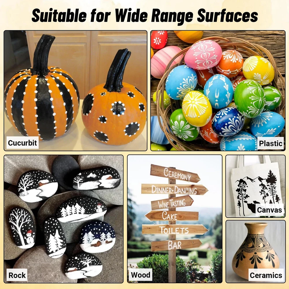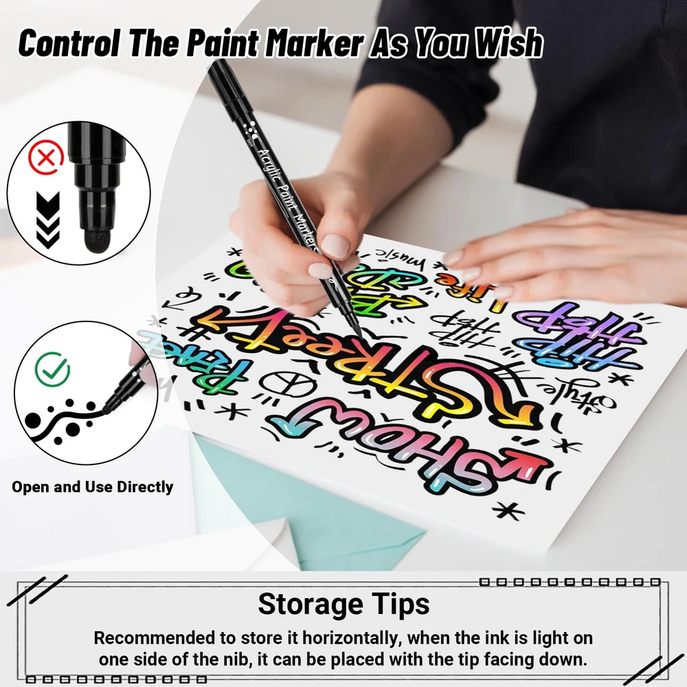 【Acrylic Paint Markers Dual Tip】The black and white acrylic paint pens feature a novel dual tip design, with a 0.5-5mm brush tip on one end for detailing, lettering, calligraphy, adjustable line thickness; and a 3mm round tip on the other end for large scale painting and coloring, making dots and thick lines. These black white acrylic paint pen can meet your creative needs to make your own DIY projects. 【Great for Lettering and Calligraphy】The black white brush pen can be used for lettering and handwriting, you can control the paint markers brush tip as you like to write interesting fonts, you can use it on vellum and cardboard, use it for labeling paper for label sorting, and use the white markers for black paper, for signing at work and in daily life. The round tip of the marker is suitable for embellishment and tracing, and can easily draw a variety of different sizes of dots at different pressures, which can give your art lettering more three-dimensional. 【Open and Use Directly】Those dual tip acrylic paint pens are easy to use, without and shaking or priming, just pop the cap and get to work. The white paint pens paint markers can be used on a variety of flat surfaces, the ink comes out smoothly, dries quickly, great for family fun, and easy for kids can be used as markers for rock painting or paint markers for wood. The colour will not change even if the DIY artwork you have created is left outside. 【Suitable for Mutil-Surfaces】black and white paint markers have great coverage and will show color when applied to rock, wood, glass, canvas, plastic, ceramics, cardstock and black paper. You can use them on dried watercolour paintings to depict your desired pattern or overlay colours. These white acrylic paint markers dual tip can be used as gifts for Easter, Halloween, Christmas, can be used to paint on stones, make Easter eggs and pumpkins. 【Tips for Storage and Use】When storing brush tip acrylic paint markers it is recommended to place them horizontally, to be able to have a more even powder on both ends, and it is recommended to test them in a test area before applying to avoid uneven ink application. Use the black and white acrylic paint pens on a smooth, non-absorbent surface, and if you accidentally make a mistake, wipe it off with alcohol or a damp cloth within 10s of marking. 【Purchase without Risk】Acrylic paint pens dual tip are made of water-based opaque ink, safe, non-toxic and odorless, the design of white paint pens for wood brings more convenience for creativity, help you paint, calligraphy, embellish and trace, ideal gift for kids, family, friends and workmates. If you have any questions before or after ordering, please contact us through "Message from buyer and seller".
