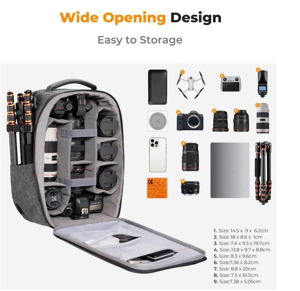 Dimensions: 17.3 x 11 x 7 inches. Capacity: 22 liters. This multifunctional rigid camera backpack is designed for different brands of DSLR/SLR/SLR/mirrorless cameras. Removable modular inserts as custom dividers for different cameras, flashes and lens. The back pocket is a laptop compartment that can store up to 15.6 inches of laptop. Fully open design: fully open front flap designed with hard case, which prevents your camera from hitting and scratching. Camera bag with 2 internal pockets for accessories that can store cables, SD cards, power bank. 1 hidden zippered pocket on the back for your phone, wallet and other small items you need to store. The tripod holder comes with 1 secure strap on one side of the bag. 1 pocket on the other side can store umbrella or water bottle. Front hard shell protection: this rigid camera backpack is made of EVA rigid cover, all in one piece, the padded foam layer can provide good cushioning and protection to your internal things against bumps and drops. Comprehensive protection for your camera and drone equipment. Easy-to-use design: Ergonomically breathable padded mesh back panel and shoulder strap (adjustable from 20 to 38.9 inches) are designed for comfortable carrying, distribute weight evenly and reduce the load on your shoulder. Elegant camera bag: the back belt makes it convenient during the trip. Our camera bags are perfect for travel and offer practical features for the photographer and camera enthusiasts. If you have any questions about the product, do not hesitate to contact us.