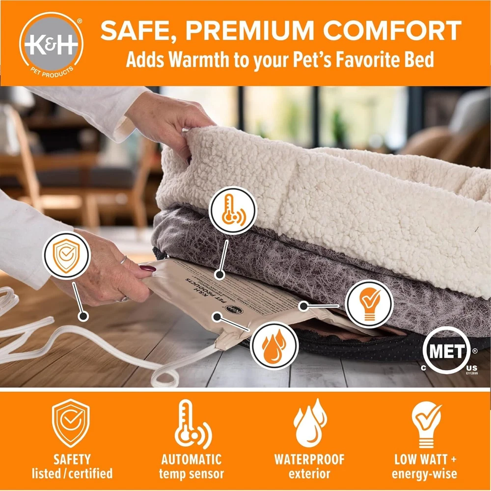 K&H Pet Products Bed Warmer, Turn Any Into a Heated Cat or Small Product Details Brand: K&H Pet Products Breed Recommendation: Small Special Feature: Heating Material: Vinyl Product Dimensions: 10"L x 9"W CAT CALMING TEMPERATURE: This safety listed low wattage thermostatically controlled cat bed warmer automatically adjusts to the purr-fect temperature for pets, unlike human warmers that can harm pets; it's the cat melatonin for cat beds PET BED WARMER USE: Simply insert the waterproof pet heating pad into your pet's favorite dog bed or cat bed to create a pet warming oasis; the small is the perfect cat accessory for round cat beds, cat couches, cat caves, or any small dog bed AUTOMATIC HEAT CONTROL: The heated pet warmer is thermostatically regulated to automatically adjust to your pet's natural body temperature when they are in the bed, and stays slightly above the ambient air temperature when the bed is empty SIZE & ENERGY-EFFICIENT: K&H Small Pet Bed Warmer measures 9" x 8½", making it perfect for small pet beds, and it uses only 4 watts of power, ensuring low energy consumption while providing cozy warmth for your pet SAFETY LISTED: K&H products are safety certified, providing peace of mind with electrical safety standards that go beyond UL safety requirements; we don't just use safety-listed parts, we safety certify the entire product, ensuring unparalleled safety COLORADO BRAND YOU TRUST: Designed by K&H with over 25 years of experience in creating safe, innovative, quality products for pets, ensuring safe reliability and top-tier craftsmanship for pet parents