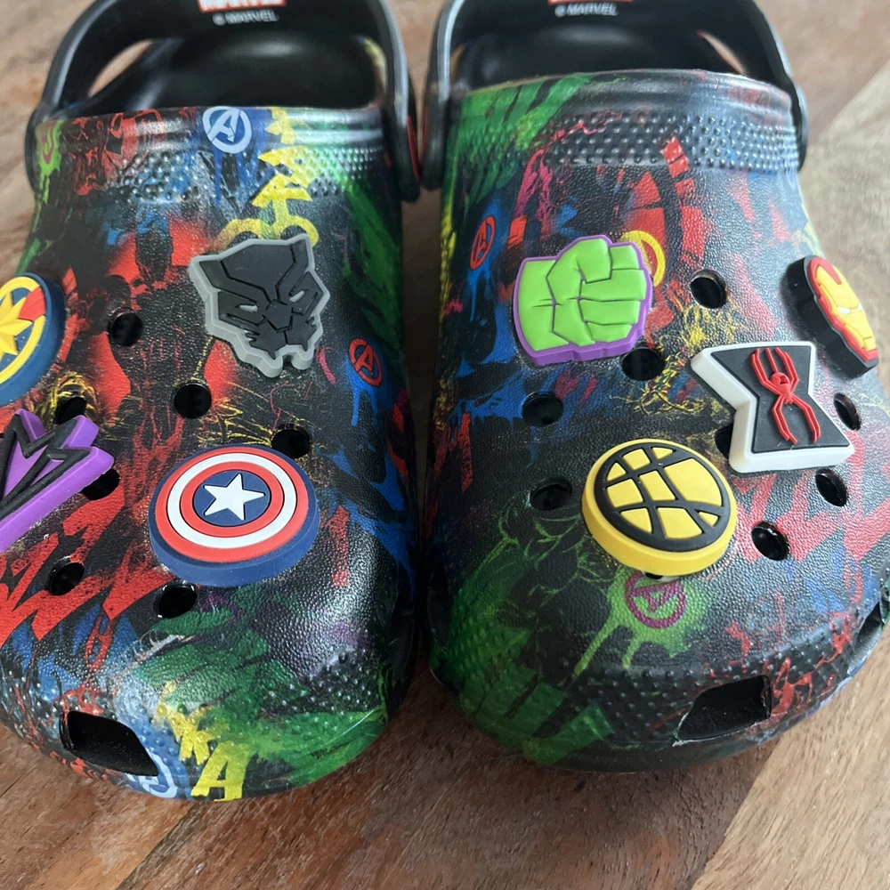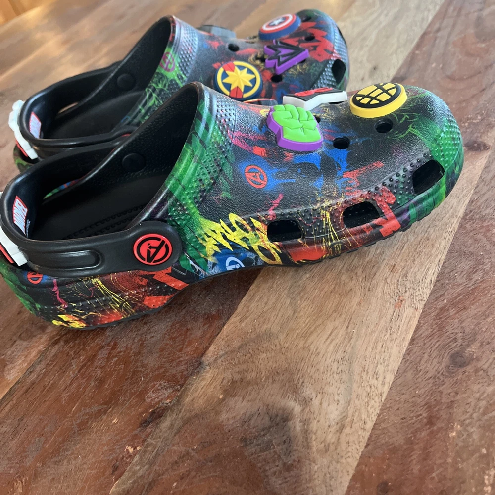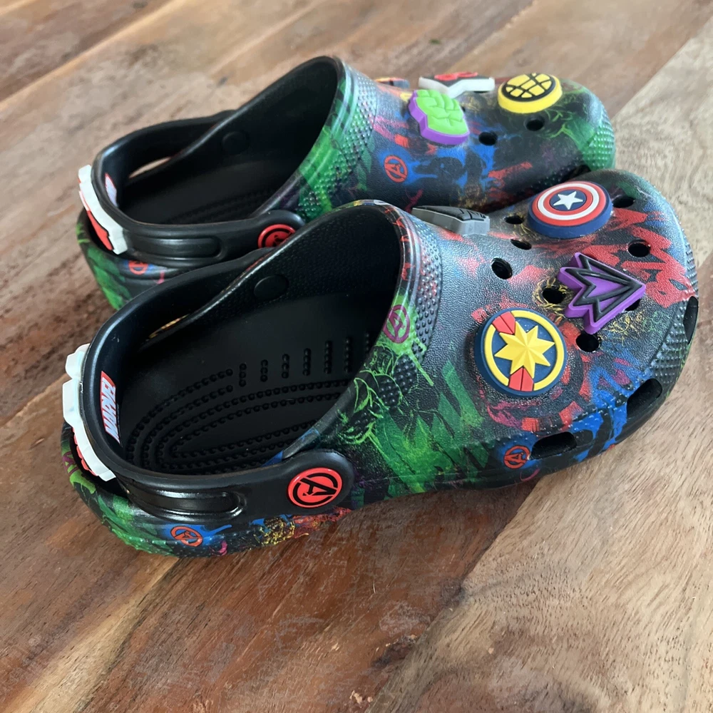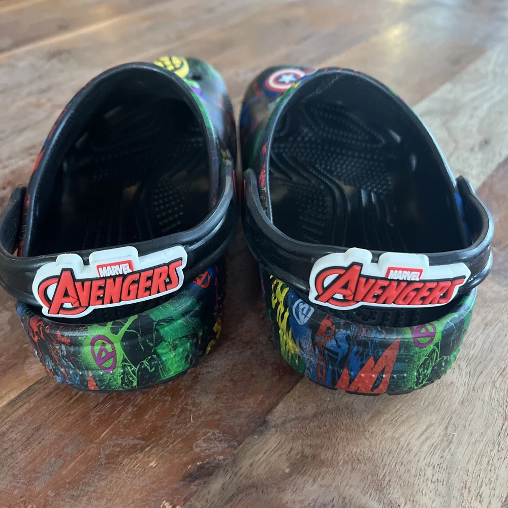The product is a pair of kids' clogs made by Crocs. The design features the Marvel Avengers Funlab design. The clogs are size 2 and are suitable for both boys and girls. New without box or tags.