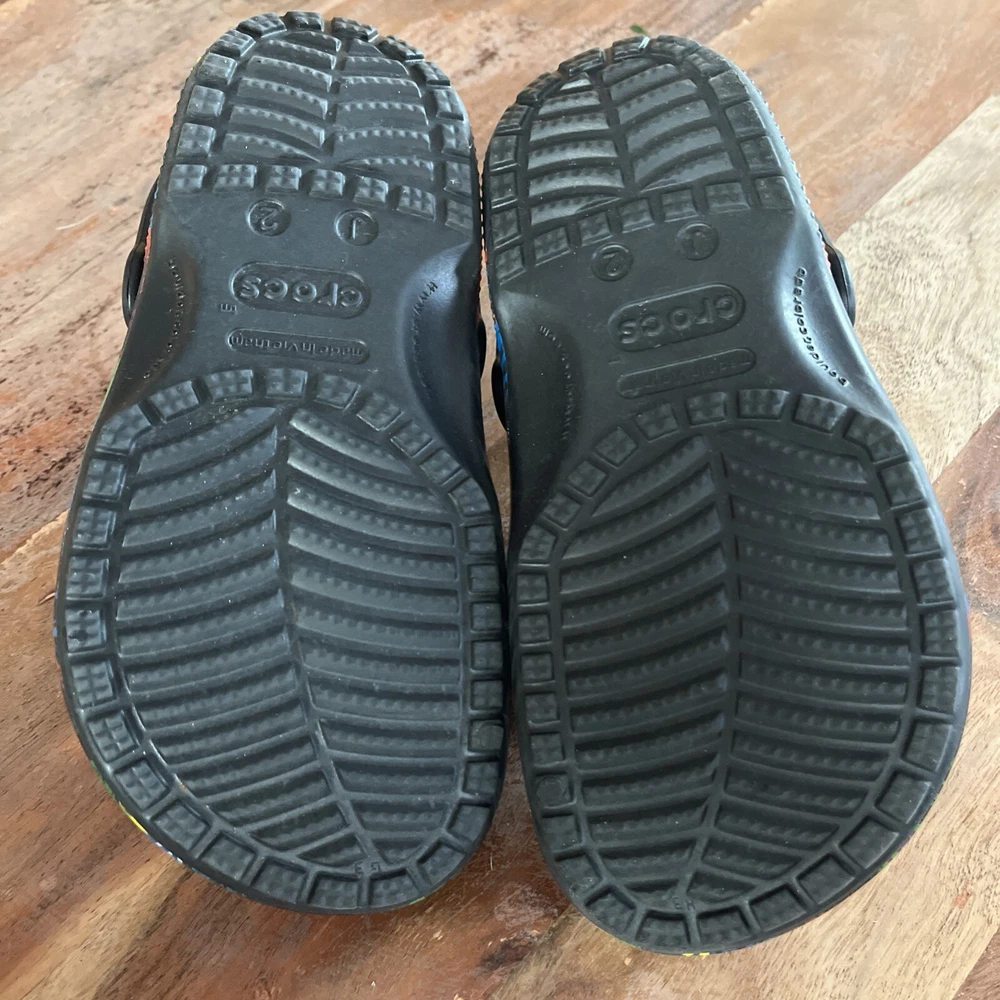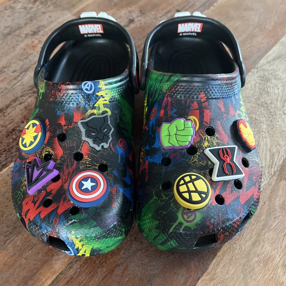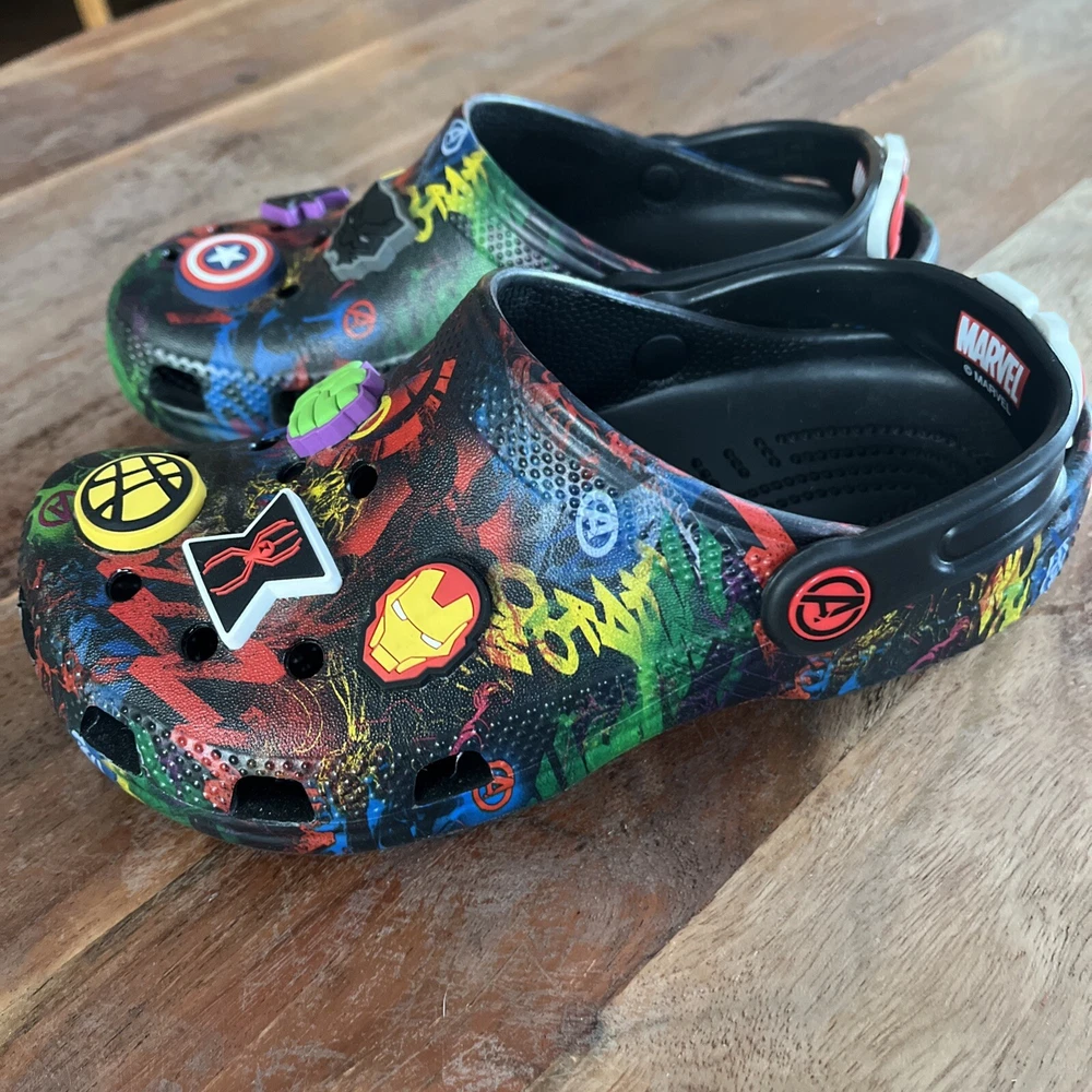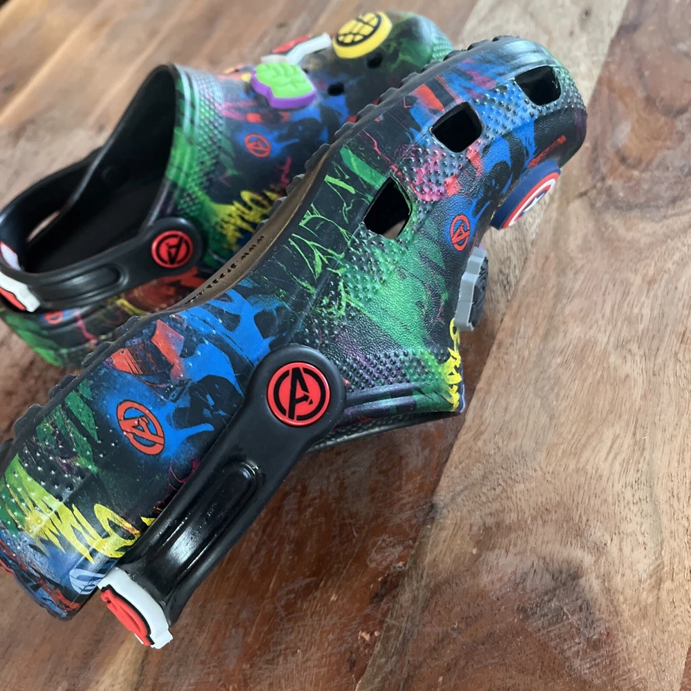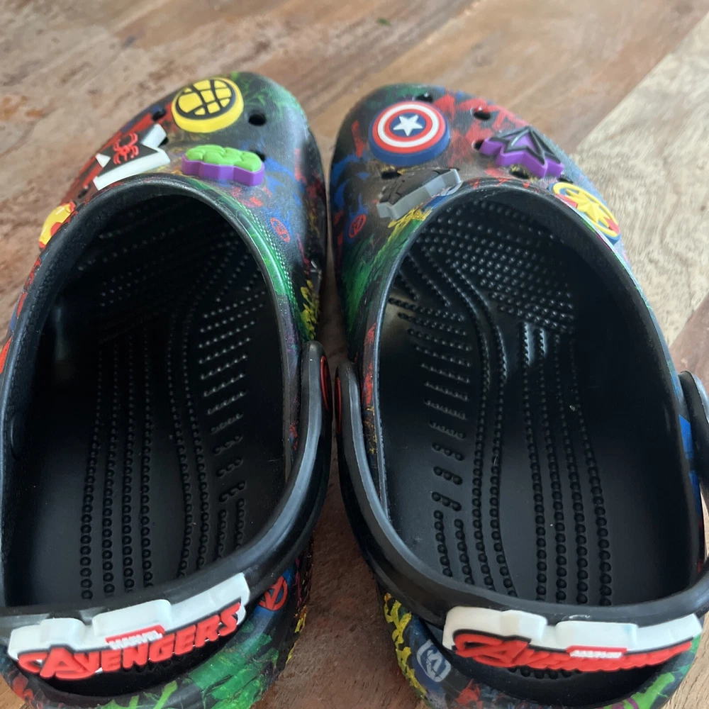 The product is a pair of kids' clogs made by Crocs. The design features the Marvel Avengers Funlab design. The clogs are size 2 and are suitable for both boys and girls. New without box or tags.