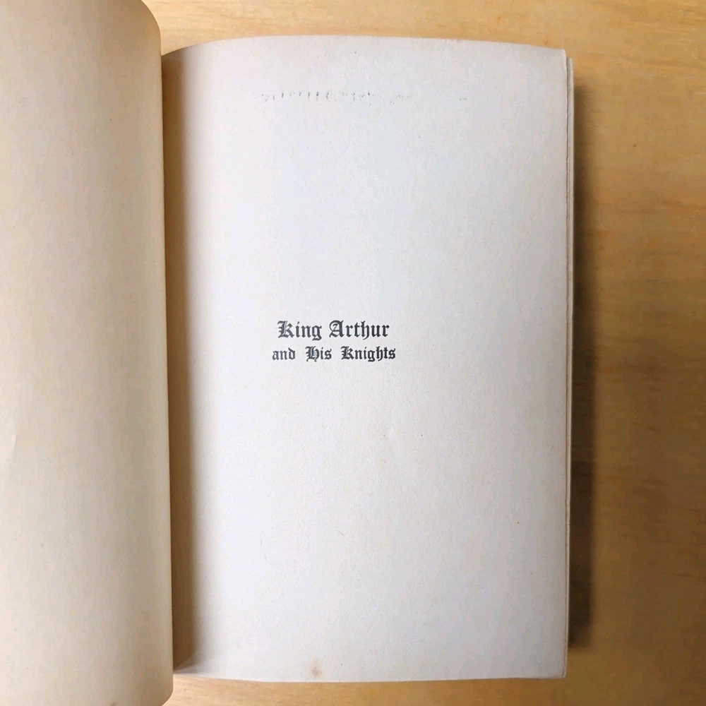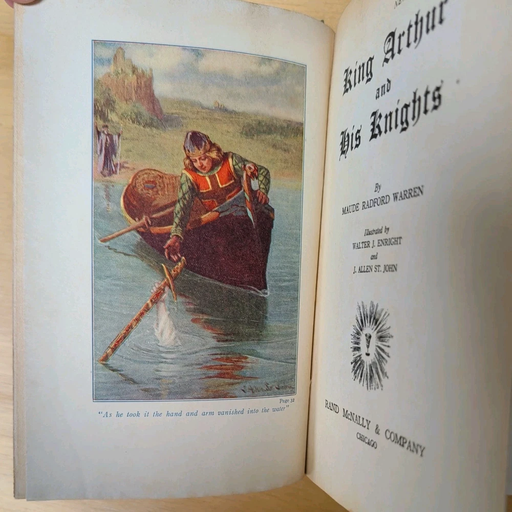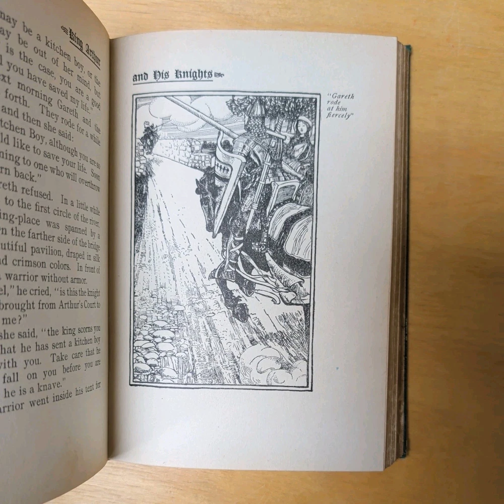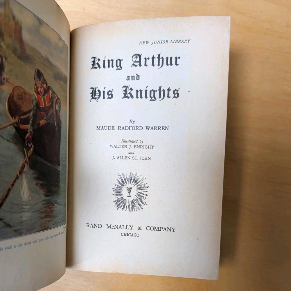 The product is a first printing of "King Arthur and His Knights" from 1916, featuring illustrations in black and white as well as 8 color plates. Published by Rand McNally, it is a first edition thus and the green cloth cover with blind stamped decor is worn at corners. The book is in good condition with very good boards and spines, including the frontispiece. The pages are toned with very sparse modest thumbing but are straight, and the binding is tight. The book also includes a gift inscription on the front end.