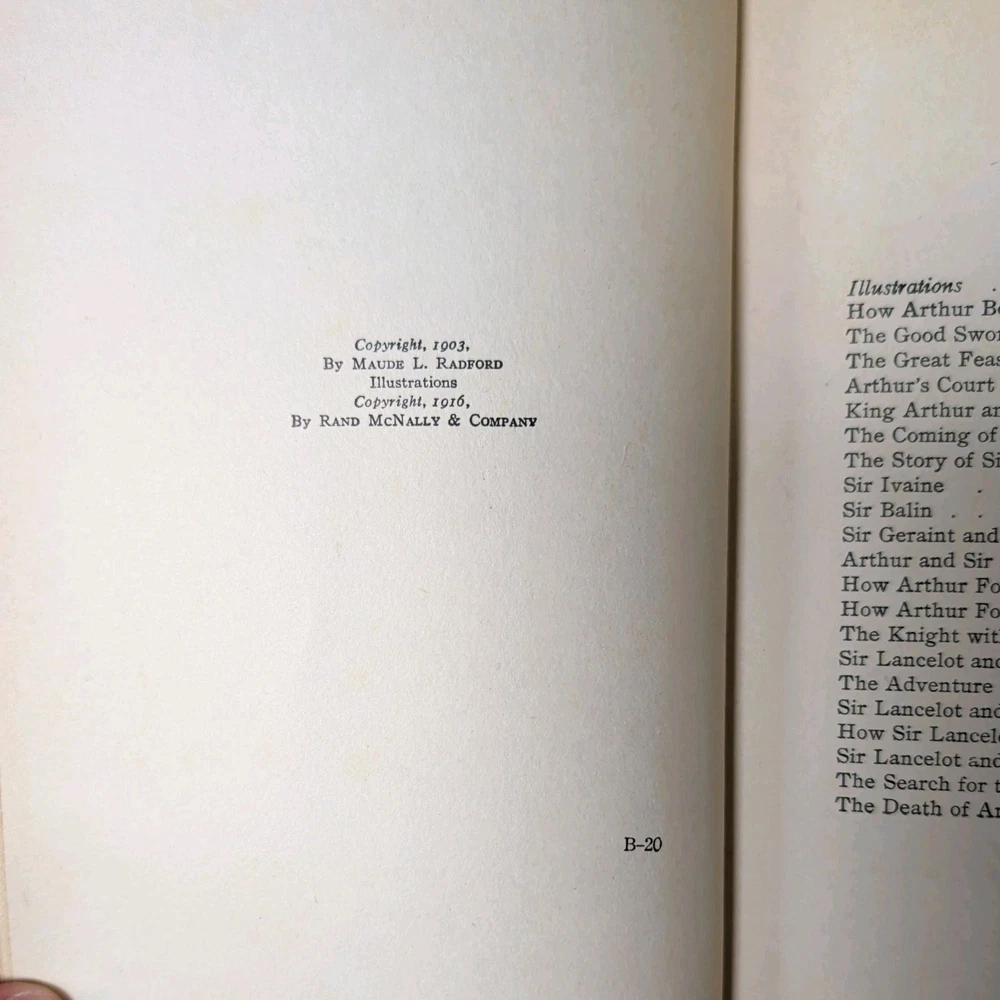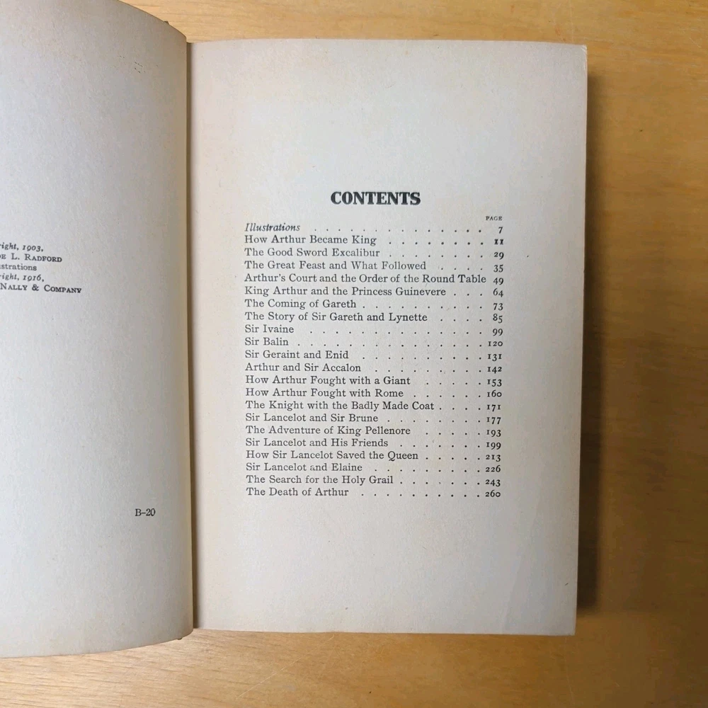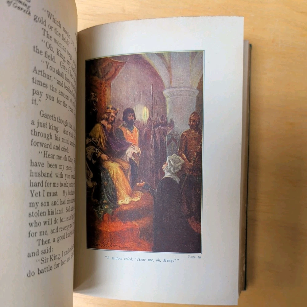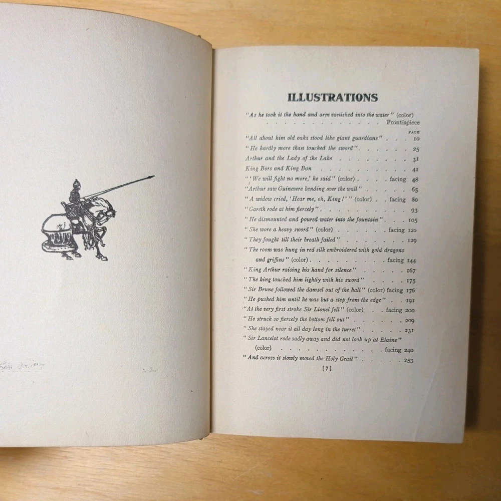 The product is a first printing of "King Arthur and His Knights" from 1916, featuring illustrations in black and white as well as 8 color plates. Published by Rand McNally, it is a first edition thus and the green cloth cover with blind stamped decor is worn at corners. The book is in good condition with very good boards and spines, including the frontispiece. The pages are toned with very sparse modest thumbing but are straight, and the binding is tight. The book also includes a gift inscription on the front end.