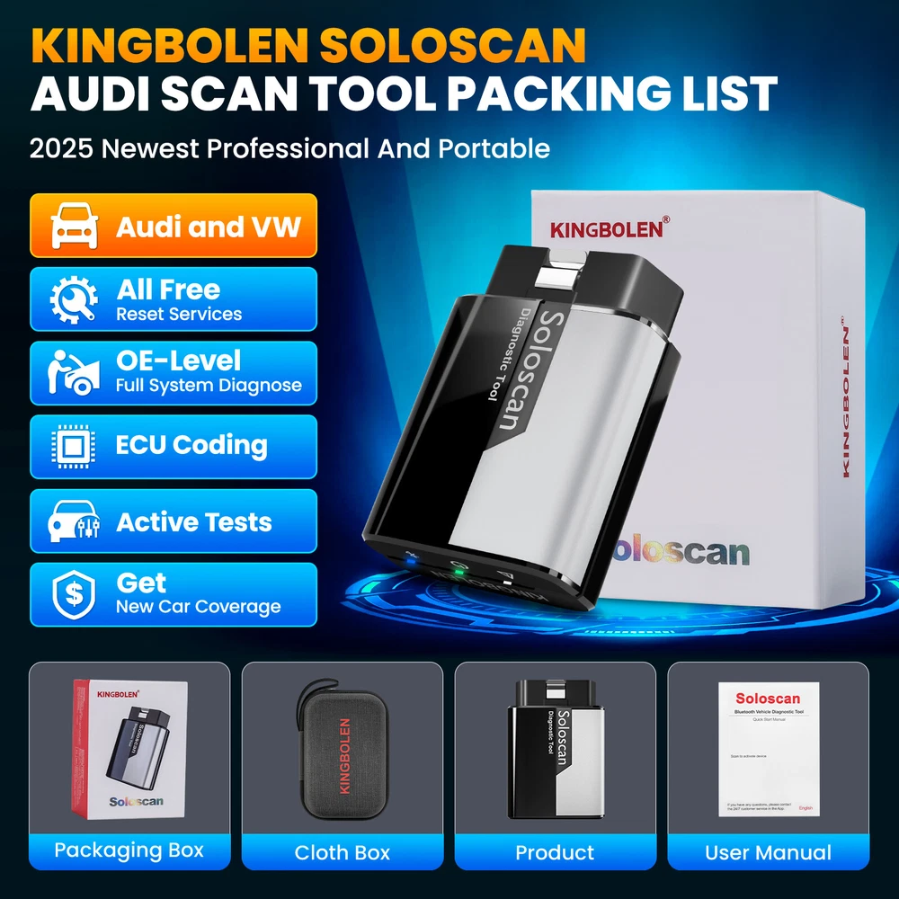 NEW Arrival ---HOT Soloscan Lifetime Free Update All System OBD2 Scanner Full Car Manufacture Brands Softwares + ALL Reset Functions + ECU Coding +BI -Directional (Active Test) +Auto VIN FOR AUDI 🔥🔥🔥Lifetime Free Update ,Best choose for DIYer Why Is The Kingbolen Soloscan Diagnostic Scanner Tool Is So Powerful And Reliable? 1,Lifetime Free update 2,Advanced ECU Coding 3,Full Bidirectional Control 4.Lifetime Free WiFI Updates 5,OE-Level Full Systems Diagnosis 6,Useful All Special Reset 7,Full OBD2 functions for All Cars 8,Auto Vin & Auto Scan for quick diagnostics 9,One-Click Automatically Generate Health Reports in a local file 10,4-in-1 Graphing Merge Display 11,Data Record, Replay & Screenshot; Diagnostic Report Share and Print 12,Online Feed-back; Battery Voltage Monitor 13,DTC LookUp and etc. 14,22 Languages option, including English, French, Spanish, German, Italian, Portuguese, Japanese, Russian, Polish, Traditional Chinese, Turkish, Greek, Korean, Hungarian, Dutch, Vietnamese, Arabic, Persian, Khmer, Lao, Burmese, Thai Supports 22+ Languages : English, French, Spanish, German, Italian, Portuguese, Japanese, Russian, Polish, Traditional Chinese, Turkish, Greek, Korean, Hungarian, Dutch, Vietnamese, Arabic, Persian, Khmer, Lao, Burmese, Thai Support 99% Car Modles (Cover 100000+ Models ) For OBDII diagnostics, the obd2 code reader works great for most cars built in 1996 or later, being compatible with following protocols: -ISO 14230-4 (KWP2000) -ISO 15765-4 (CAN) -ISO 9141-2 (iso) -ISO 14229 (uds) -SAE J1850 (VPW & PWM) -Original protocols of makers OE-LEVEL All Systems Diagnostic(Lifetime Free update ) can perform OE-level diagnostics on all systems,such as ABS,SRS,Engine,Transmission,Wiper,Seat,EPB,TPMS,Body System,AWD,Door Lock System, Battery,ESP, Parking Sensor, Cruise Control, Instrument, etc. Support ALL Maintenance Functions:(Lifetime Free update ) 1.Oil Reset Service 2.Steering Angle Calibration 3.Electronic Parking Brake Reset 4.Battery Register & Battery Maintenance 5.ABS Bleeding 6.Electronic Throttle Position Reset & Learn 7.Diesel Particulate Filter (DPF) Regeneration 8.Tire Pressure Monitor System Reset 9.Anti-theft Matching 10.Injector matching 11.Air Suspension Reset 12. Gearbox Reset 13.Sunroof RESET 14.AFS Reset 15.EGR Reset 16.Seats Calibration 17.Tyre Reset 18.Coolant Bleed 19.AdBlue Reset (Diesel Engine Exhaust Gas Filter) 20.NOx Sensor Reset 21.Ac System Initialization 22.High Voltage Battery Detection 23.Windows Calibration 24.Language Change 25.AF Reset 26.Transport Mode 27.StoplStart Reset 28.Intelligent Cruise Control System Reset 29.Engine Power Balance Monitoring 30.Gas Particulate Filter (GPF) Regeneration 31.Motor Angle Calibration Updating.... ECU Coding (Customize) Lifetime Free Update ECU CODING allows you to match the replaced components with ECU, flash hidden functions for AUDI. No matter you are private owner or professional technician, Thinkdiag is a powerful and handy scanner tool. Uses the Ediag App to modify the adaptive data for vehicle control modules, after repairs or replacements of vehicle parts including: [ Power Window | Illuminated Entry | Warning | Light Control | Slide Roof | Air Conditioner | Display | Unit Conversion | Entry & Start | PSD & PBD Operation | Seat … ] Bi-Directional(Active Test) Lifetime Free Update Test the actuator. The decoder can be used to send instructions to the actuator through the vehicle APP and execute the corresponding actions. For example, the injector sprays oil, the throttle opens, the radiator fan runs, etc Support 10 OBD2 Full Function(Lifetime Free update ) This diagnostic software can test vehicle Engine systems.All models with engine meeting SAE J1850,ISO9241-2,ISO14230-4,ISO15765 Standard in OBD2&EOBD. 1.View freeze frame date 2.support graph data stream 3.O2 Sensor test 4.Evap system test 5.On-Board monitor test 6.Read & Clear DTCs 7.Identify VIN information 8.DTC code look up 9.Turn off MIL(Malfunction Indicator Lights) 10.I/M Readiness status test KINGBOLEN SOLOSCAN OTHER FUNCTION : 1. Auto VIN Scan 2. 4-in-1 Live Data Stream 3. DTC Look up 4. Remote Diagnose Function 5. Diagnostic Report 6. Diagnostic Report print & Share 7. Online Repair Sources Support Mobile Phone & Tablet Computer Android: 4.0, IOS: 9.0 KINGBOKEN Soloscan OBD2 Diagnostic Tool is suitable for Mobile phones, tablet computer that meet the above version information. When the adapter is connected to the car, you only need to detect and diagnose your vehicle through the mobile phone's Bluetooth 4.2 and APP. It is suitable for most DIY car owners and maintenance and repair car stores on the market. KINGBOLEN SOLOSCAN Parameter : Supported systems: (Android 5.0/iOS 9.0 or above) Bluetooth: Version 5.2 Storage temperature: -20°C-60°C Working temperature: -10°C~50°C