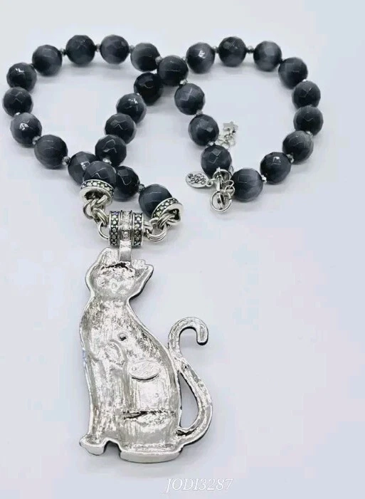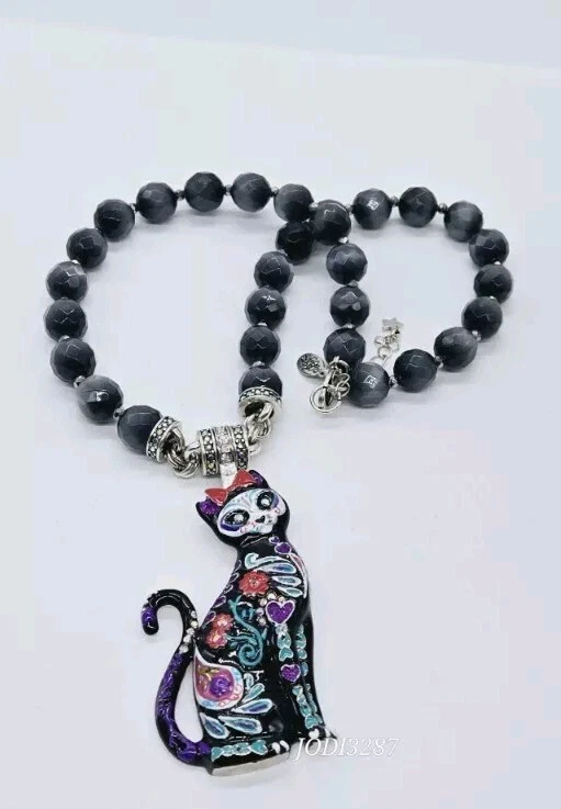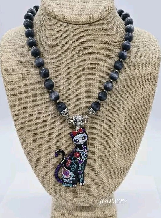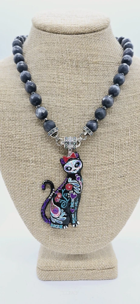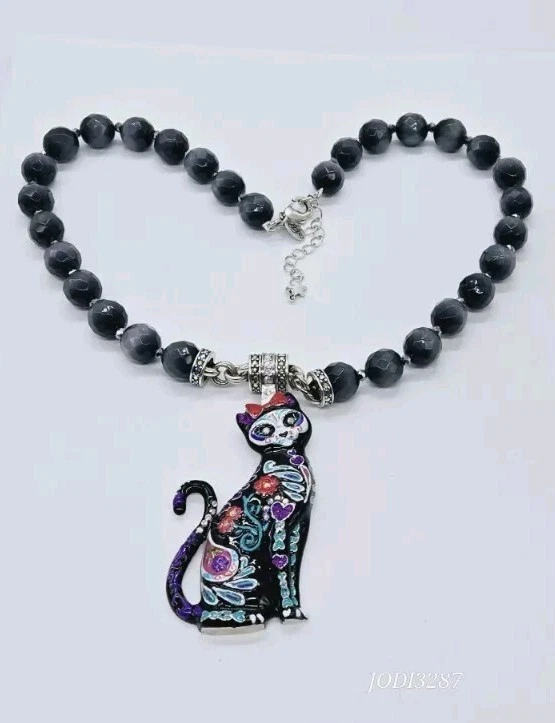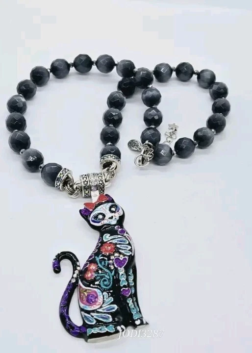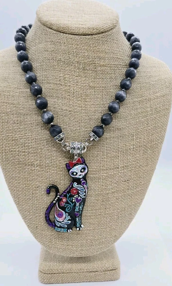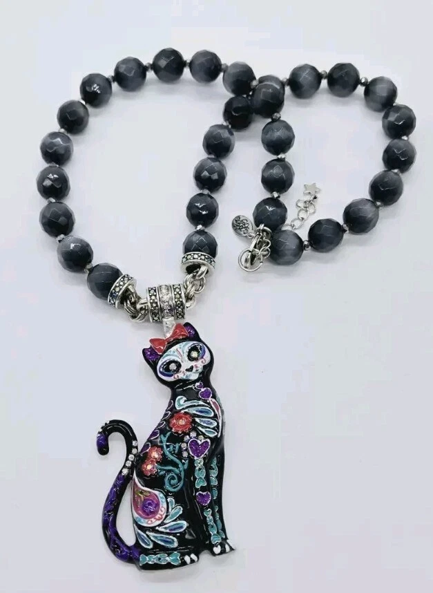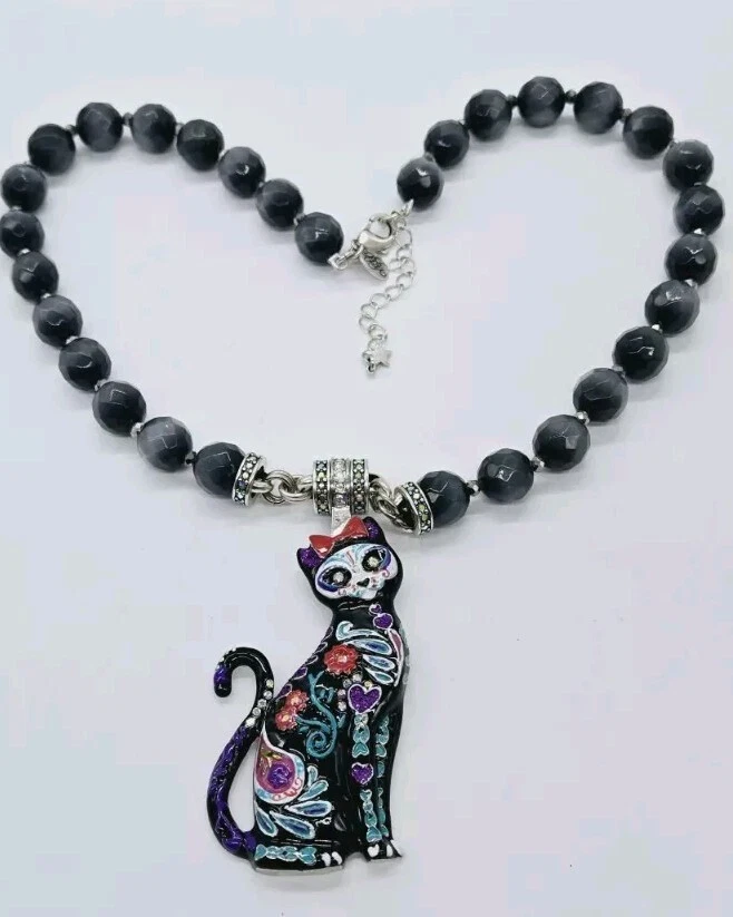 Similar to the details on infamous Sugar Skulls, the Sugar Cat Magnetic Enhancer displays the same remarkable colors and designs. The sweet and quizzical face of the cat is mesmerizing as are the brightly colored hearts, flowers and leaves on the body of the cat. Wear her to top off a Halloween costume or as a simple display of the love of cats! Kirks Folly Magnetic Enhancers Can Only Be Worn With Kirks Folly Magnetic Necklaces. Plated Silver tone. Measures approximately 1 1/2" wide x 3 1/4" long. Kirks Folly Magnetic Enhancers Can Only Be Worn With Kirks Folly Magnetic Necklaces. This magnetic enhancer necklace is created from large stormy grey Cat's Eye beads that glisten like moonlight dancing upon the water. Each faceted bead captures the essence of a magical night sky, as if concealing secrets whispered by the winds and shadows. These multi faceted beads appear to be created in the realm of the unknown, where dreams and reality converge in a cosmic dance of enchantment. Plated Silver Ox. Measures approximately 18" long with a 2" extender chain.