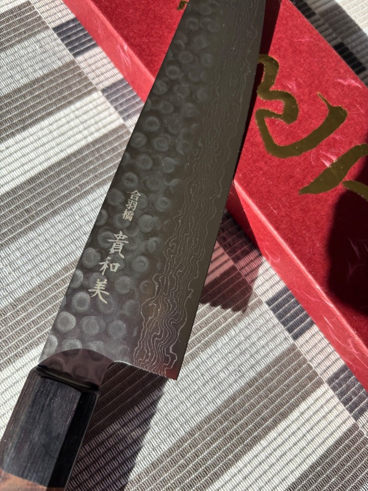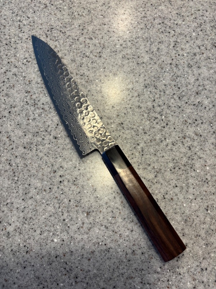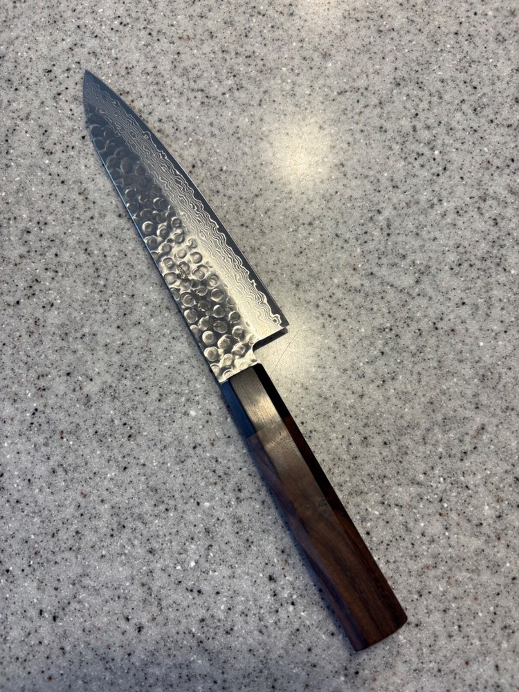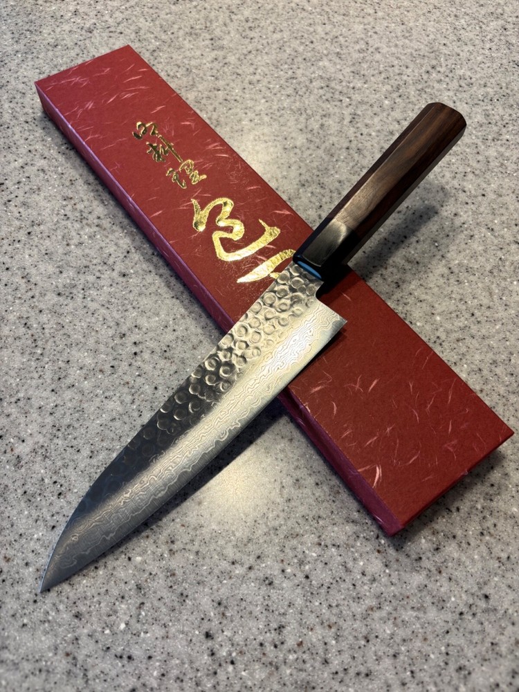 The KIWAMI Hammered Damascus 45-layer damask steel Gyuto Knife 180mm is a high-quality chef's knife designed by the brand KiWAMi in Japan. This knife is crafted with traditional Japanese techniques using 45 layers of Damascus steel, resulting in a beautiful and durable blade. The Gyuto knife is versatile and commonly used for various kitchen tasks such as slicing, dicing, and chopping. The hammered finish adds a unique aesthetic appeal to the knife, making it a functional and stylish addition to any kitchen.