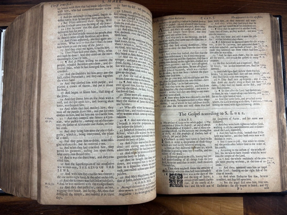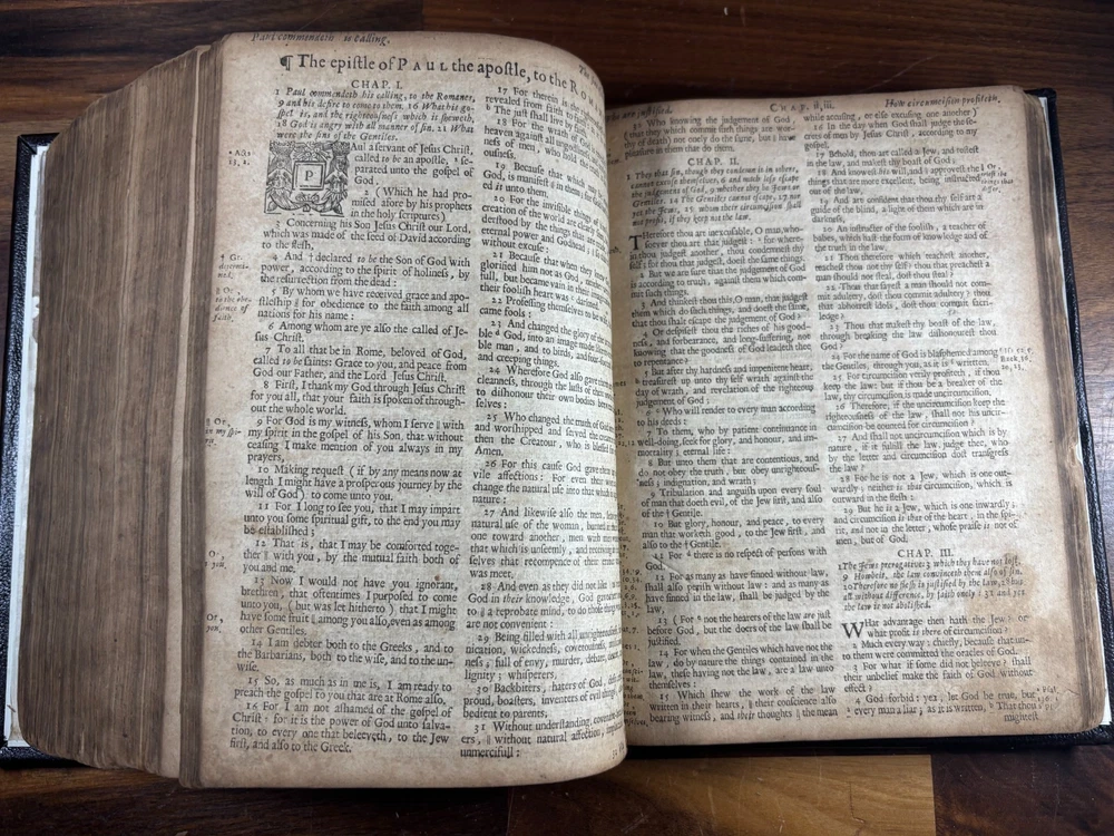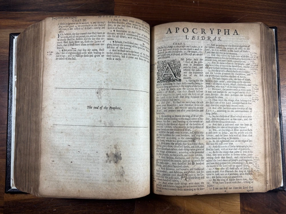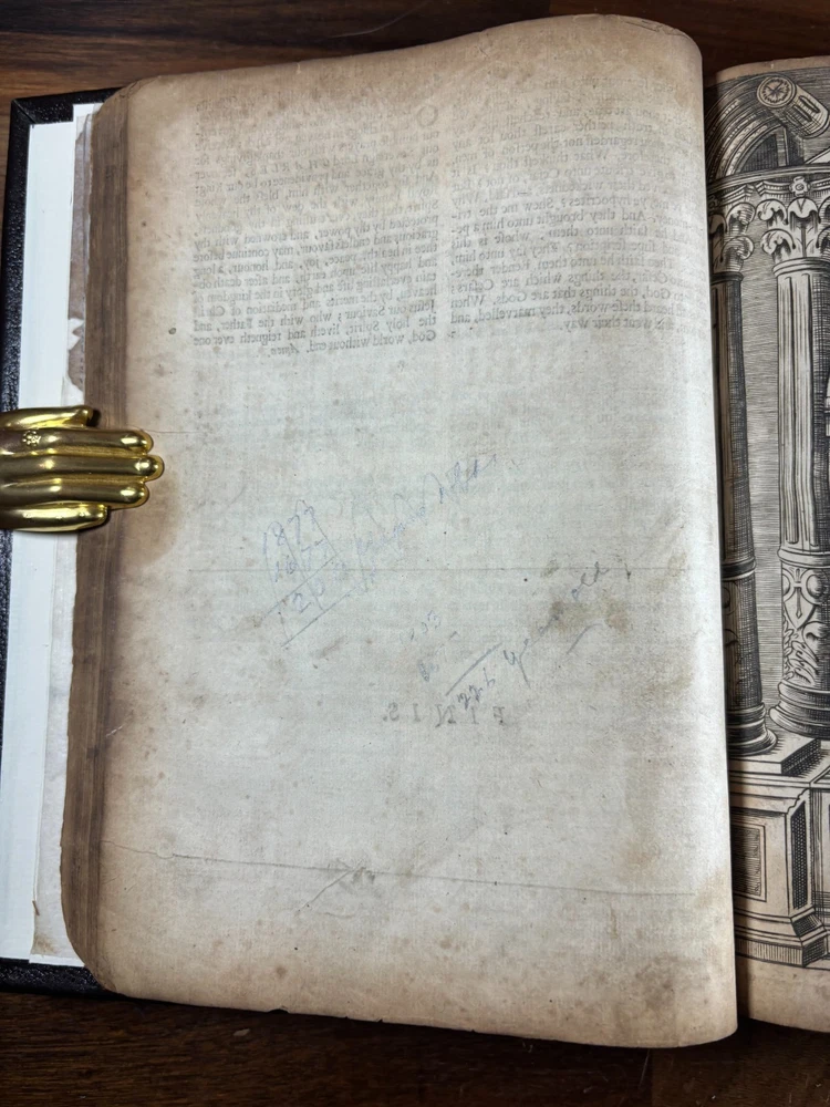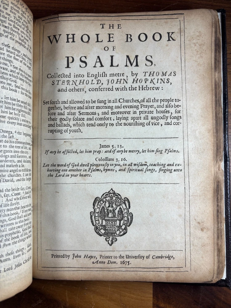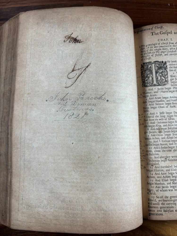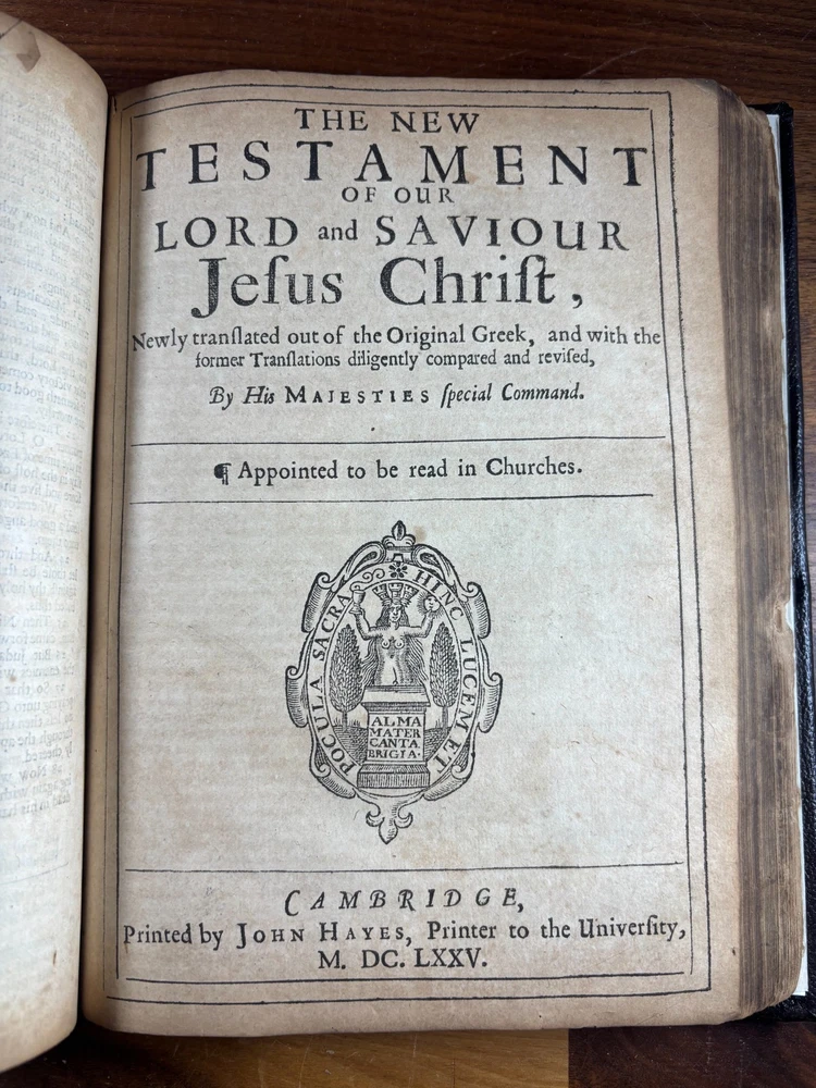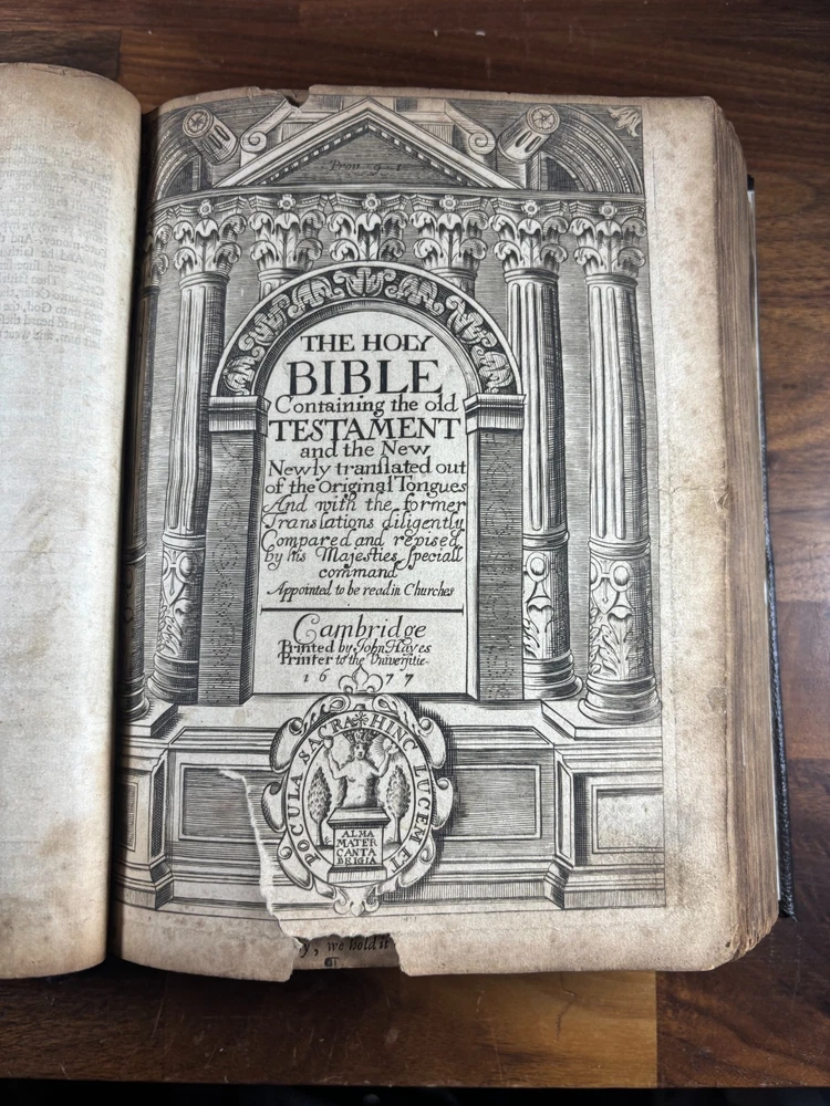 1677 Cambridge Quarto Bible – Printed by John Hayes Short Description: Complete with Book of Common Prayer, Old Testament (1675), Apocrypha, New Testament (1675), and Psalms (1677) This is an authentic 17th-century King James Version Bible , printed at the University of Cambridge during the Restoration period. It features the desirable engraved architectural general title dated 1677 , and includes the Old Testament, Apocrypha, New Testament, the Book of Common Prayer , and the Whole Book of Psalms. This edition is identified in the standard bibliographic references as: Herbert 736 Darlow & Moule 581 A complete and historically significant example of a Cambridge “service-book Bible” of the late 1600s. Bibliographic Details Title: The Holy Bible, Containing the Old Testament and the New Printer: John Hayes, Printer to the University of Cambridge Contents : Book of Common Prayer Old Testament (Dated 1675) Apocrypha New Testament (Dated 1675 ) Whole Book of Psalms (title page dated 1677 ) Engraved architectural general title: Present but with loss to upper portion Text: Roman type, two-column format Condition: Binding: New binding (Tape? mark on front cover). Title pages BCP - no, OT - yes, NT - yes, BoPs - yes (Please see photos for condition). Text block generally clean and legible, foxing and staining can be found. Some pages have chips and have been shaved. No red ruling. First 4 leaves have had page repairs done to them. Small inscription on the back of the NT title leaf: "John Brooks Ash Burton Cumbria 1824" A solid and representative example of a Cambridge Bible printed under John Hayes. Historical Background of This Bible: This Bible was printed during the reign of King Charles II (1660–1685), a period known as the Restoration . The monarchy, the Church of England, and the universities were being re-established after the upheavals of the English Civil War and the Cromwellian Commonwealth. Key features of the period reflected in this Bible: Reaffirmation of the Church of England: Cambridge and Oxford played central roles in restoring Anglican liturgy. At this time, printers often issued Bibles bound with the Book of Common Prayer and the Psalms , creating complete service books like this one. High demand for Bibles: Literacy and private devotional reading increased significantly during the 17th century. Cambridge responded by expanding Bible production. Stability under the KJV: By the 1670s, the King James Version (first printed in 1611) had become the undisputed English Bible. Every official church Bible, like this one, used the KJV. Your Bible is a tangible witness to this influential period in English religious and political history. I mention the term "service bible" here is who may have owned these kind of bibles: 🧎♂️ Who typically owned a “service-book Bible”? Not common labourers or peasants. These were for: Clergy - Rectors, curates, deacons, schoolmasters anyone officiating in Anglican services. Churchwardens and parish officers - Parish churches often purchased these to keep in the vestry. Educated or well-off families - Gentry, prosperous tradesmen, merchants, and professionals. Private households wanting the full worship cycle - A literate family might have only one book that did everything: prayers, readings, psalms. Students and Scholars - People (Especially important to those living in and around the area of Cambridge University) who need complete texts to reference to in their studies. About the Printer: John Hayes: John Hayes was one of the most important English university printers of the 17th century: Appointed Printer to the University of Cambridge in 1673. Oversaw an era of major expansion in Cambridge’s printing output, especially Bibles, Prayer Books, classical texts, and academic works. Was known for using clean, readable roman type , replacing earlier black-letter styles. Responsible for numerous editions of the King James Bible between 1673 and 1700. Often issued engraved architectural title pages , including the one found in this Bible. Hayes’ Bibles are admired for their clarity, classic layout, and steady craftsmanship. Dimensions: Weight - 1.87KG Height - 23cm Width - 17.5cm Thickness - 6.5cm