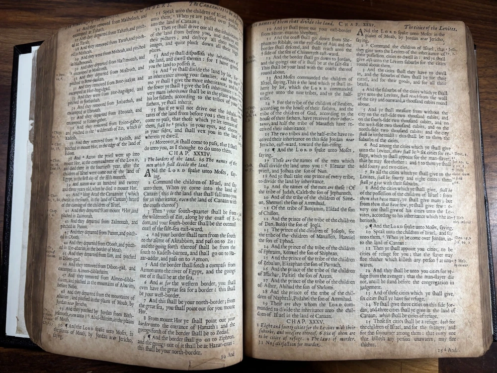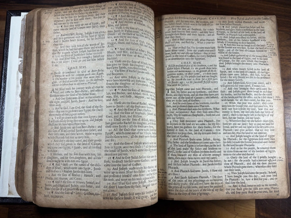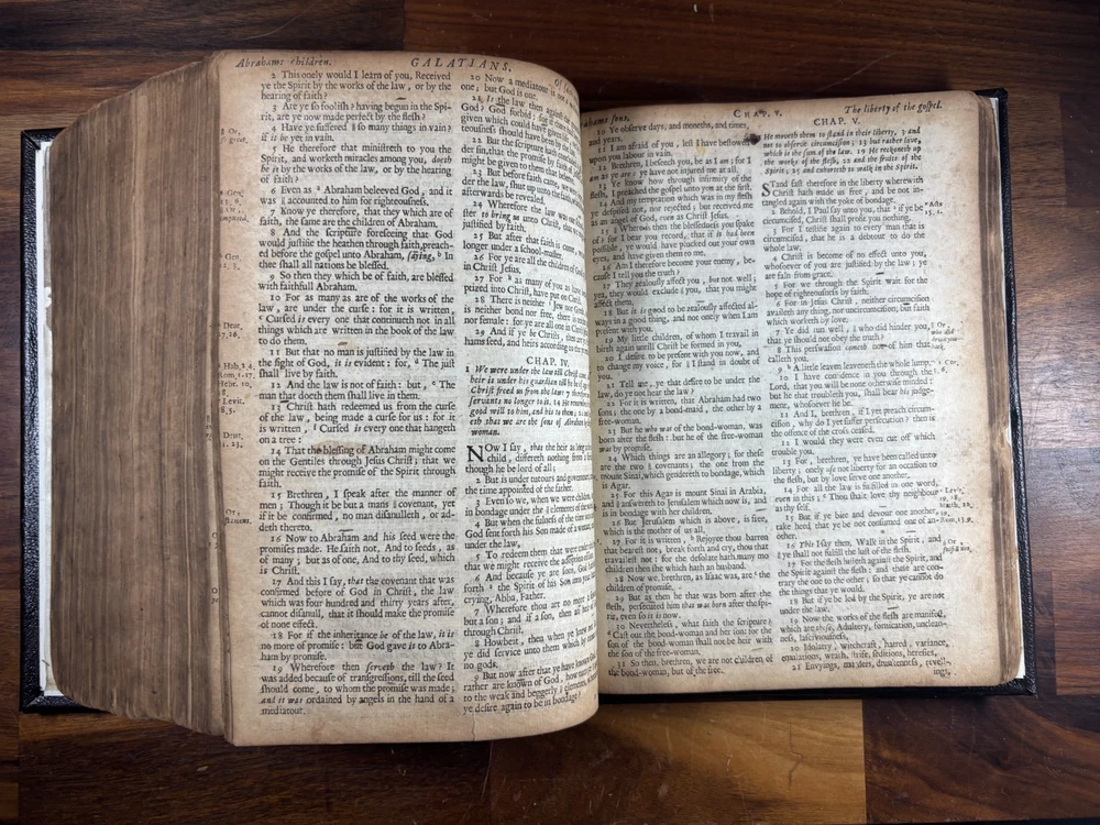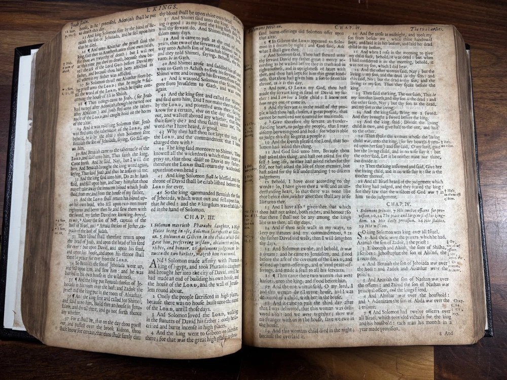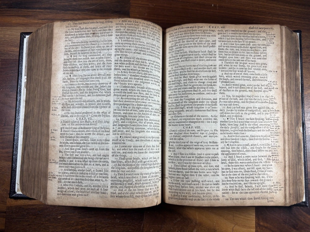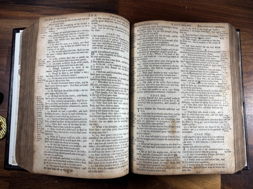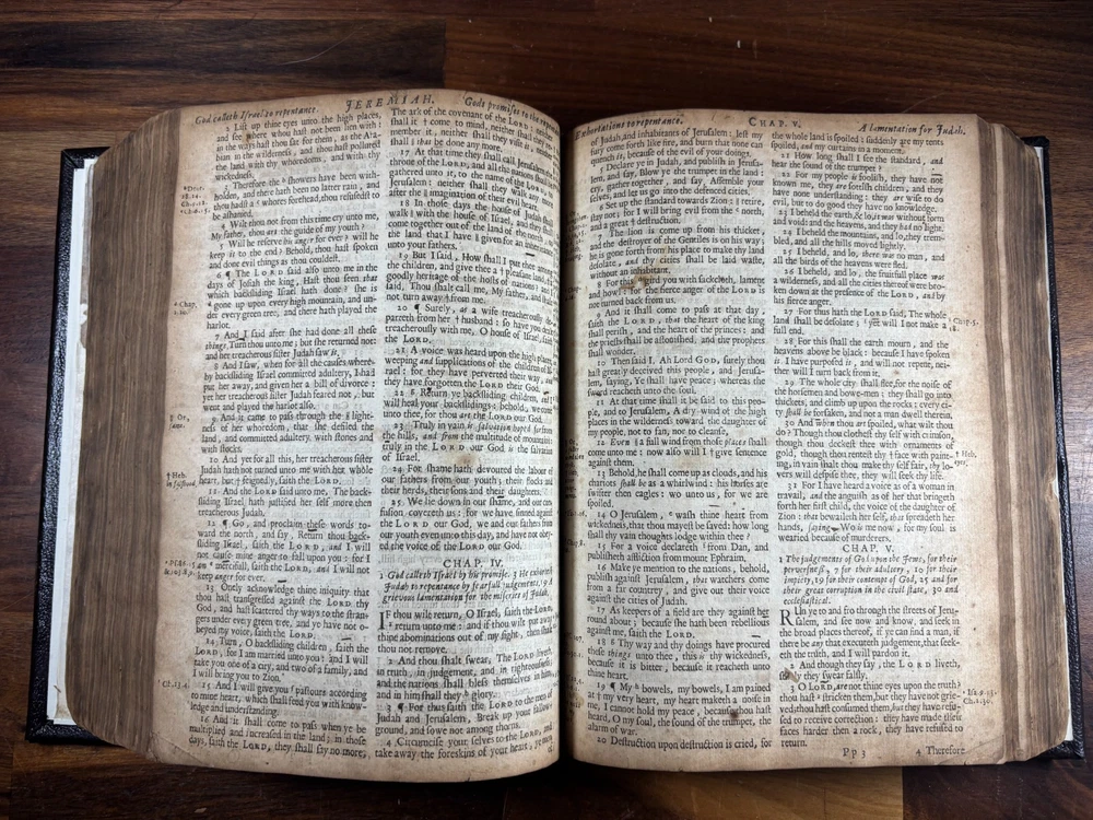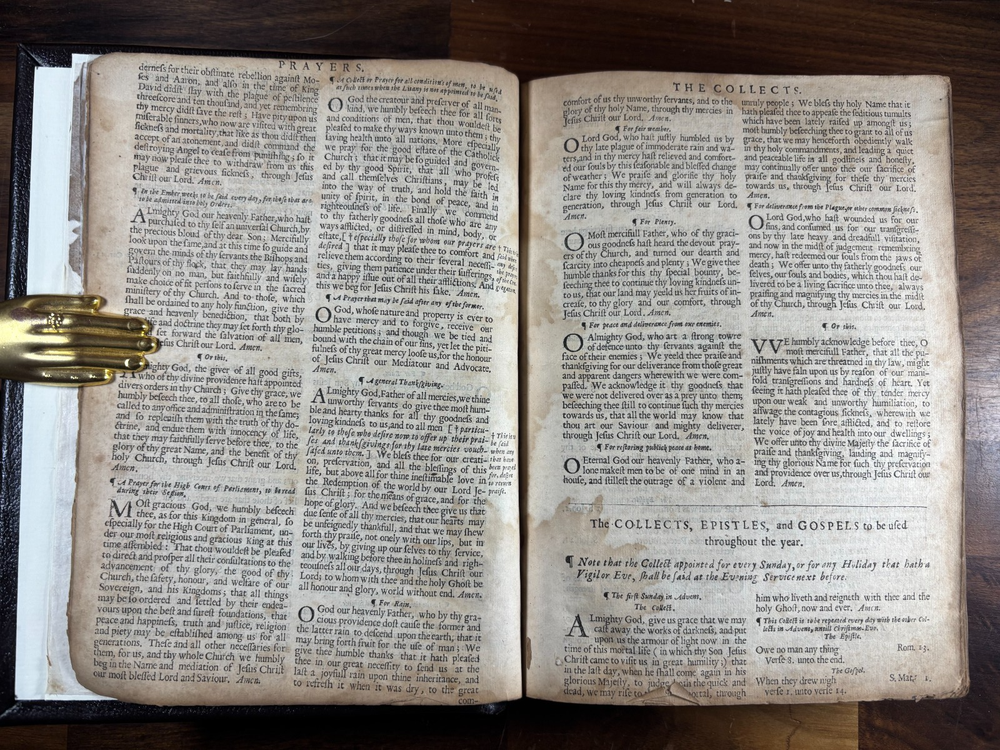 1677 Cambridge Quarto Bible – Printed by John Hayes Short Description: Complete with Book of Common Prayer, Old Testament (1675), Apocrypha, New Testament (1675), and Psalms (1677) This is an authentic 17th-century King James Version Bible , printed at the University of Cambridge during the Restoration period. It features the desirable engraved architectural general title dated 1677 , and includes the Old Testament, Apocrypha, New Testament, the Book of Common Prayer , and the Whole Book of Psalms. This edition is identified in the standard bibliographic references as: Herbert 736 Darlow & Moule 581 A complete and historically significant example of a Cambridge “service-book Bible” of the late 1600s. Bibliographic Details Title: The Holy Bible, Containing the Old Testament and the New Printer: John Hayes, Printer to the University of Cambridge Contents : Book of Common Prayer Old Testament (Dated 1675) Apocrypha New Testament (Dated 1675 ) Whole Book of Psalms (title page dated 1677 ) Engraved architectural general title: Present but with loss to upper portion Text: Roman type, two-column format Condition: Binding: New binding (Tape? mark on front cover). Title pages BCP - no, OT - yes, NT - yes, BoPs - yes (Please see photos for condition). Text block generally clean and legible, foxing and staining can be found. Some pages have chips and have been shaved. No red ruling. First 4 leaves have had page repairs done to them. Small inscription on the back of the NT title leaf: "John Brooks Ash Burton Cumbria 1824" A solid and representative example of a Cambridge Bible printed under John Hayes. Historical Background of This Bible: This Bible was printed during the reign of King Charles II (1660–1685), a period known as the Restoration . The monarchy, the Church of England, and the universities were being re-established after the upheavals of the English Civil War and the Cromwellian Commonwealth. Key features of the period reflected in this Bible: Reaffirmation of the Church of England: Cambridge and Oxford played central roles in restoring Anglican liturgy. At this time, printers often issued Bibles bound with the Book of Common Prayer and the Psalms , creating complete service books like this one. High demand for Bibles: Literacy and private devotional reading increased significantly during the 17th century. Cambridge responded by expanding Bible production. Stability under the KJV: By the 1670s, the King James Version (first printed in 1611) had become the undisputed English Bible. Every official church Bible, like this one, used the KJV. Your Bible is a tangible witness to this influential period in English religious and political history. I mention the term "service bible" here is who may have owned these kind of bibles: 🧎♂️ Who typically owned a “service-book Bible”? Not common labourers or peasants. These were for: Clergy - Rectors, curates, deacons, schoolmasters anyone officiating in Anglican services. Churchwardens and parish officers - Parish churches often purchased these to keep in the vestry. Educated or well-off families - Gentry, prosperous tradesmen, merchants, and professionals. Private households wanting the full worship cycle - A literate family might have only one book that did everything: prayers, readings, psalms. Students and Scholars - People (Especially important to those living in and around the area of Cambridge University) who need complete texts to reference to in their studies. About the Printer: John Hayes: John Hayes was one of the most important English university printers of the 17th century: Appointed Printer to the University of Cambridge in 1673. Oversaw an era of major expansion in Cambridge’s printing output, especially Bibles, Prayer Books, classical texts, and academic works. Was known for using clean, readable roman type , replacing earlier black-letter styles. Responsible for numerous editions of the King James Bible between 1673 and 1700. Often issued engraved architectural title pages , including the one found in this Bible. Hayes’ Bibles are admired for their clarity, classic layout, and steady craftsmanship. Dimensions: Weight - 1.87KG Height - 23cm Width - 17.5cm Thickness - 6.5cm